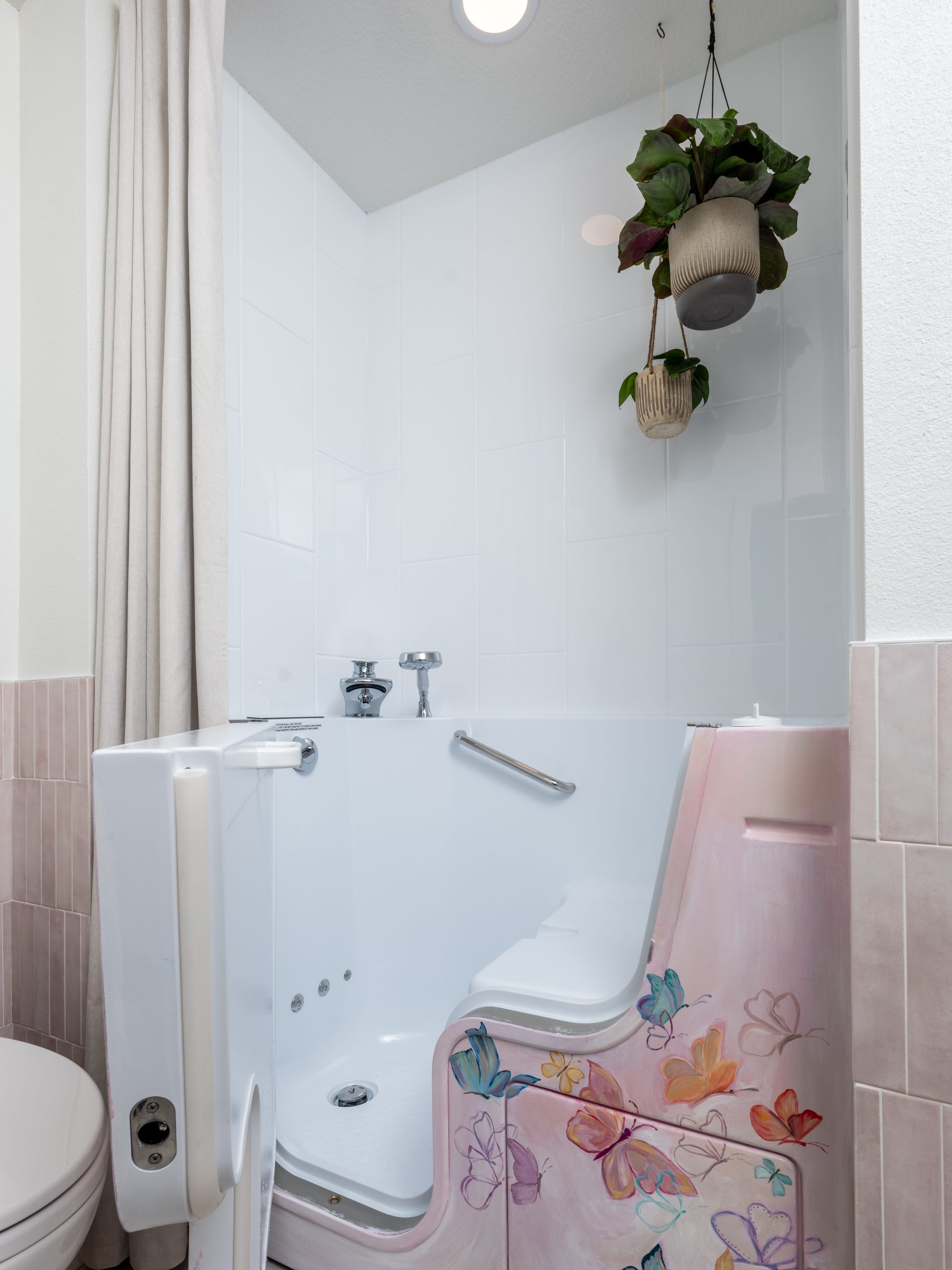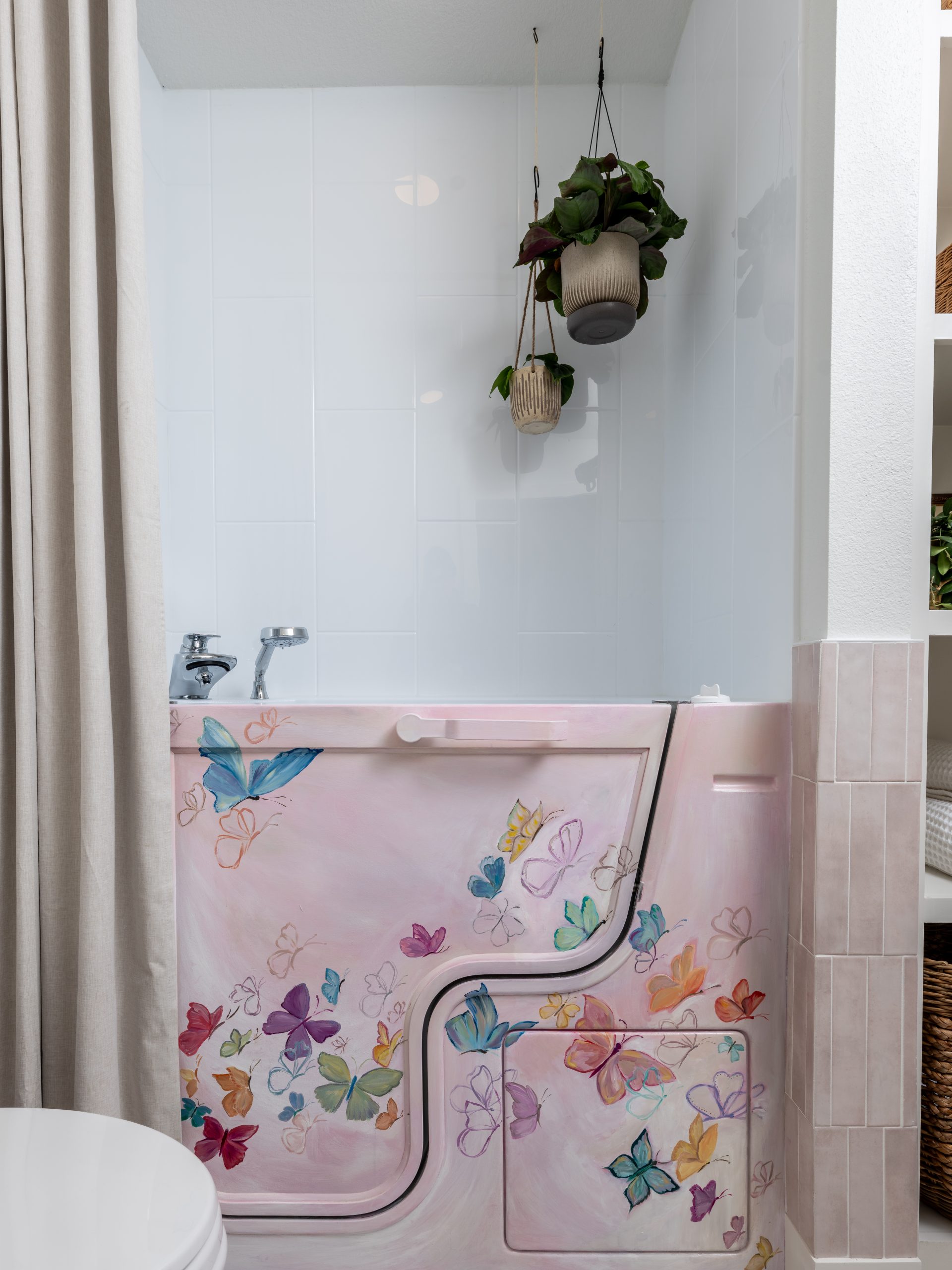 This bathroom was very dated and not functional for Caroline, who needs more space and an accessible bathtub. I made a visit to one of our plumbing suppliers to pick out a walk-in shower and bathtub combo, and while I was there, I came across a fun hand-painted bathtub, which sparked an idea for a special project. The same artist, Nicole Hardeman, who painted the bathtub in the showroom, made a trip out to the Lundeens’ home to hand-paint dainty butterflies, creating a beautiful mural on Caroline’s tub. For the rest of the bathroom, we incorporated a classic marble floor tile and soft hues of pink and cream on the walls to play off the bathtub’s colors.