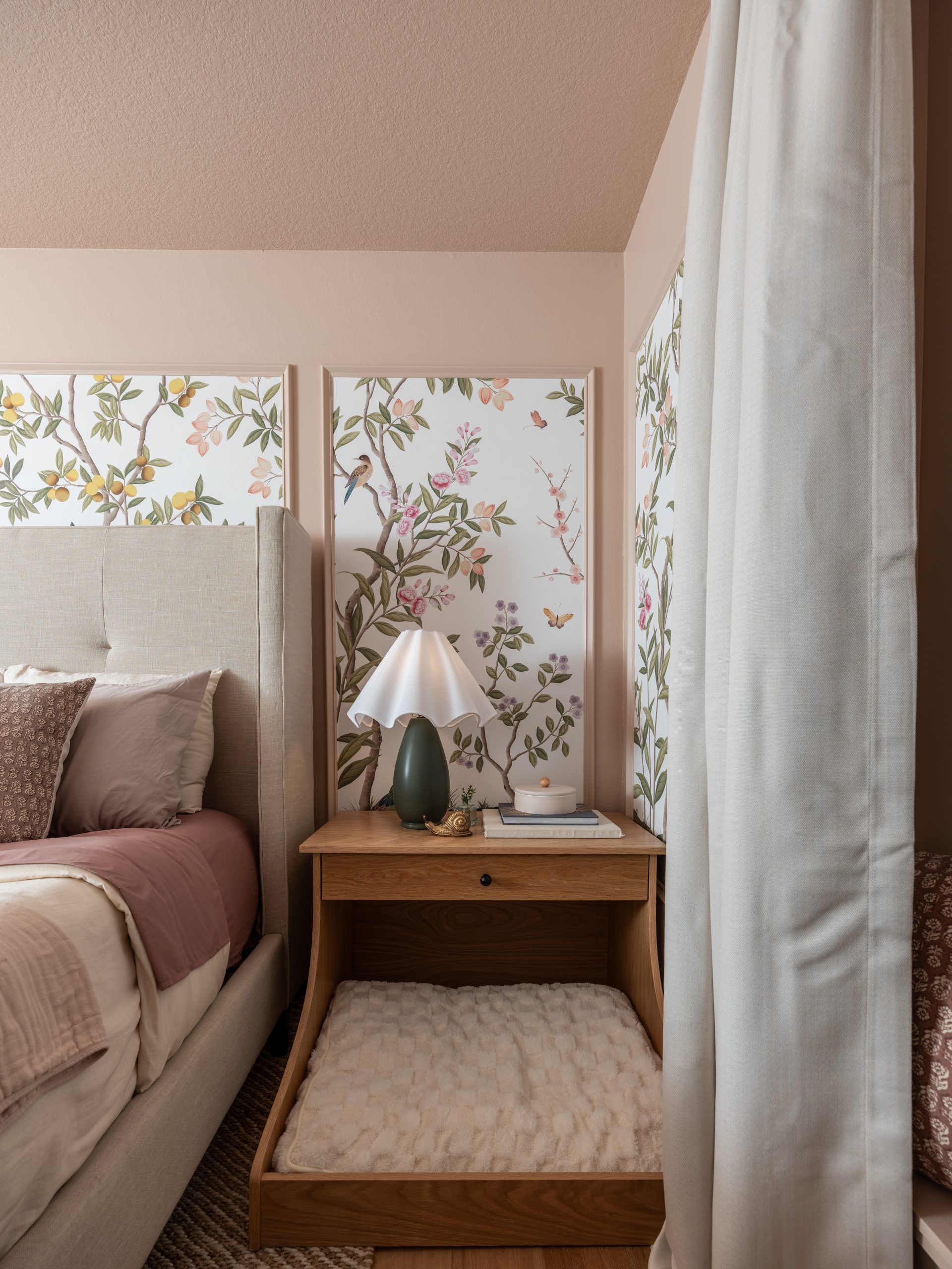 This turned out to be my favorite room in the house! Caroline loves butterflies, and they have a special meaning for the Lundeens. When Caroline was very small, butterflies reminded Jennifer of her sweet baby—beautiful and delicate. I love how we were able to incorporate this sentiment and add whimsy to her space by installing a beautiful, grown-up wallpaper centered in custom trim that frames it in sections, making the wallpaper look more like wall art.