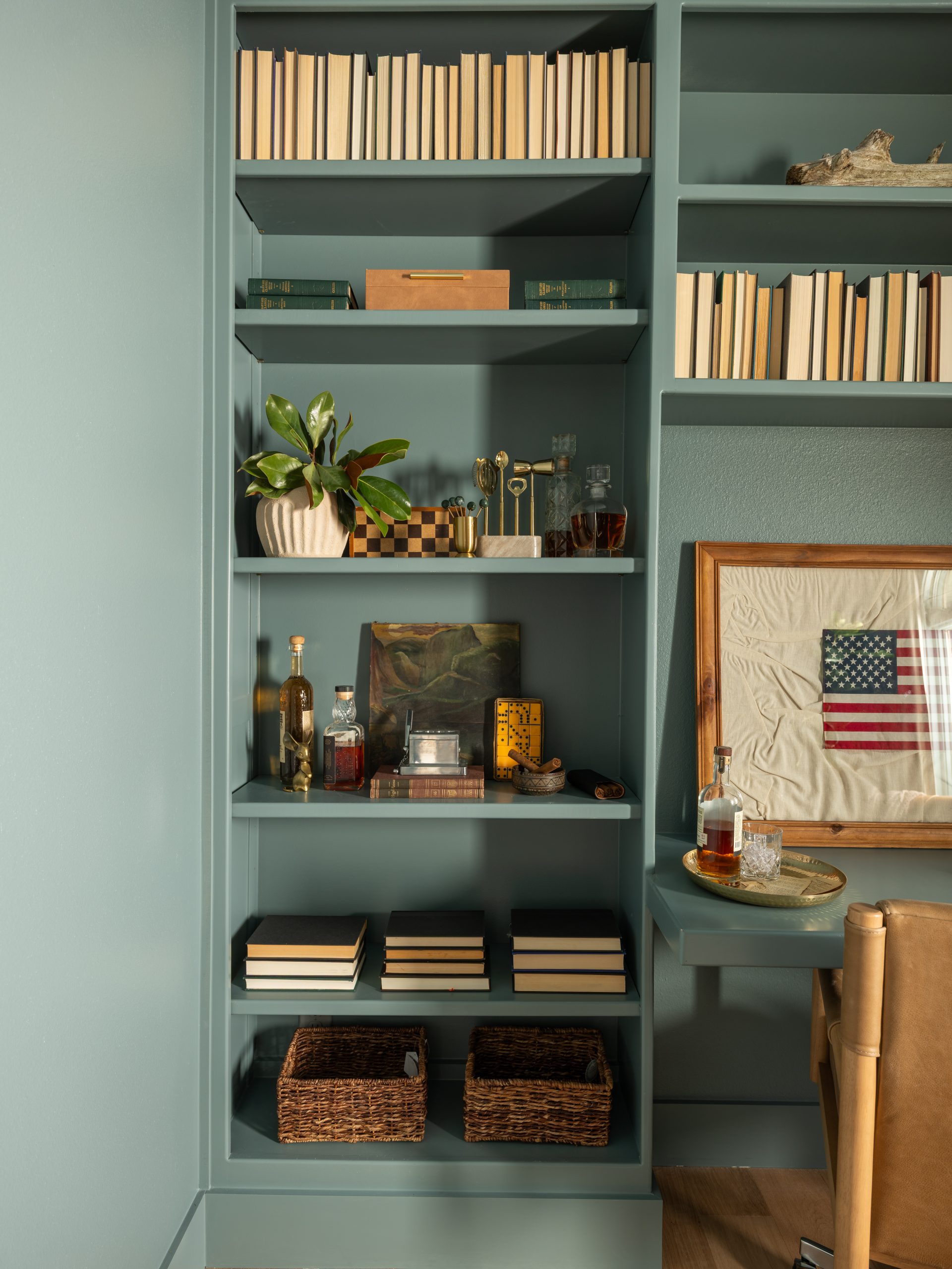 The office is the first space you see when you walk in the front door. This space was important to Larry because it had a large bookcase that was full of memorabilia from his time spent serving in the Secret Service during 9/11. The Lundeens wanted to give up some of the room’s square footage in order to make Caroline’s room bigger on the other side. This meant taking apart the current bookcase and thinking strategically about how to give him back shelving while making room for his desk and the lounging area he wanted. We were able to salvage some of the original bookcase by shifting it to the sides and saving space by building a desk into the center of the renovated bookshelf. This gave us room on the other side of the office to add two comfy lounge chairs. We finished it off with French doors and a rich blue paint on both the walls and ceiling, giving the space a cozy, sophisticated feel.