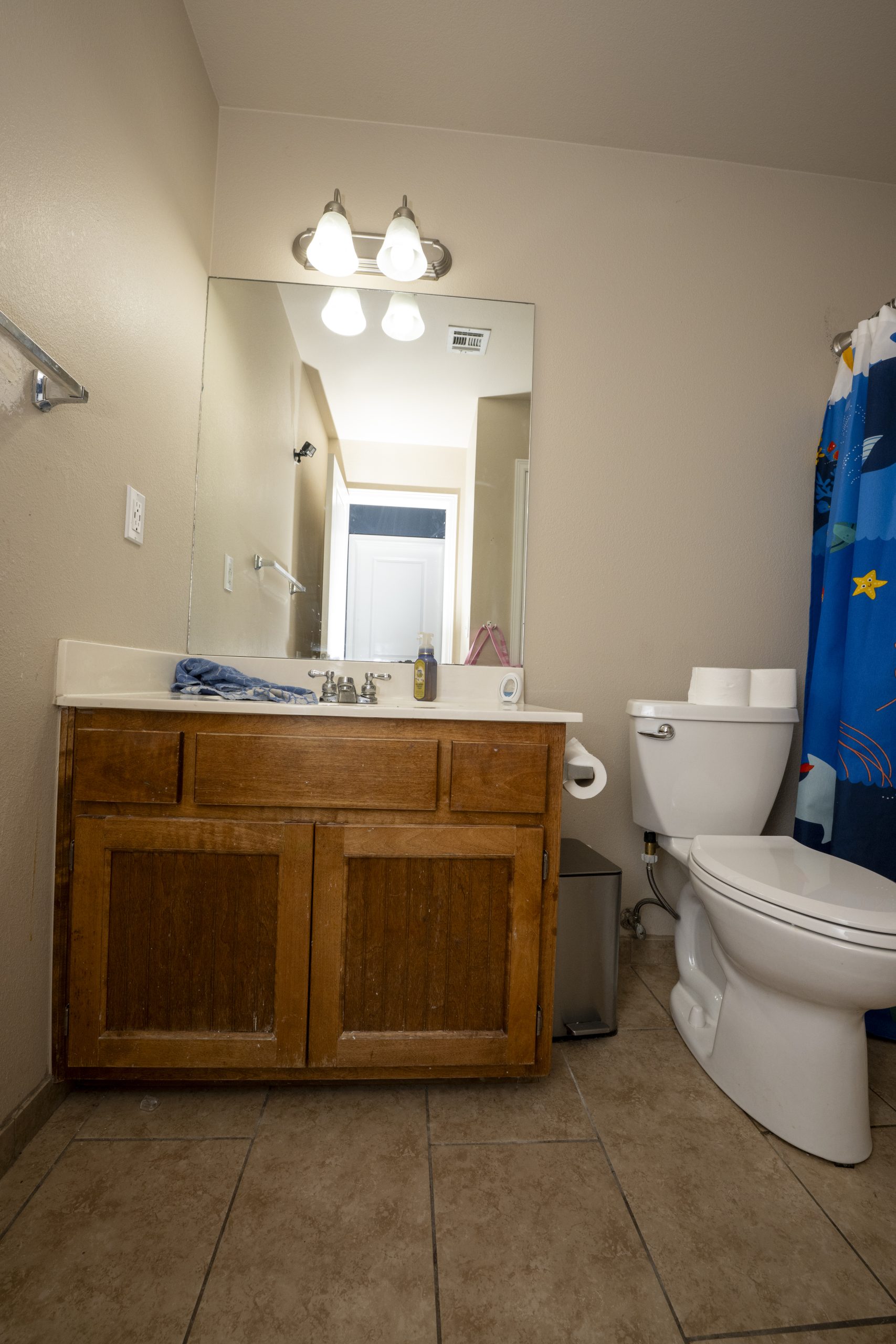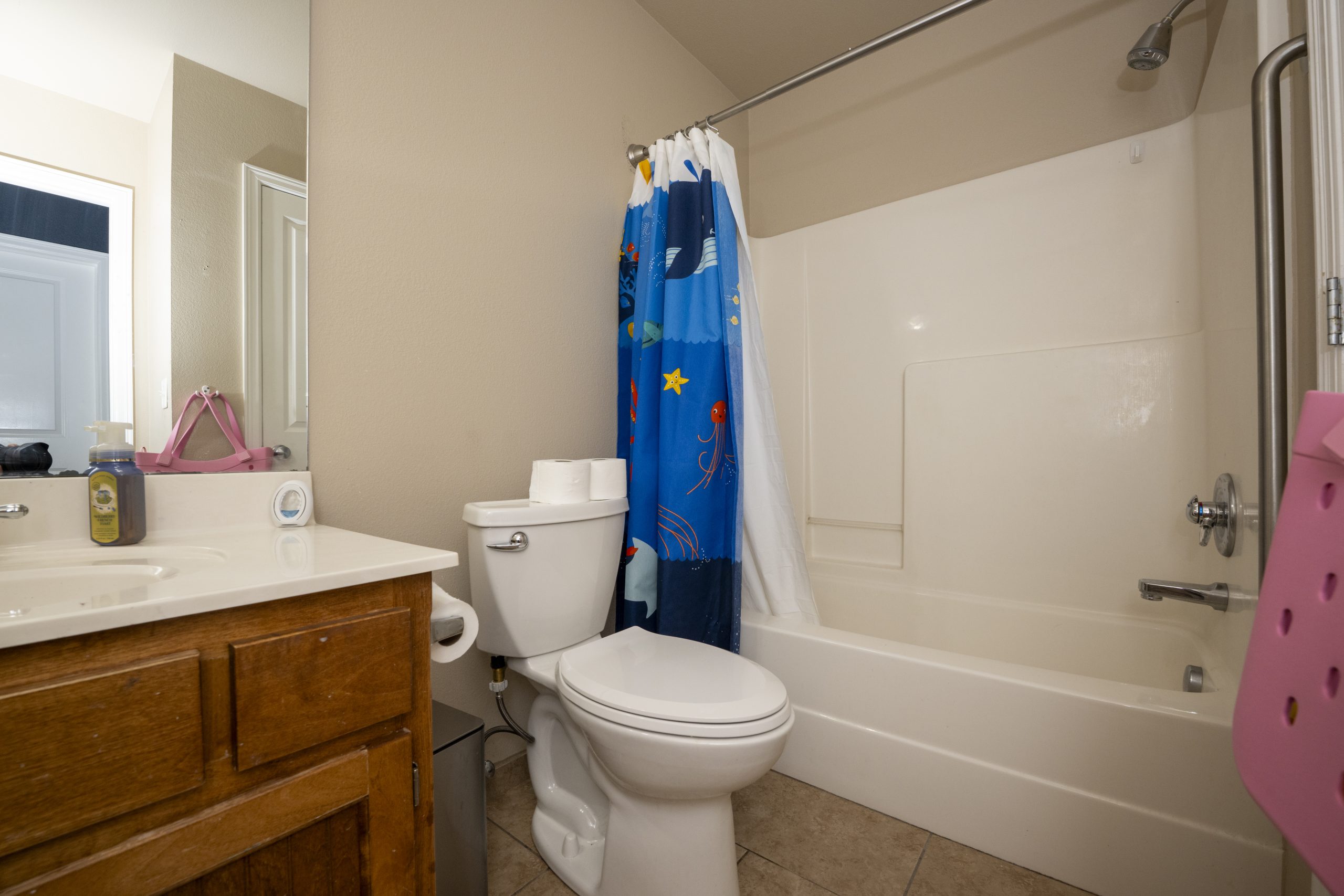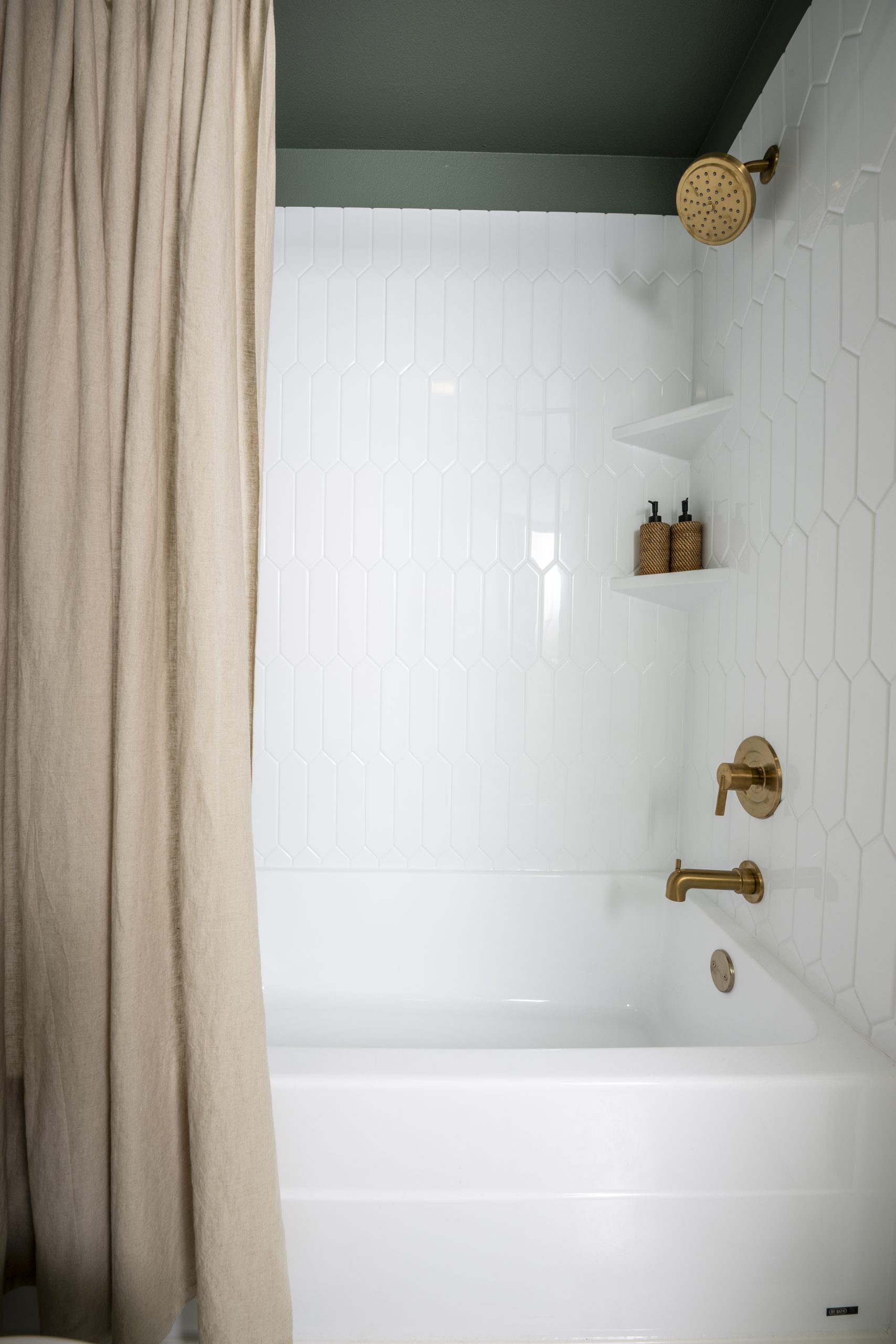 This small bathroom does a lot of heavy lifting, so we wanted to give it an update that would make it look pretty while still allowing it to keep up with a family of four. We saved so much time by using Re-Bath. We’ve used this company before, and it’s such a great way to do a quick and inexpensive update. I’m so pleased with how this small space turned out. The green paint makes the white shower wall look even brighter and really lets the hardware pop. With the updated vanity, flooring, and lighting, this bathroom is so cute.