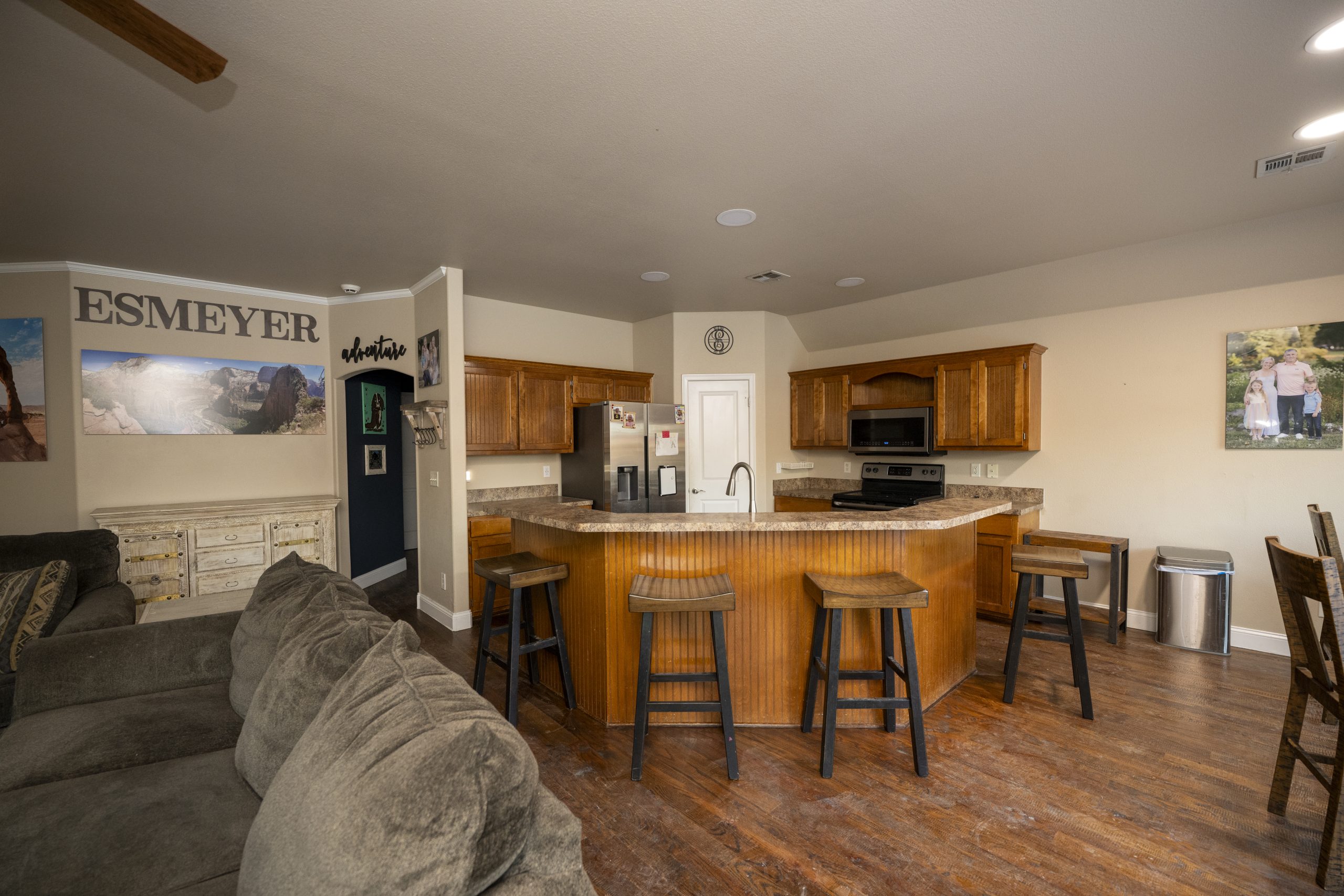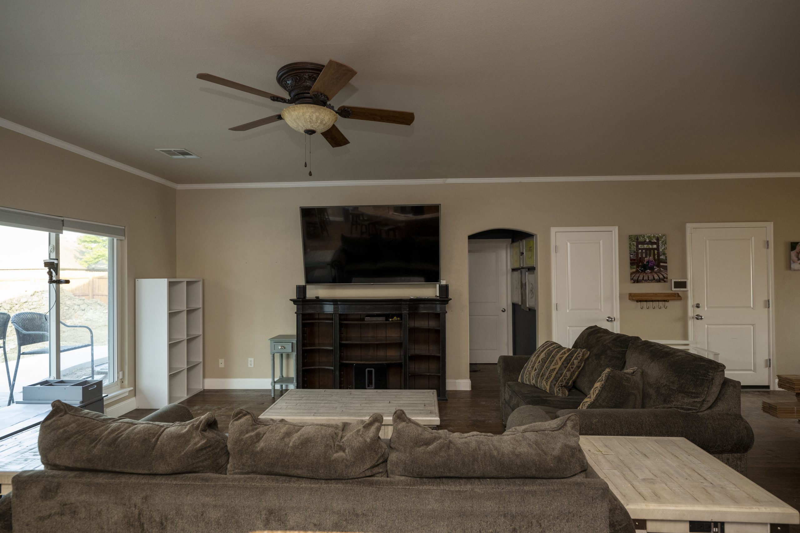 The floorplan of the living room didn’t change, but a few updates made a big difference and made it feel like a whole new space. We added a built-in to the far wall where the Esmeyers can put their TV while keeping the room looking updated, with decorative shelves on both sides. Dave and the guys made a special coffee table and matching side table with wooden interlocking pieces that pair perfectly with the cozy donated sofa. The space is finished off with painted walls and new window treatments that pull everything together.