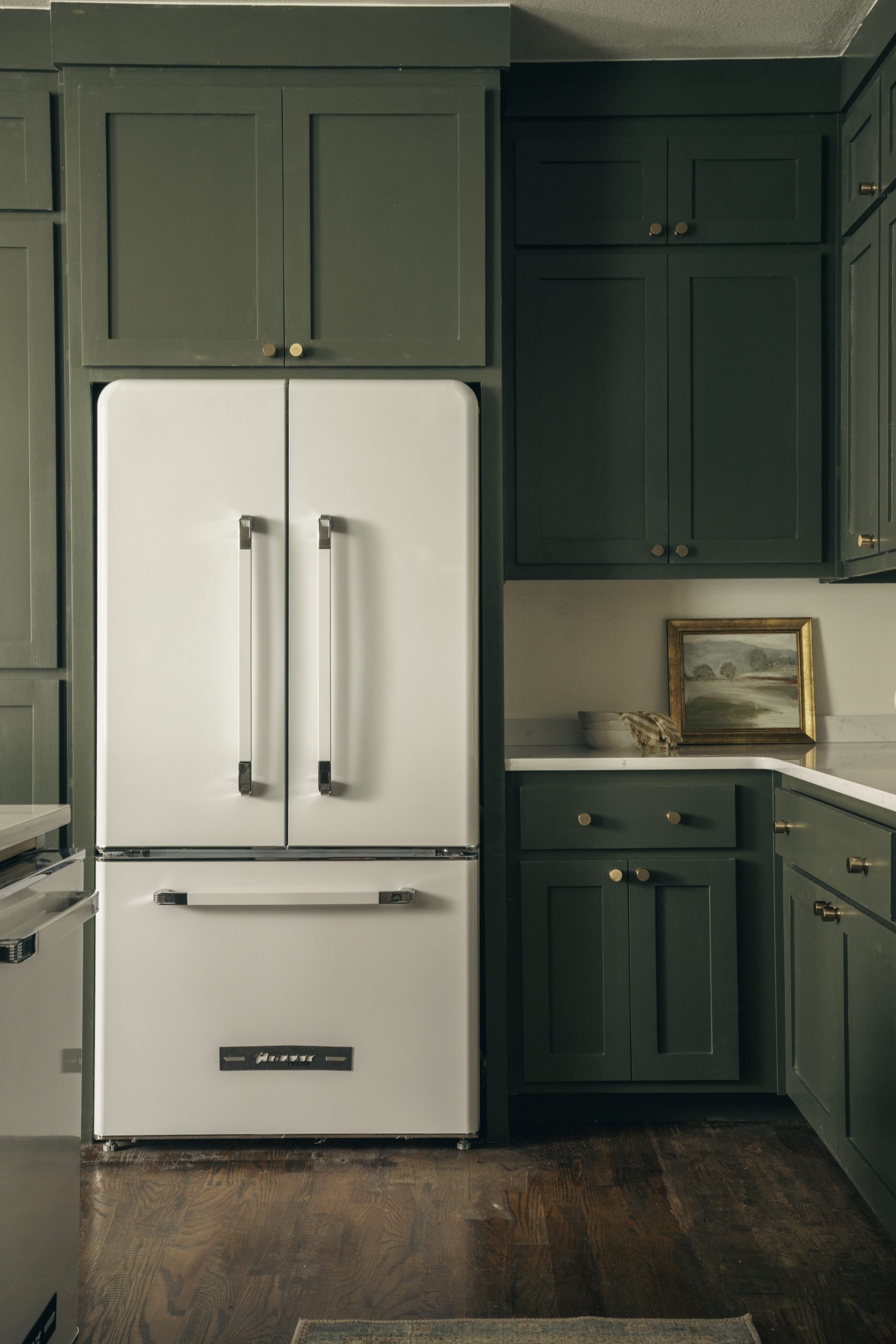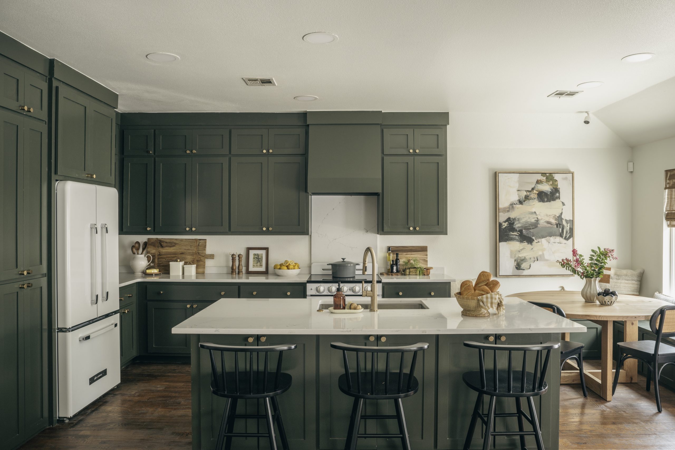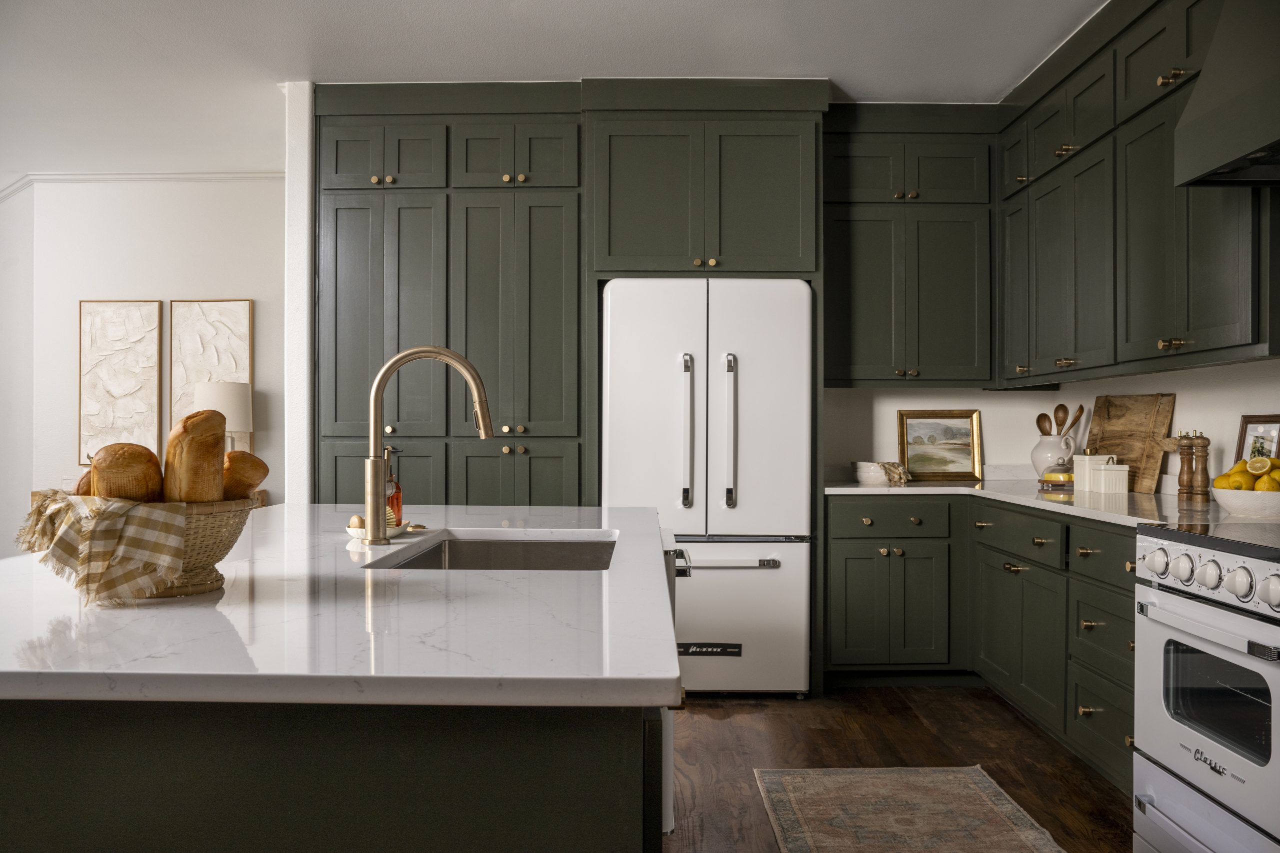 Our go-to cabinet maker, Chris, built and painted the cabinets at his shop in Arkansas. Thank you to our painters who stepped in to touch up the many, many areas where the paint was ruined on the drive over. The cabinets turned out beautiful, with their rich green color and modern gold knobs.