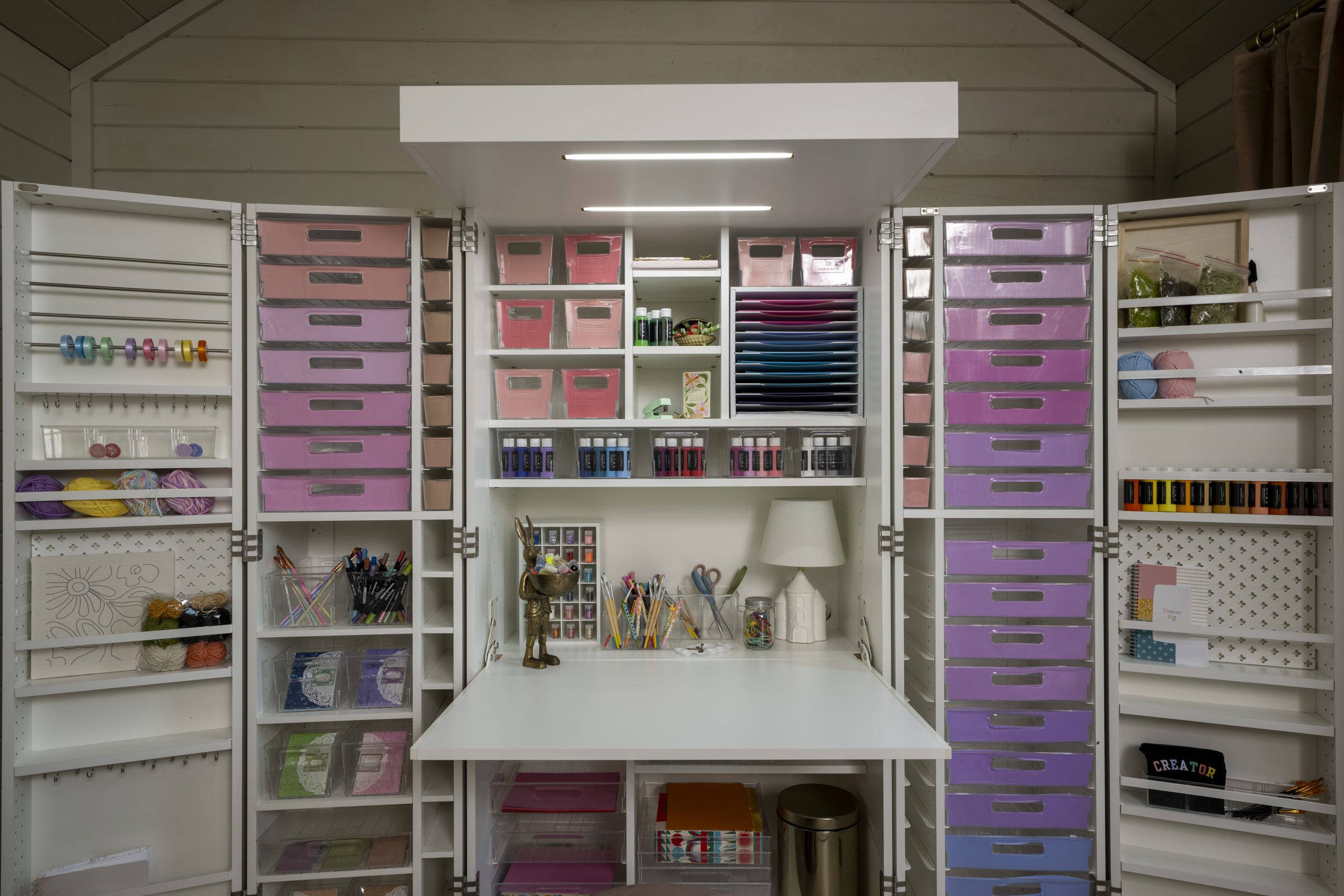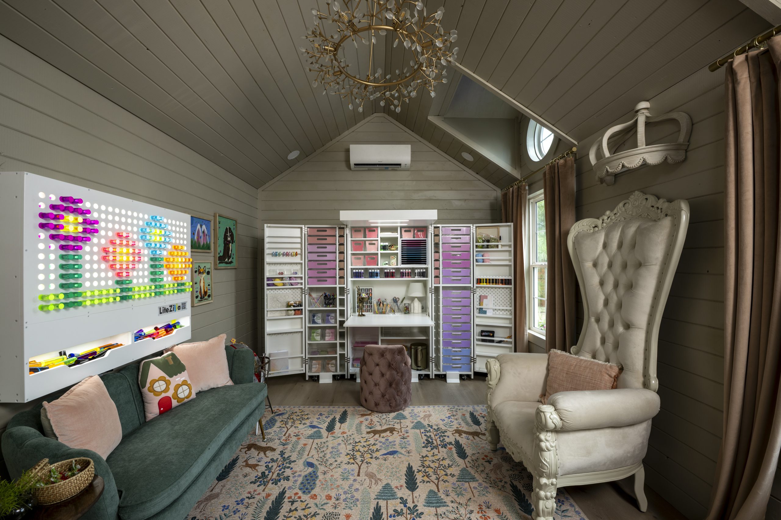 The inside of the playhouse turned out incredible. We leaned into a princess-inspired design with light-colored flooring and paneled walls, velvety pink curtains, and large white cabinets to hold art supplies, complete with a pull-down desk. A cozy couch and a large, comfy throne topped with a crown make the space feel extra special. Of course, we also framed and displayed a few of Teal’s original art pieces on the walls.