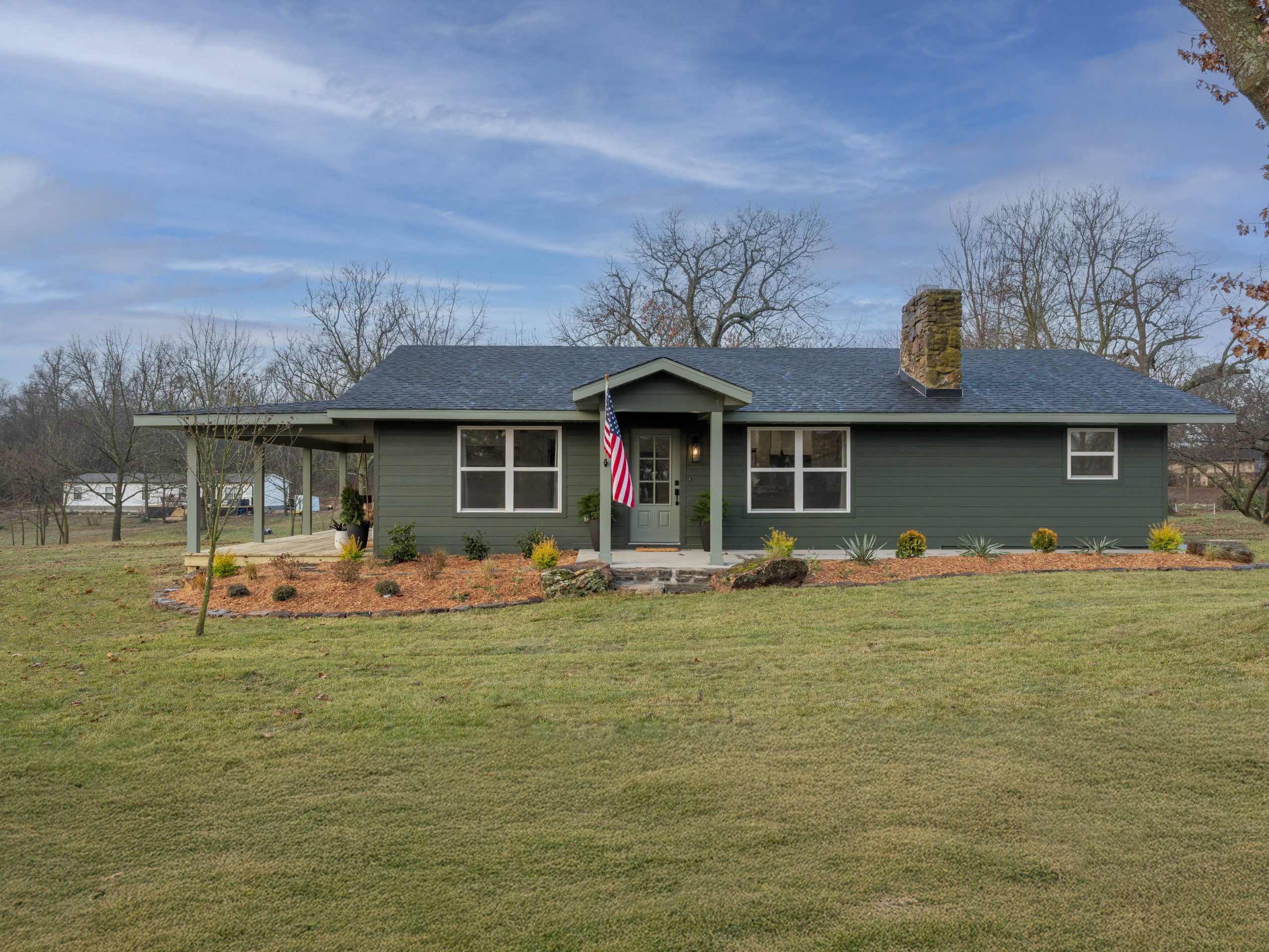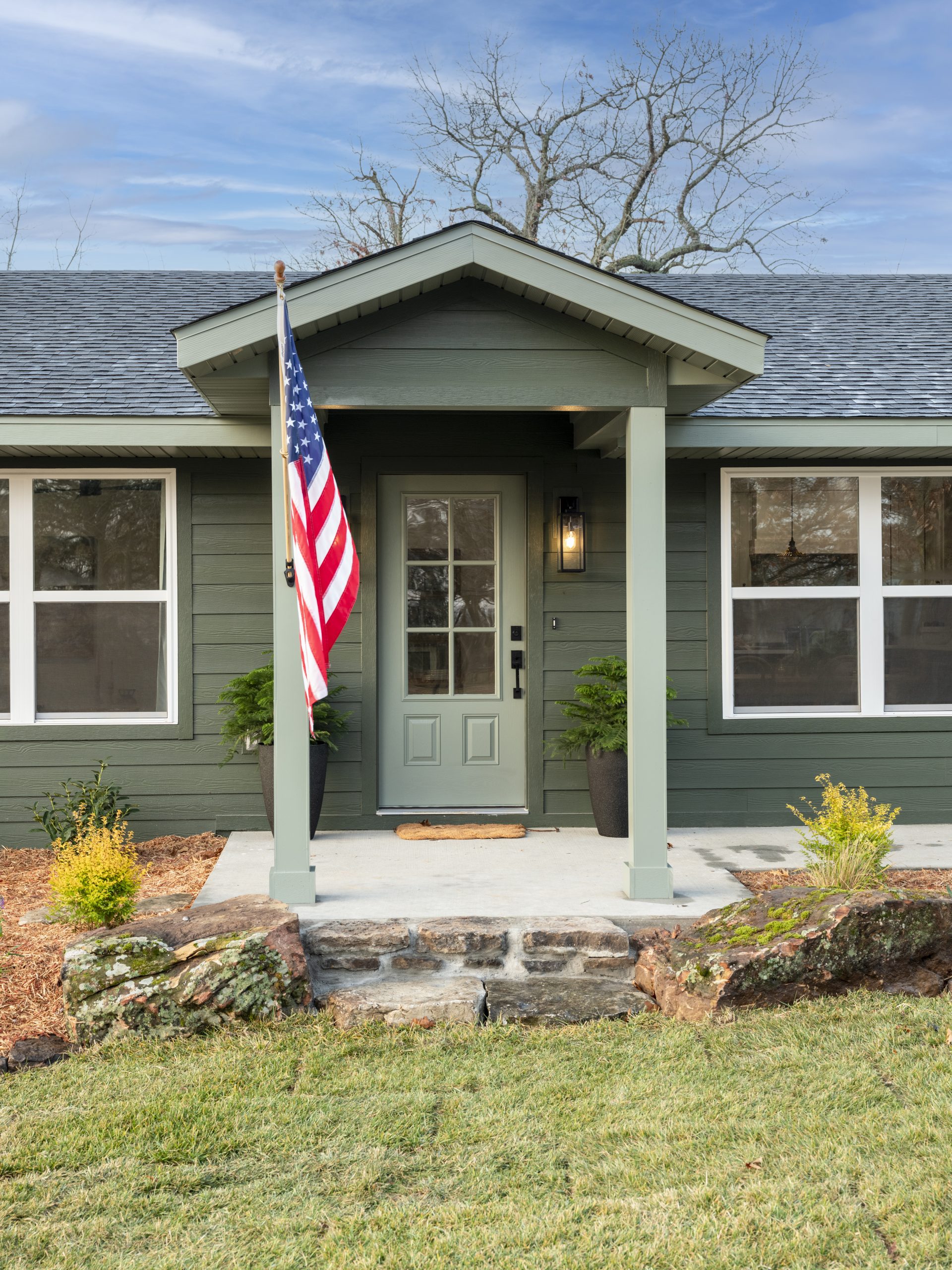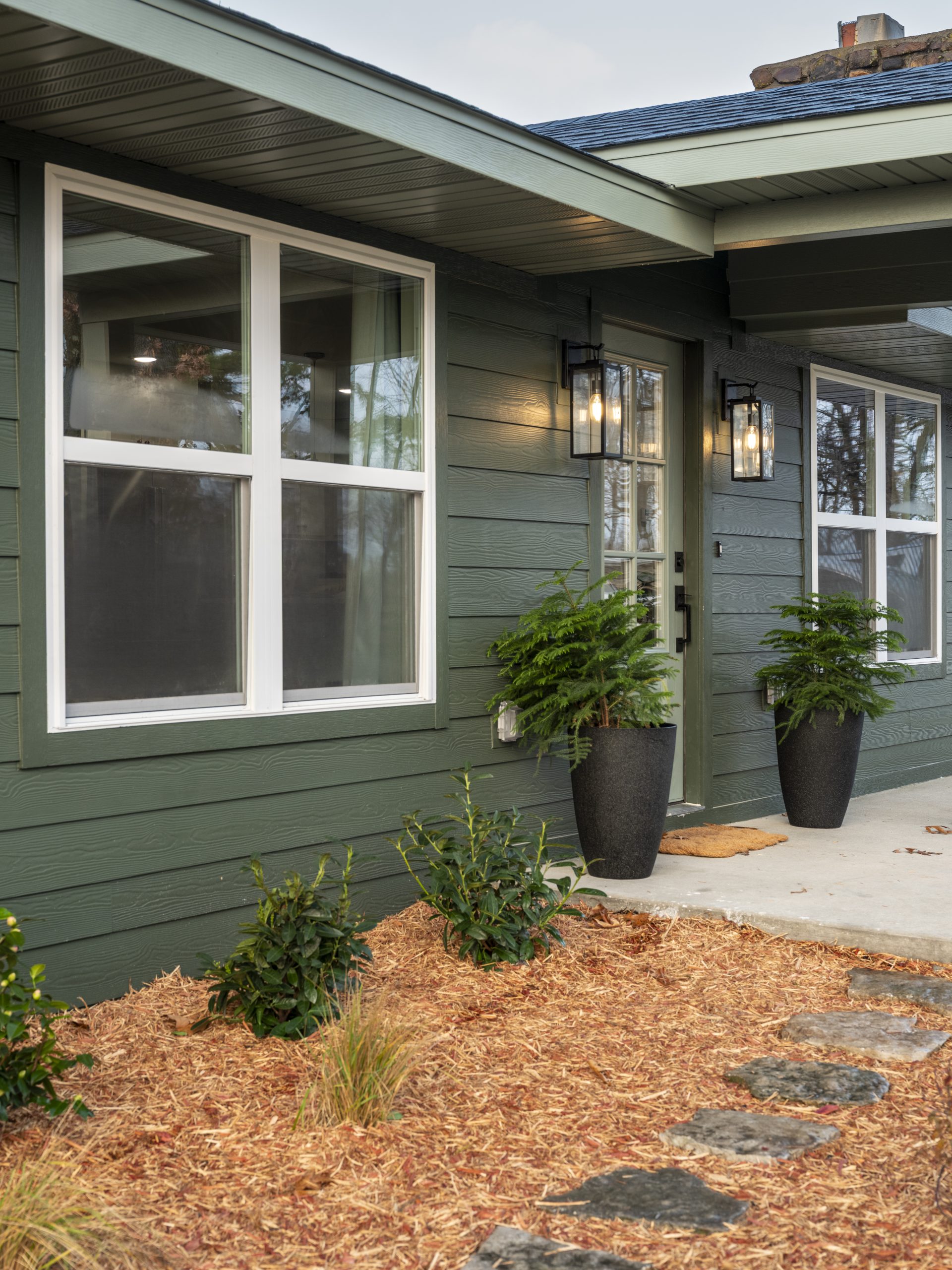 We moved the front door so it no longer opened into the kitchen, added a gable above it, installed all new windows, replaced the siding, extended the house into the covered carport, replaced the roof, freshened up the landscaping, and painted everything a gorgeous deep green that gives it the feel of a cozy cabin in the woods.