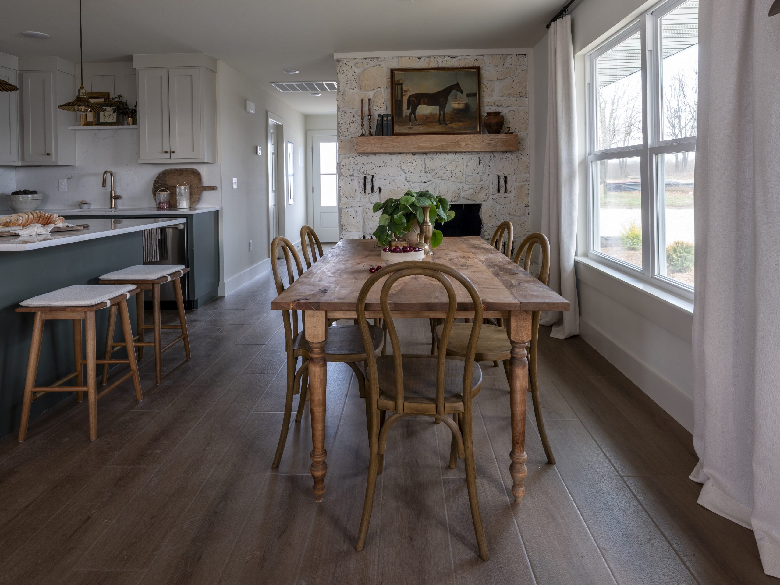 Dave built the dining table out of elm wood, and I absolutely love how it turned out. It’s the perfect size for the room, with that old-country charm that feels just right in this space.