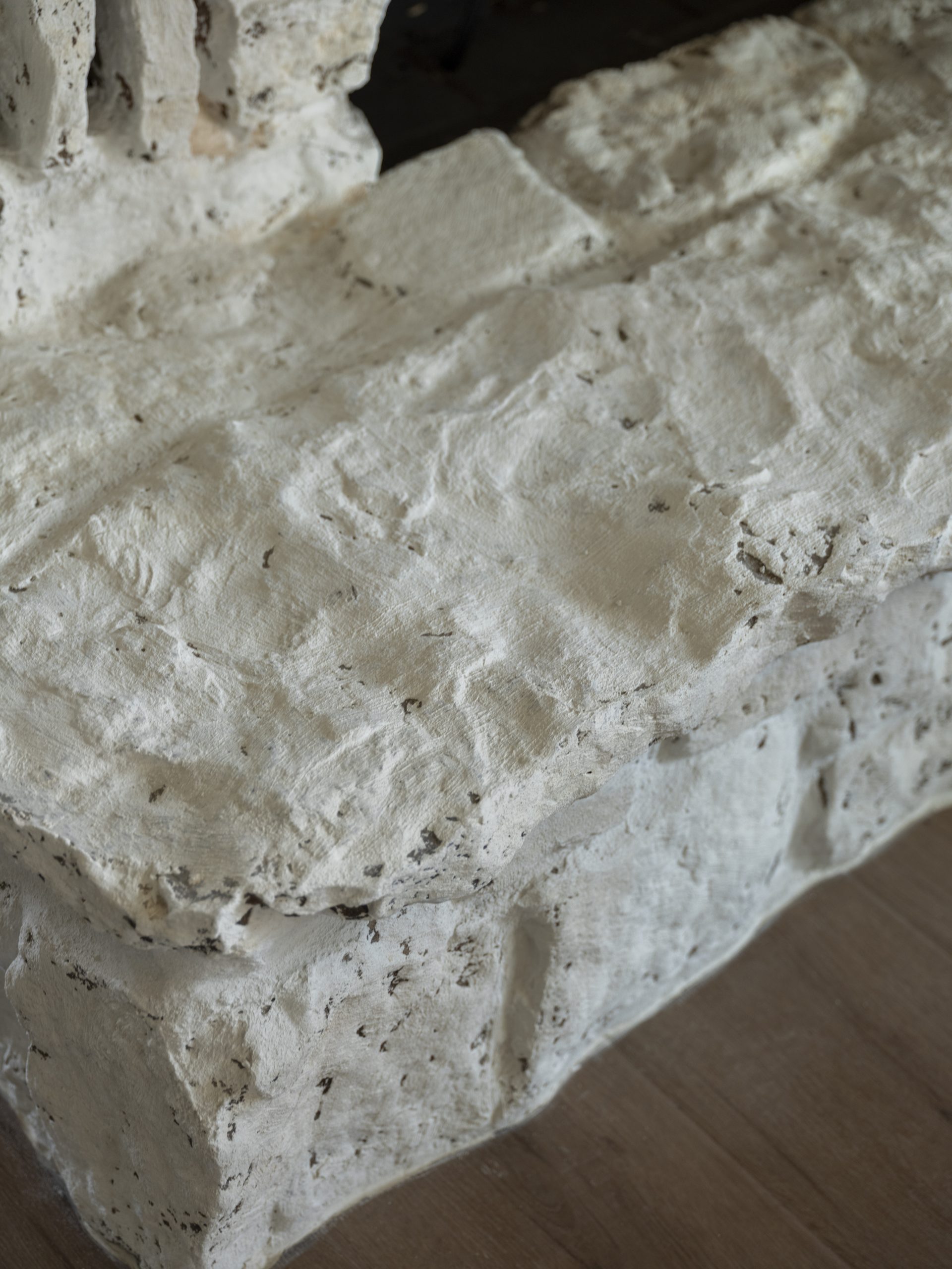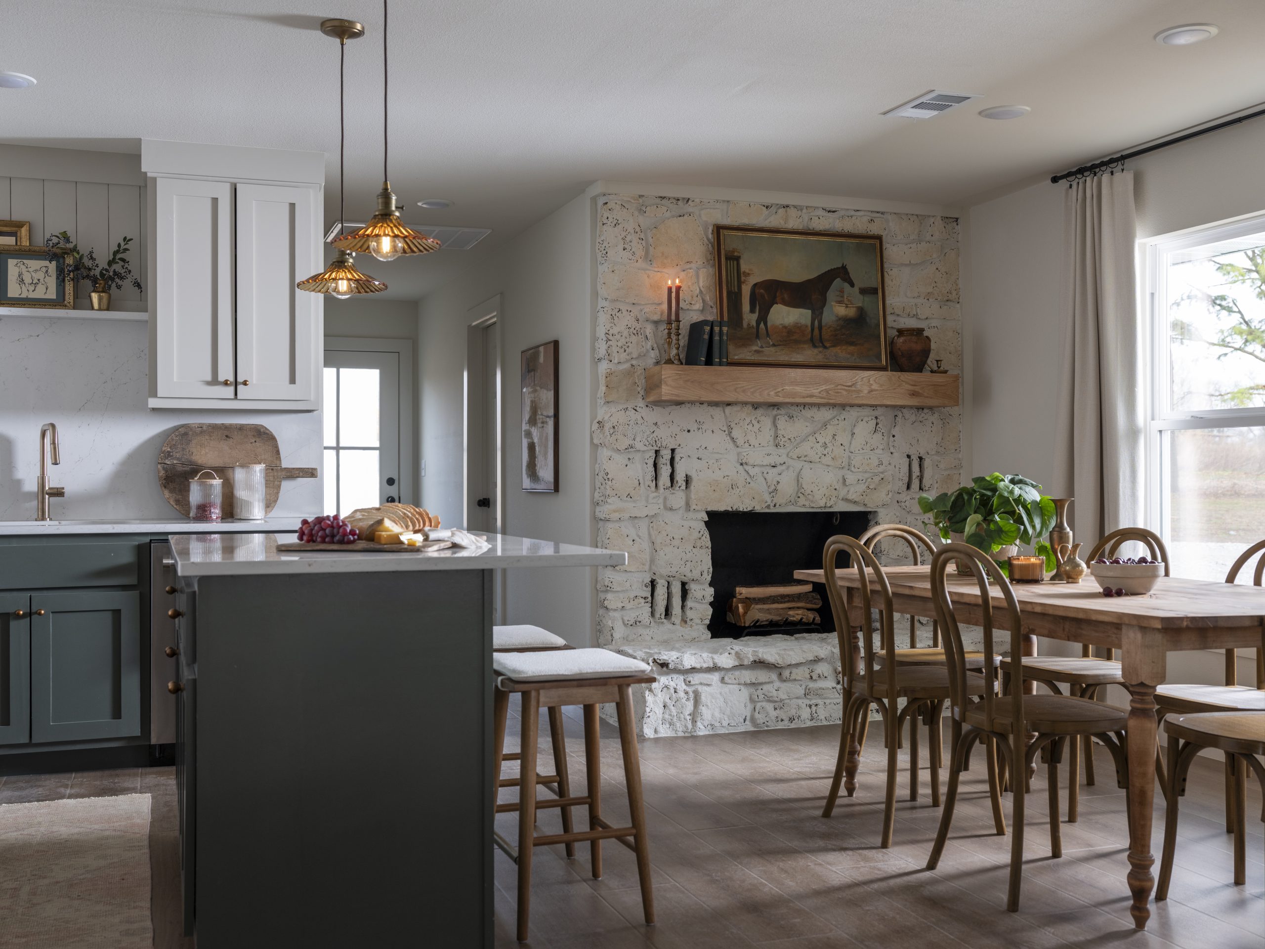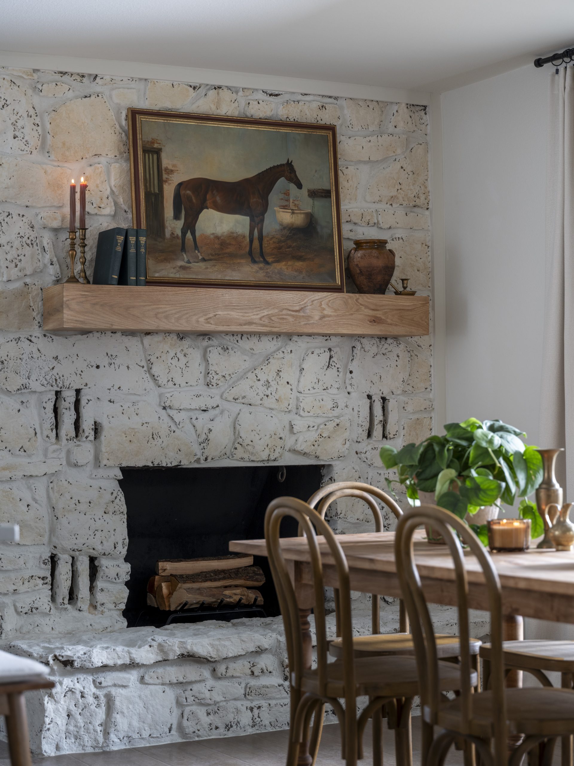 The Leggs wanted to keep the fireplace’s original stone, but it felt dark and the orange tones made the whole space feel dated. We filled in the mortar with a lighter shade, gave the stone a soft whitewash, and added a white oak mantel to brighten everything up while still keeping that nice texture.