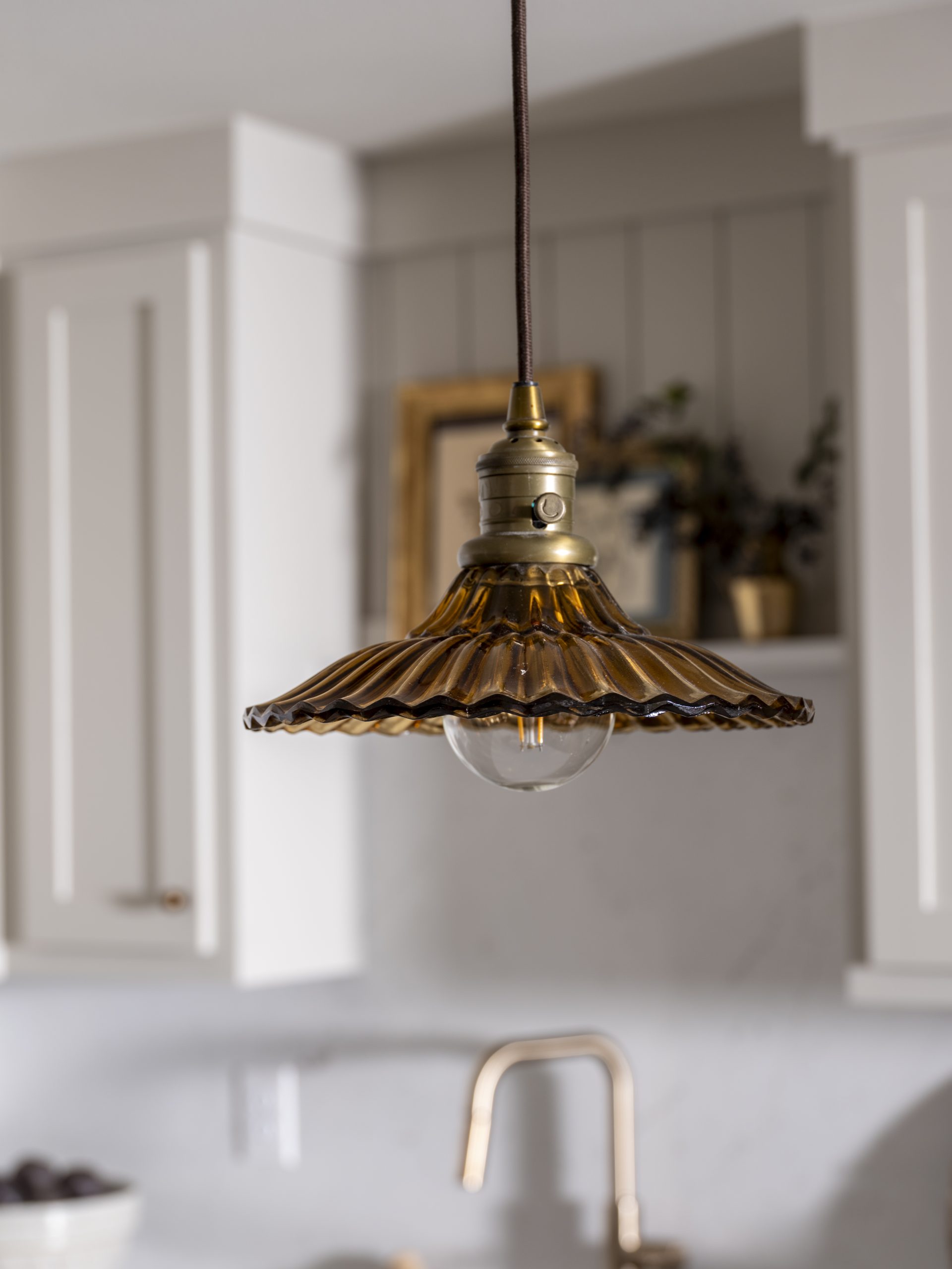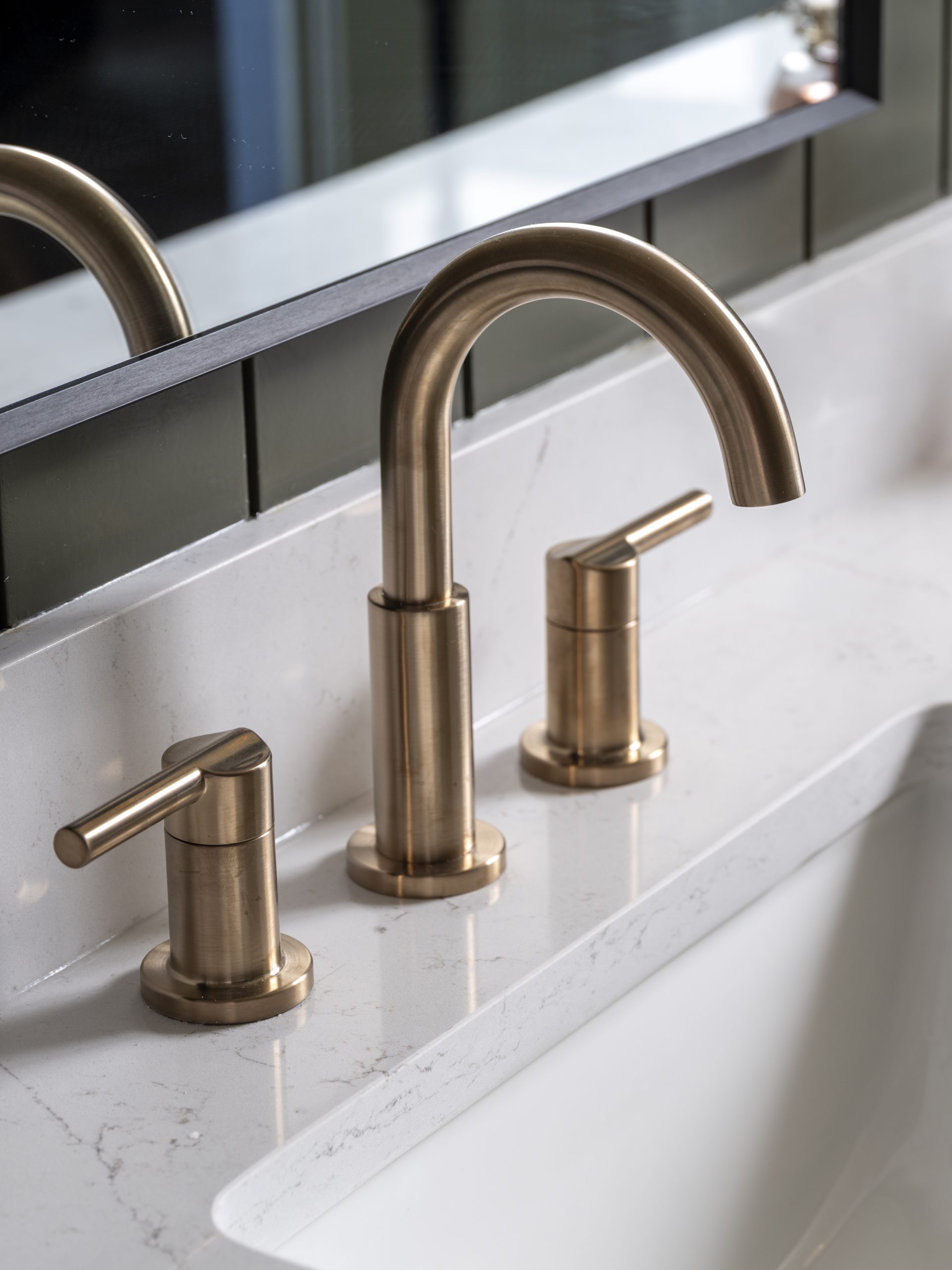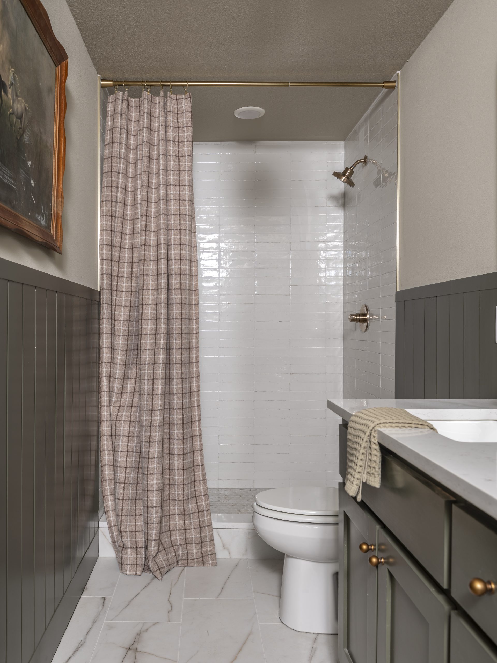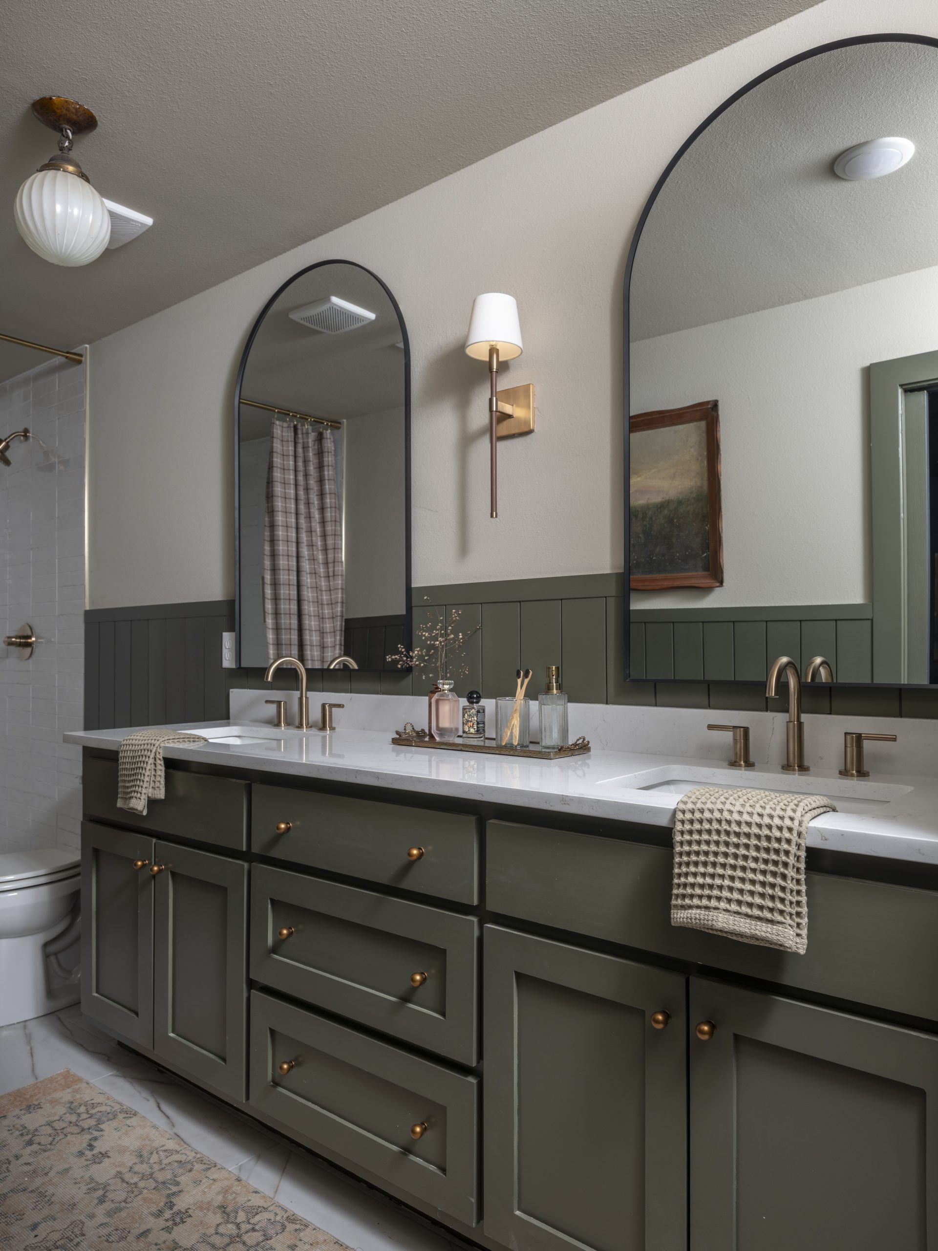 We didn’t have a lot of space to work with, but it turned out just right. The green-painted wood siding along the walls ties beautifully to the kitchen cabinets and the exterior of the home, creating a sense of continuity throughout. Laura loved the white tile in the shower and the gold fixtures, and of course, we included that cute old light that originally hung in the kitchen.