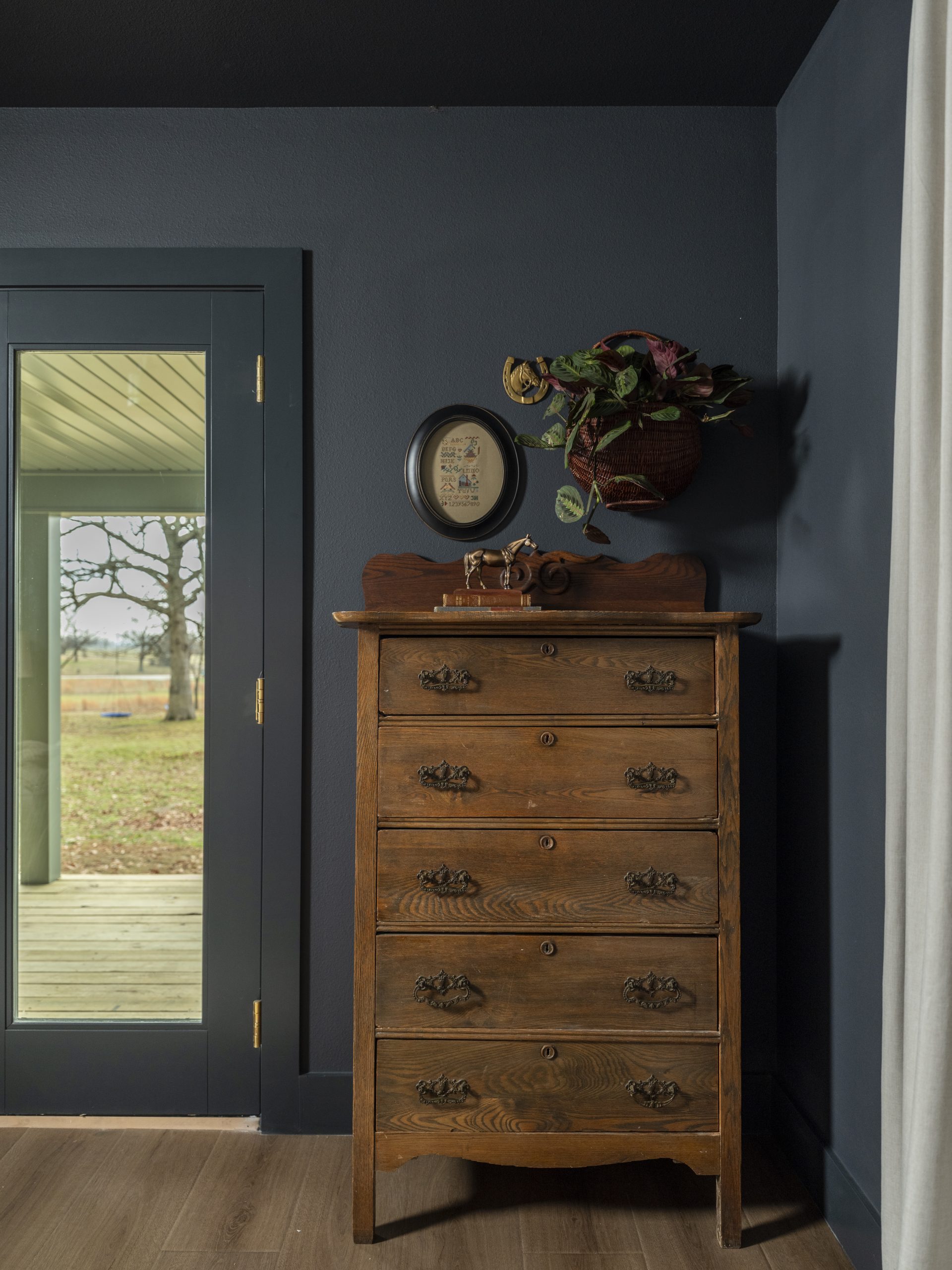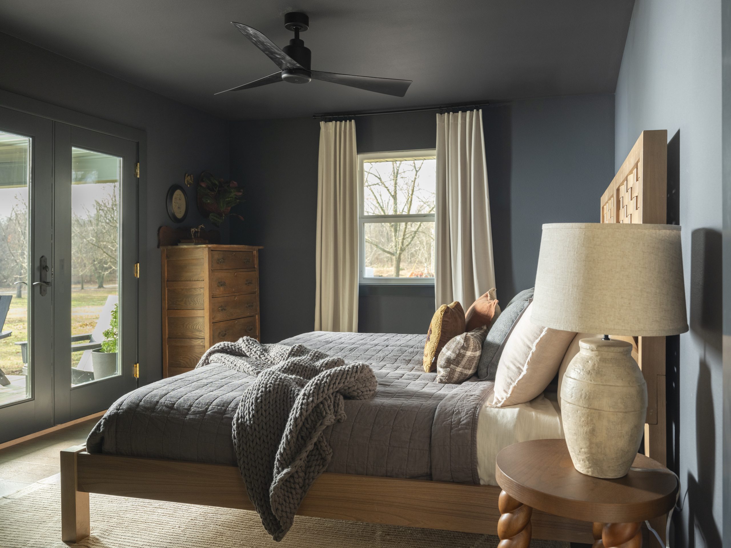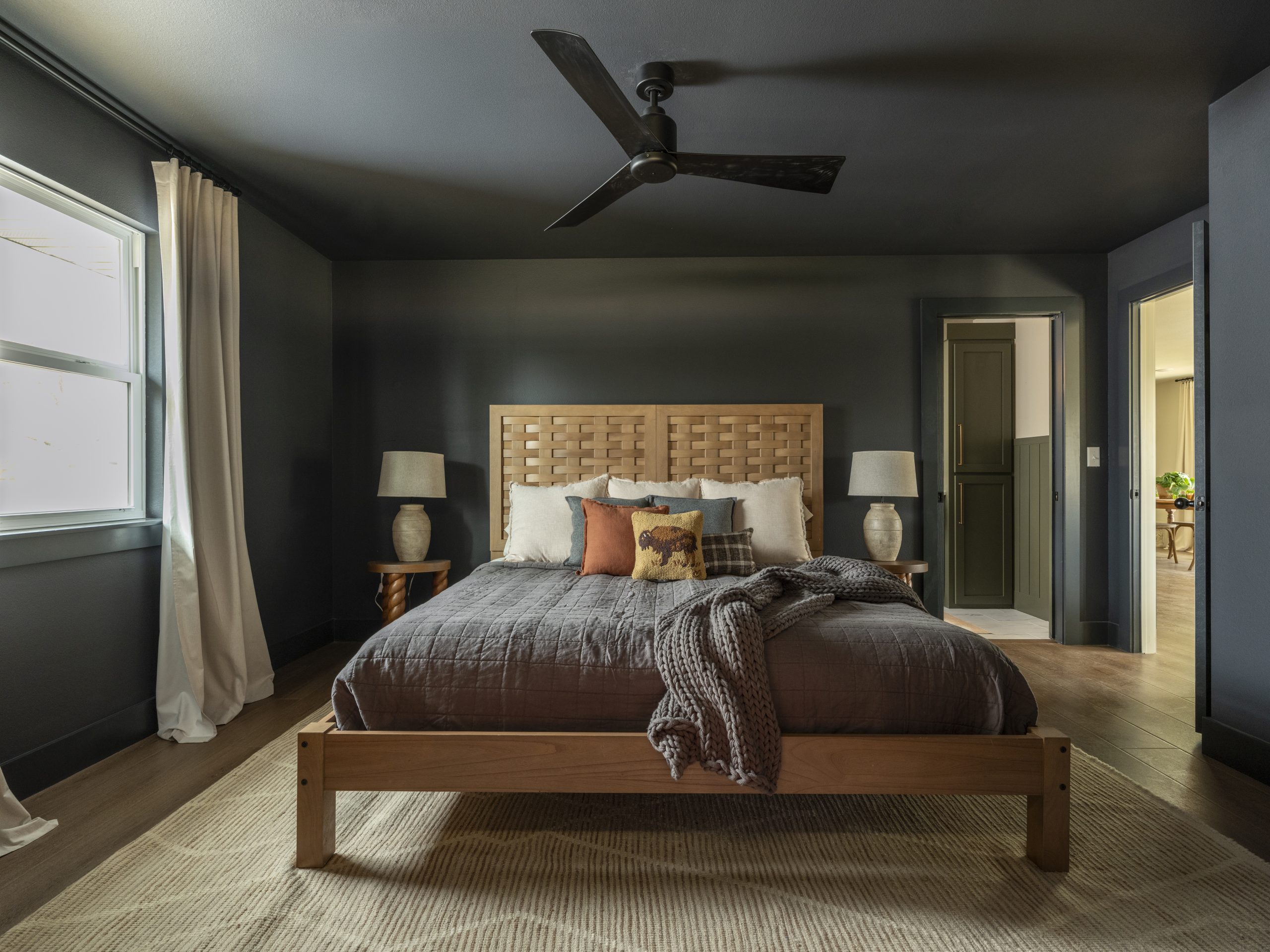 Laura and Matt asked for darker colors in their bedroom, so we painted the walls, ceiling, and doors in one deep, rich tone. Paired with their vintage pieces, the room feels cozy, layered, and like the perfect place to unwind at the end of the day.