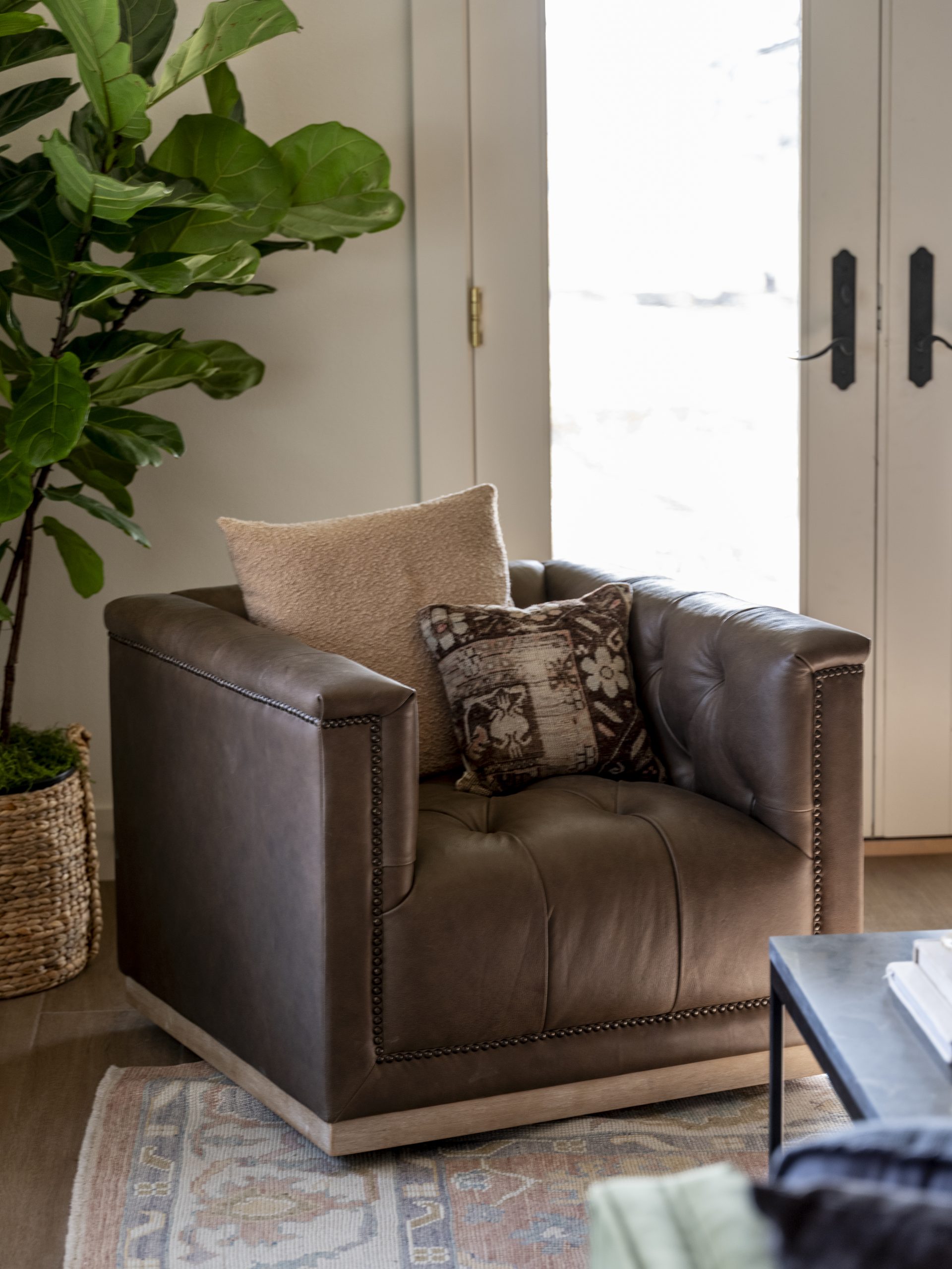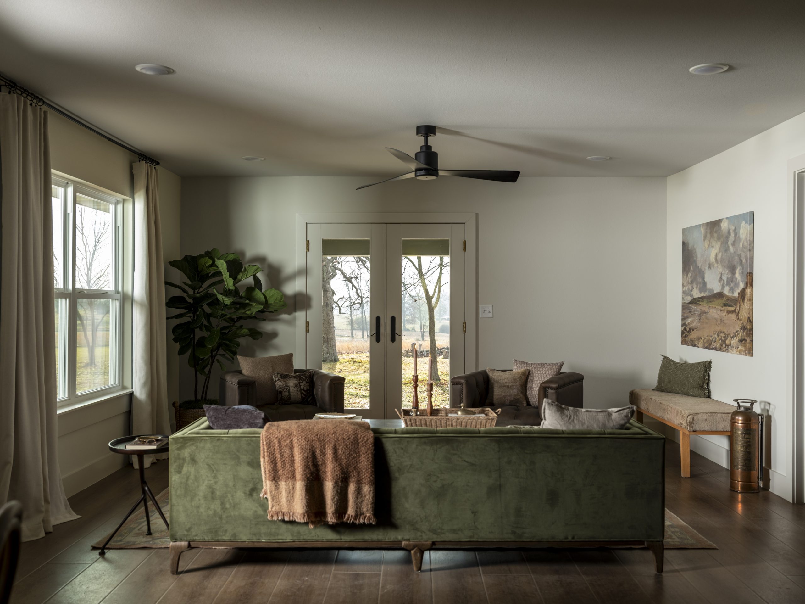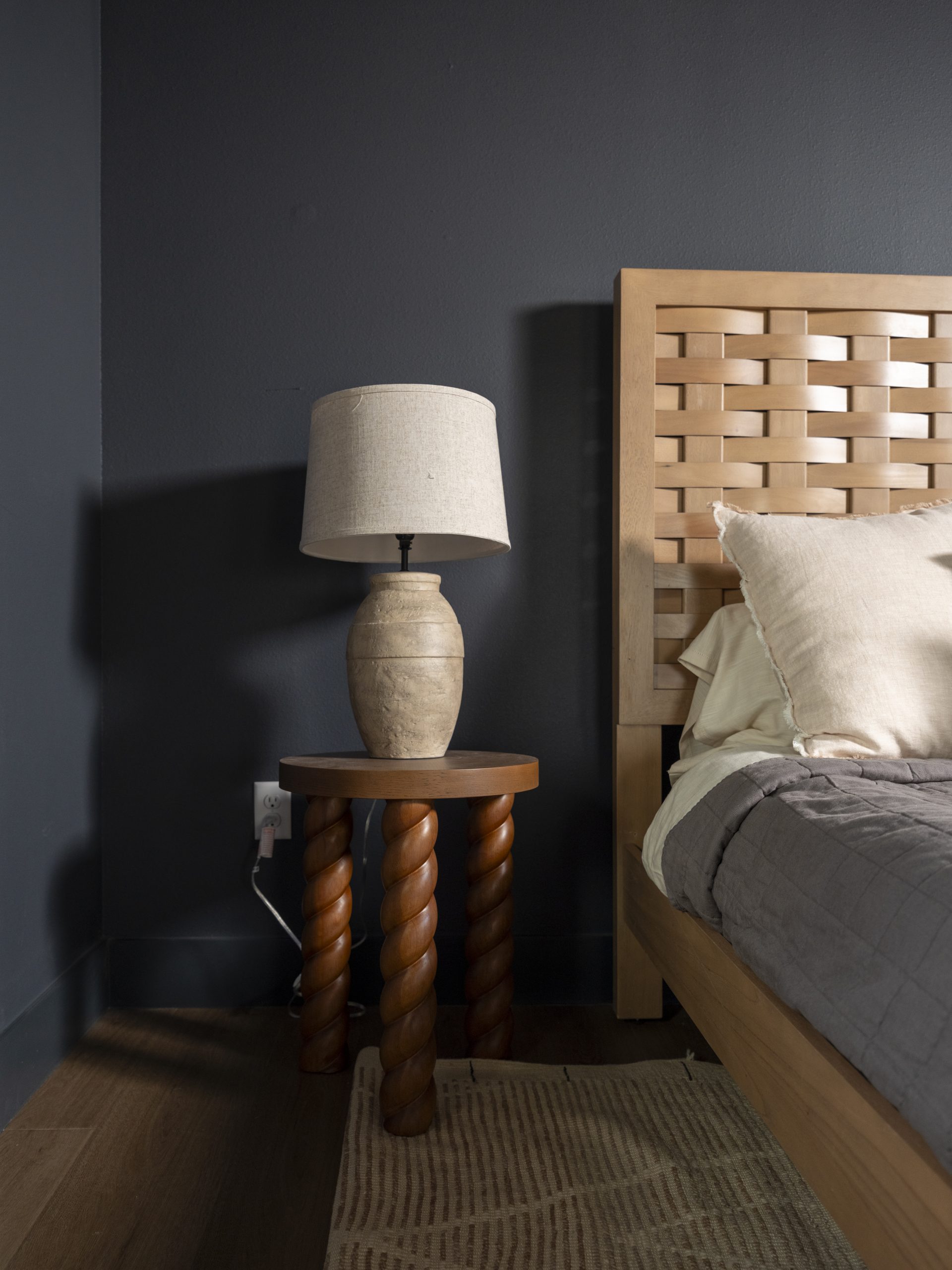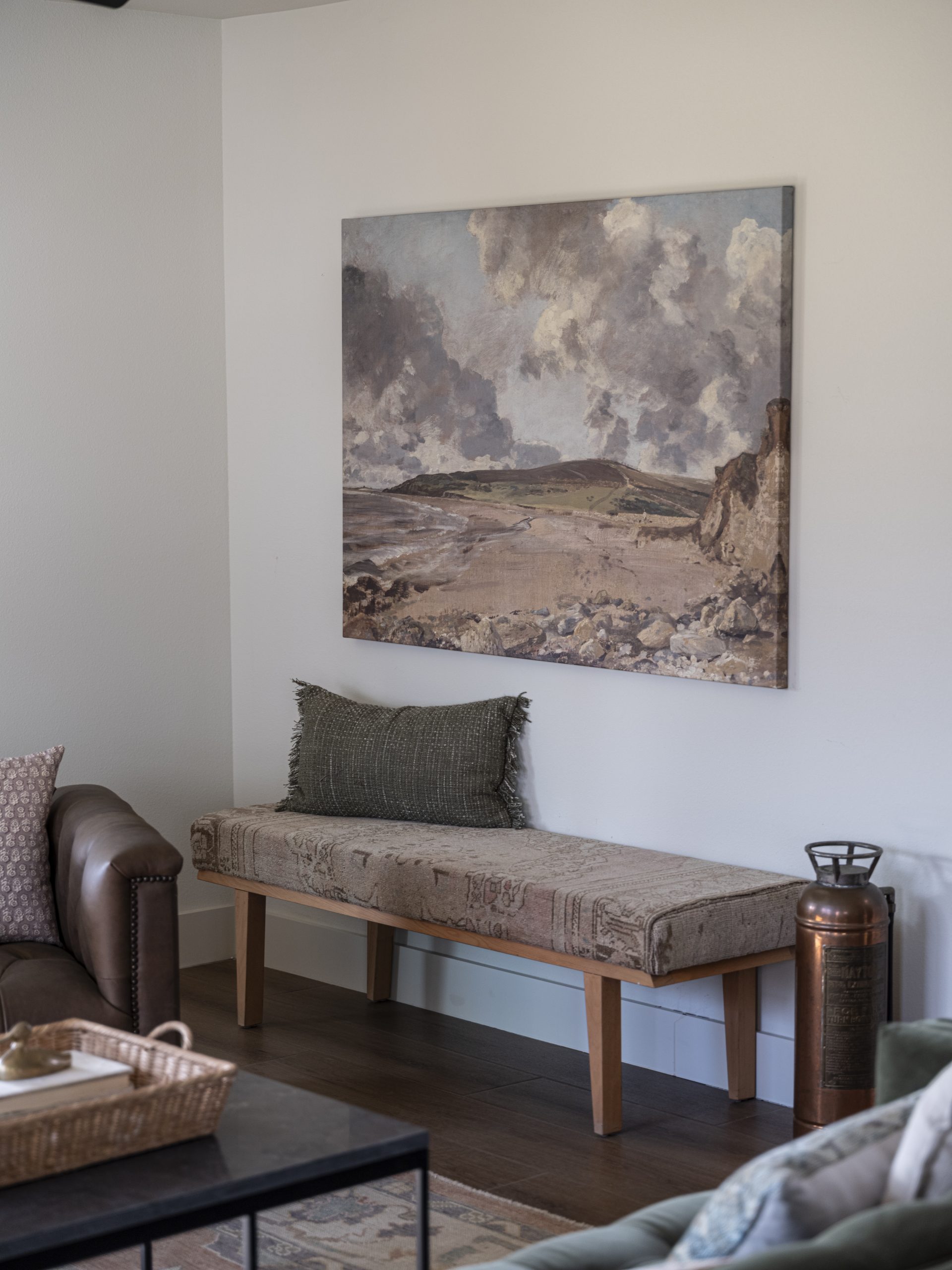 Laura and Matt asked for darker colors in their bedroom, so we painted the walls, ceiling, and doors in one deep, rich tone. Paired with their vintage pieces, the room feels cozy, layered, and like the perfect place to unwind at the end of the day.