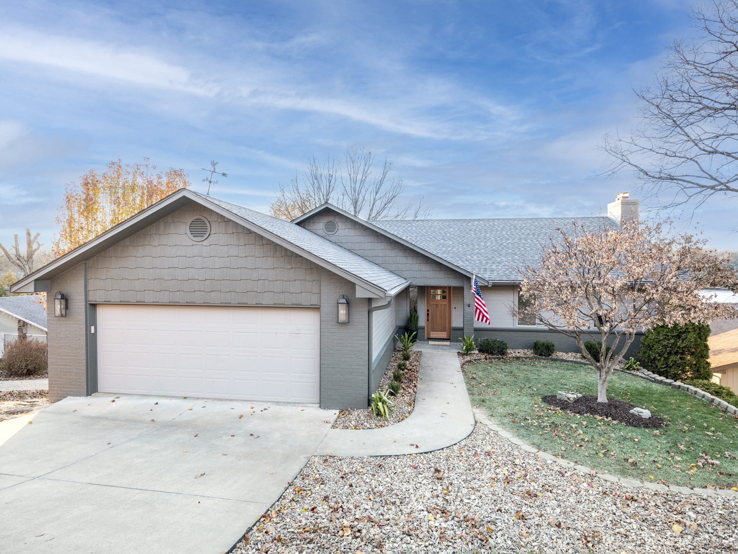 The house was a mix of brick, shingles and different colors. We painted it all one dark color to even it out and make it more modern. The garage door was painted as well, but we left the front door a natural wood to counter the modern exterior and provide some warmth. We also swapped out the light fixtures for larger, more updated ones.