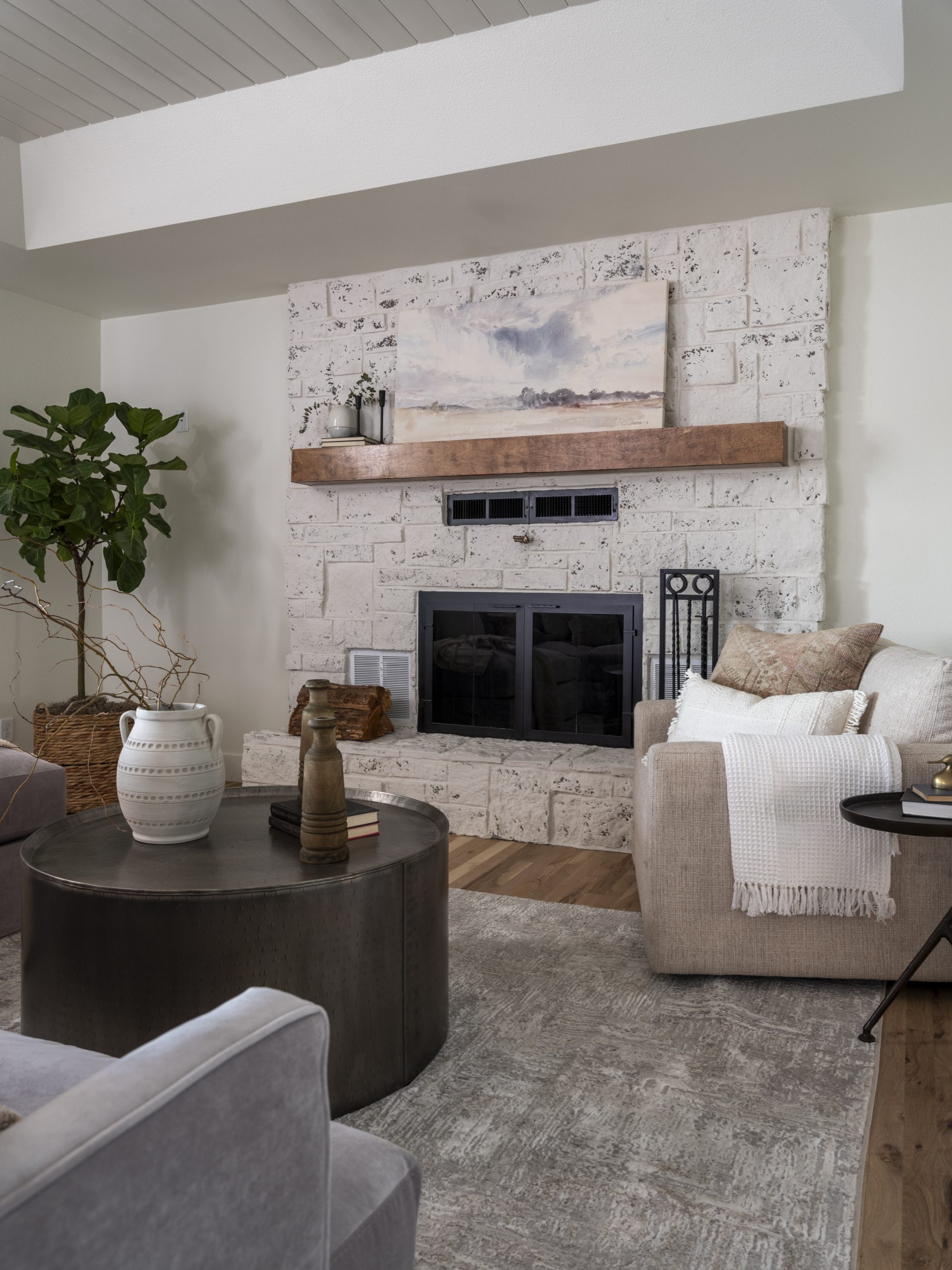 This space already had a nice open concept. It just needed some updating. We scraped the popcorn ceiling and tore out the old carpet. Then, we installed new flooring here and throughout the entire house. The white oak matte finish is soft and modern. Since we had taken out the sliding glass doors from the dining area, we added a big slider here. The old fireplace had the same brick as the exterior of the home. We covered it with stone and applied a mortar wash to lighten the look. These softer shades in the fireplace and the flooring feel more in sync with the lightness of a lake house.