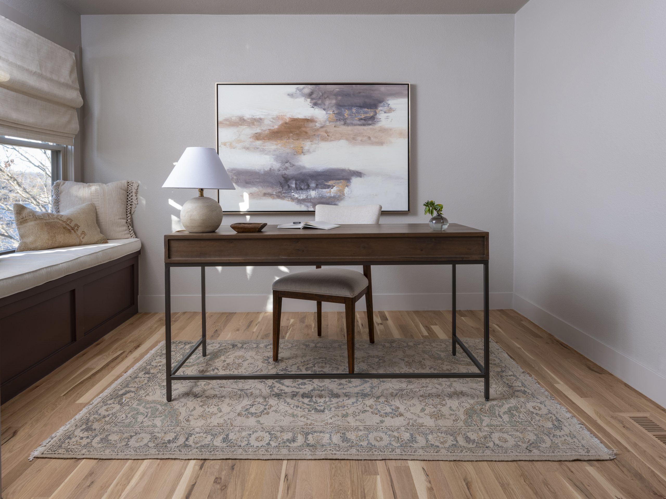 The bedroom needed some updating. We gave it a fresh coat of paint, new trim, a new ceiling fan, new window treatments and new canned lighting. We also replaced the old carpet in here with the same new flooring as the rest of the house. This room used to have an old sunroom next to it where Rick had been storing his bikes. We transformed that into a sitting room with a desk for Lisa. She had wanted an office space. There was enough space here to also give them a large walk-in closet, as well as a large window seat which Dave framed out. It adds a touch of coziness to Lisa’s office and has a nice view of the beautiful lake below.