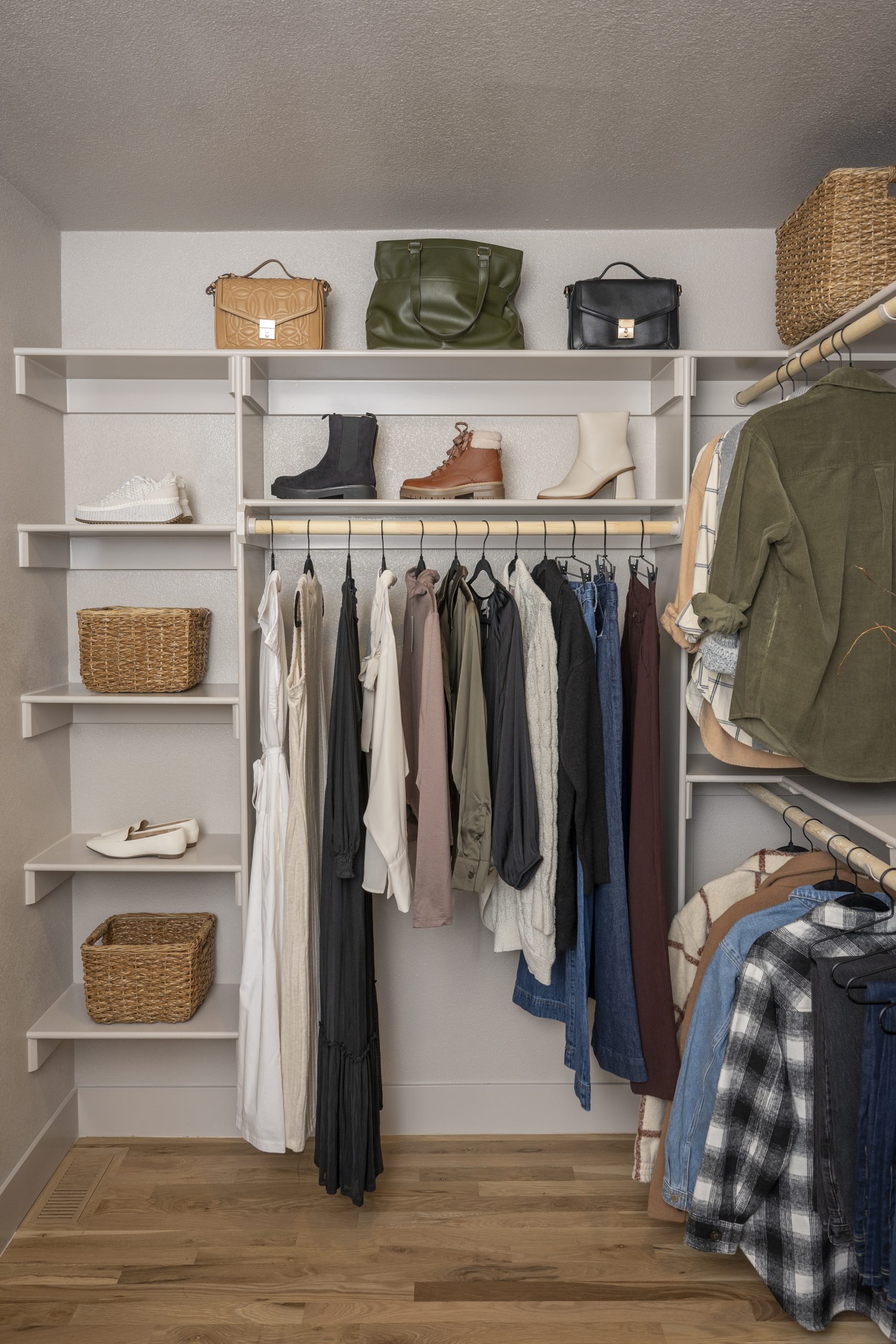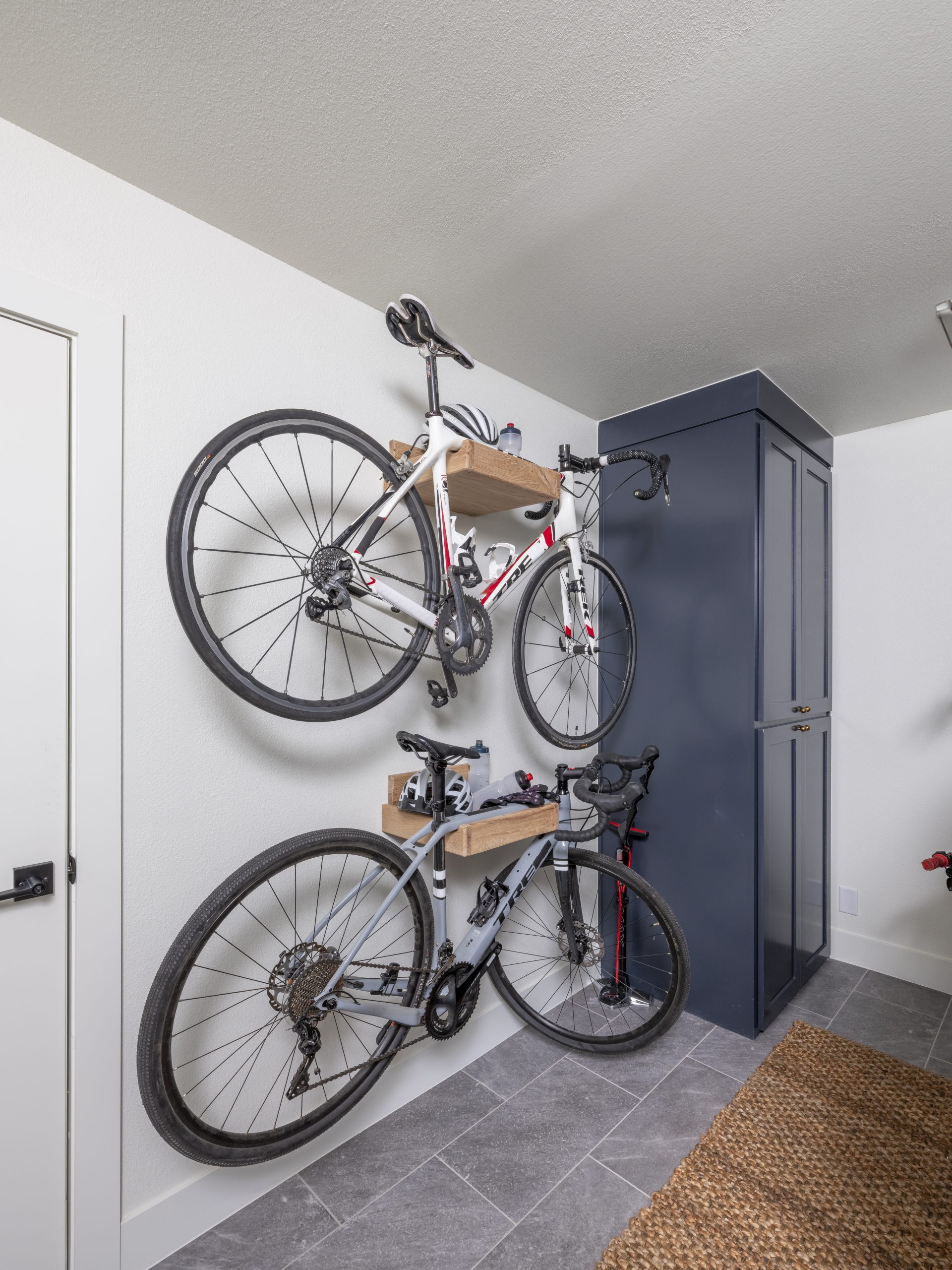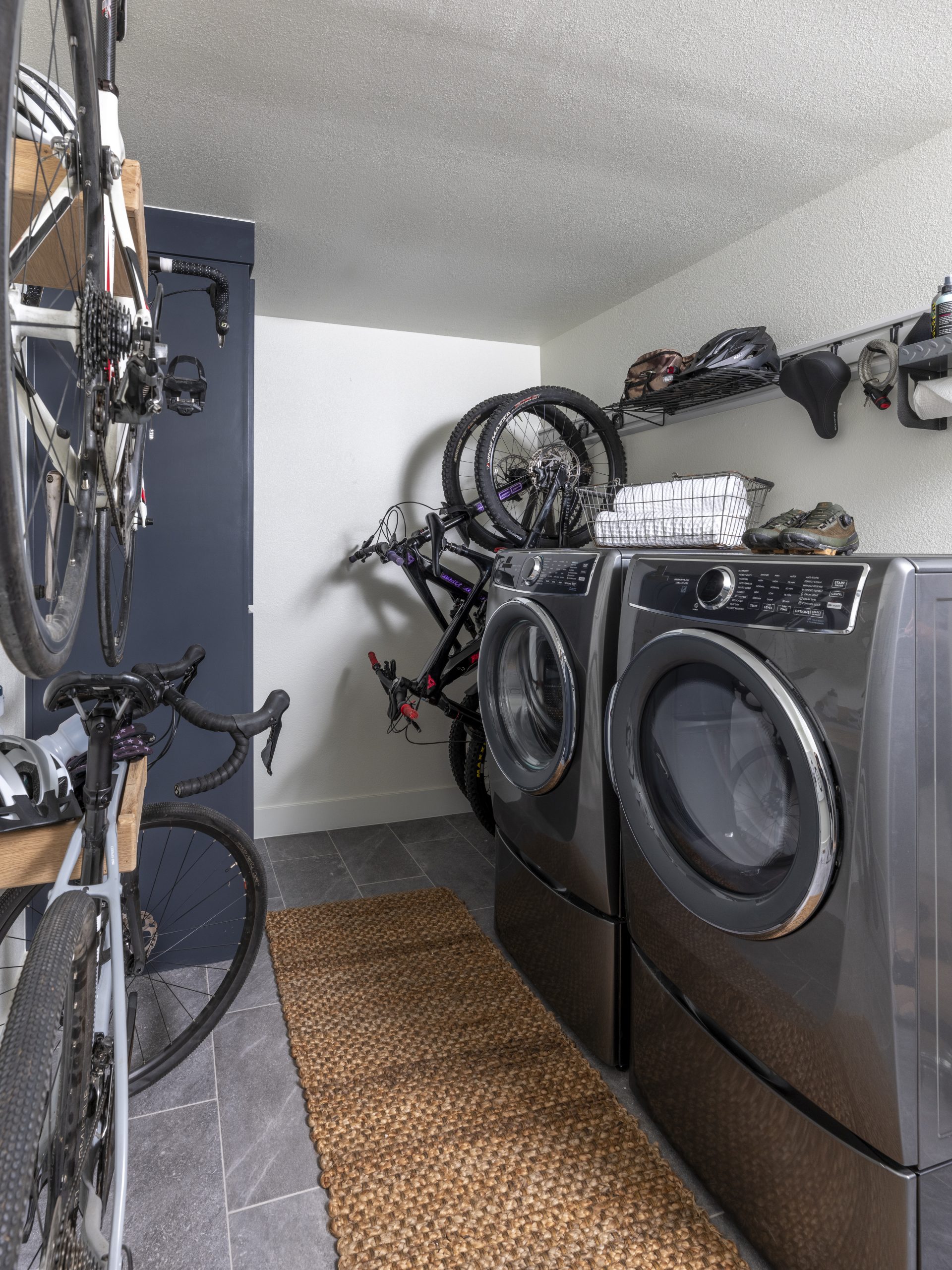 This was a small laundry room which we made larger by absorbing some of the space from the main bedroom closet on the other side of the wall. With the larger size, we were able to turn it into a laundry room and bike room. This was much more convenient for Rick who was walking his bikes through the house to store them in the sunroom. Dave installed a bike station and kit on the wall that moves around and adjusts for storing tools. Now Rick has easier access to take his bike straight out through the garage.