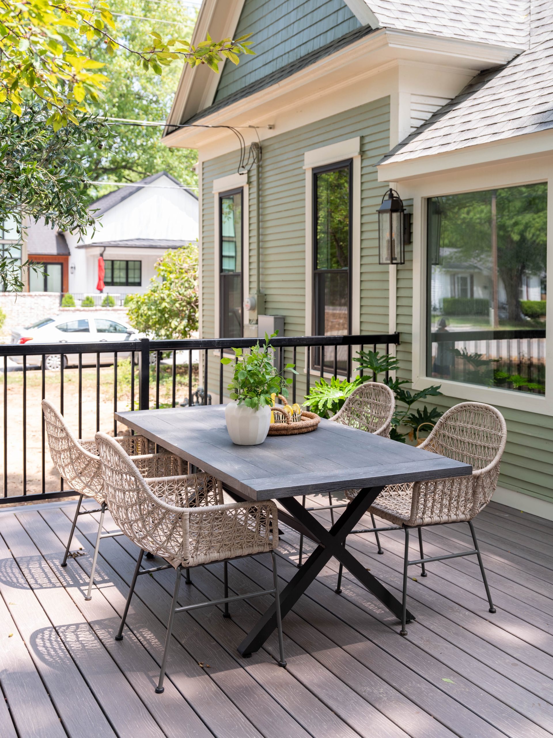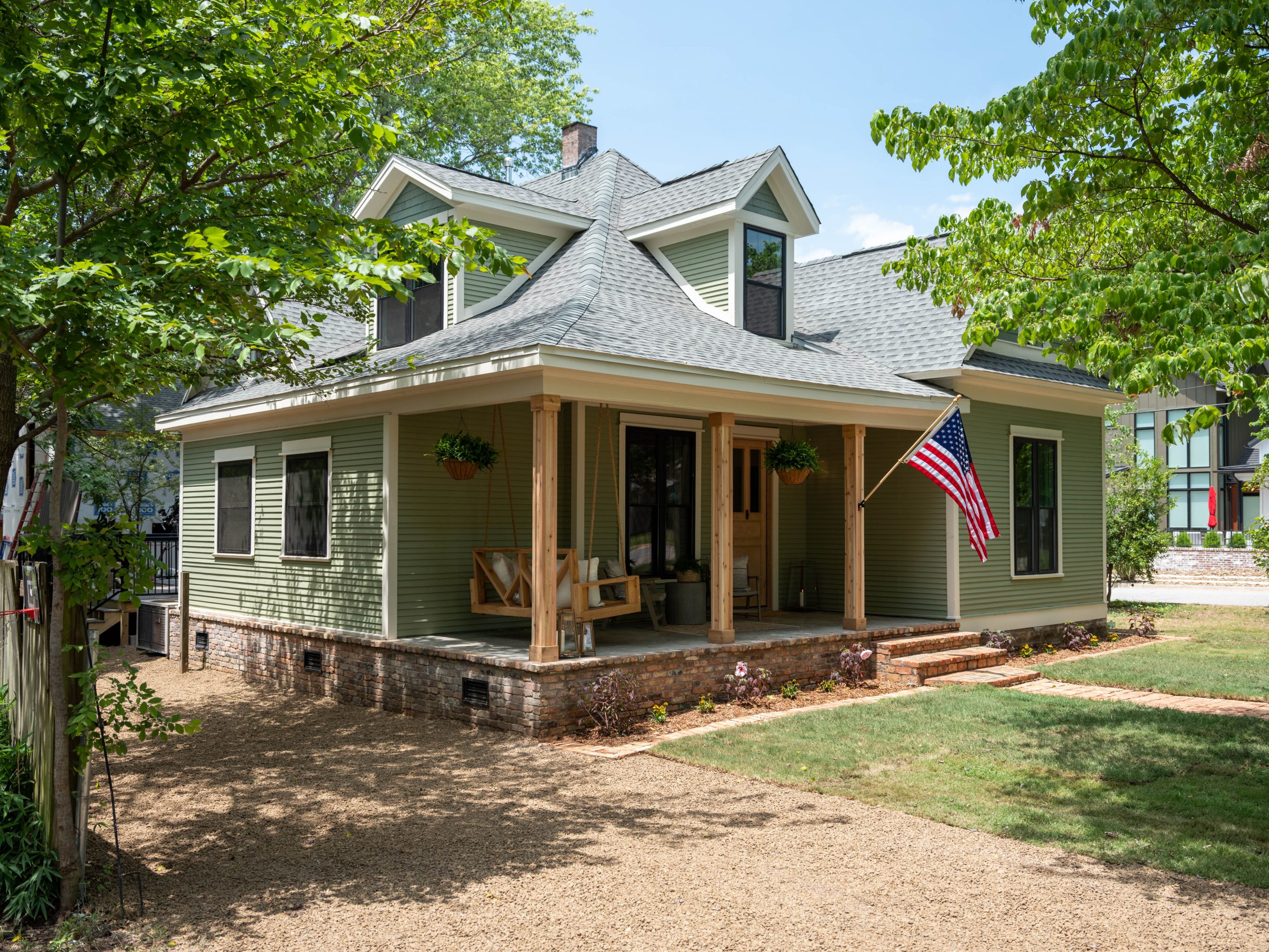We also added new roof shingles and new windows to the house, and when we removed the vinyl siding, we had a pleasant surprise. Not only was the original siding in good condition, but the house also had its original shake hidden underneath. Kristen said she was open to some color, so we chose a nice, muted green for the exterior paint. The color goes perfectly with the vintage-inspired lighting and the vintage brick pathway to play up the house’s historic charm while adding some fun.