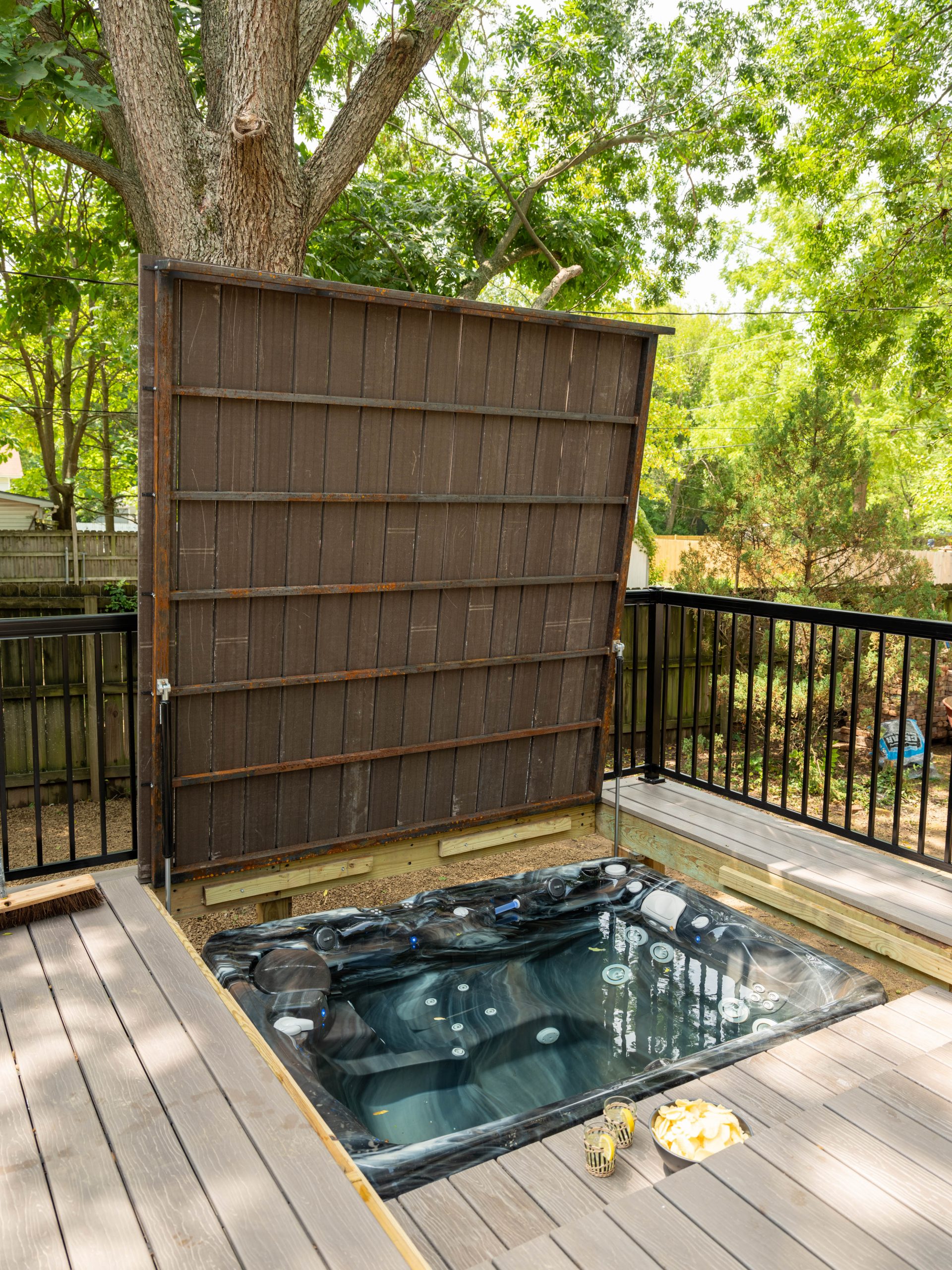Dave and the crew tore down the old deck that was behind the house and built a new, larger one. Within the deck, we also added a hidden hot tub. The Hillyer’s will be able to enjoy soaking in it and, when it’s not in use, they can tuck it away under the lid that is flush with the patio floor. You can’t even tell it’s there and it doubles the space where the kids can play on the deck.