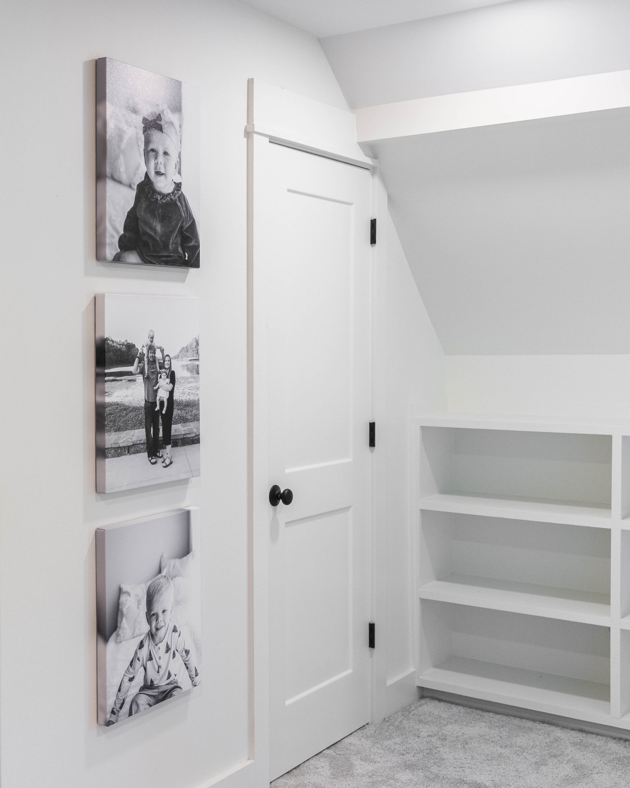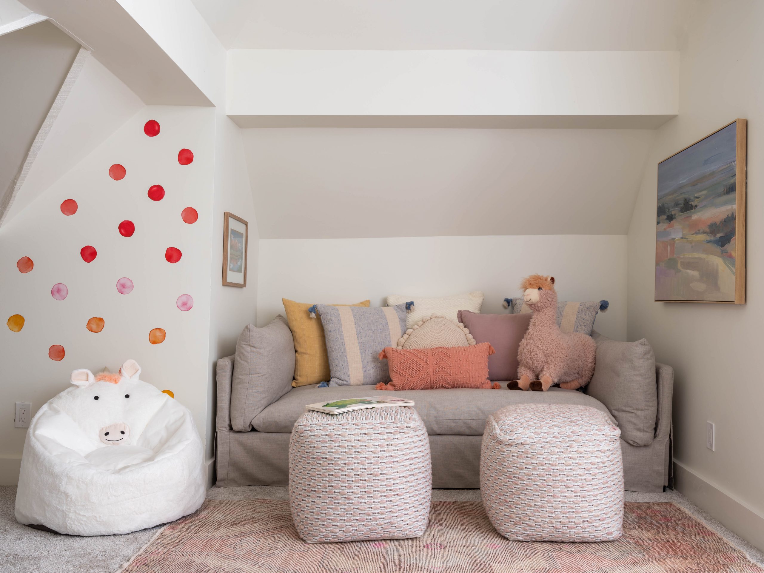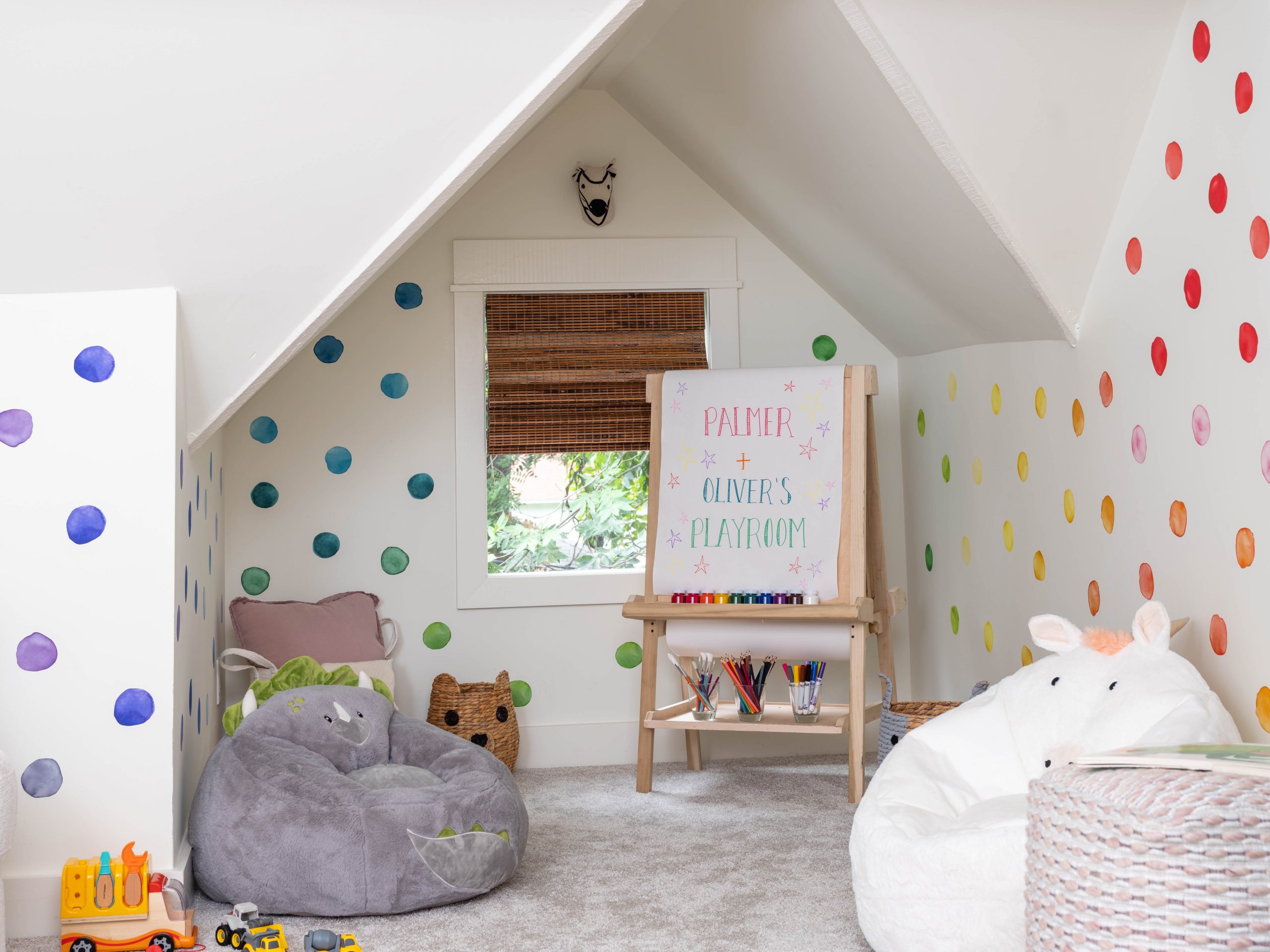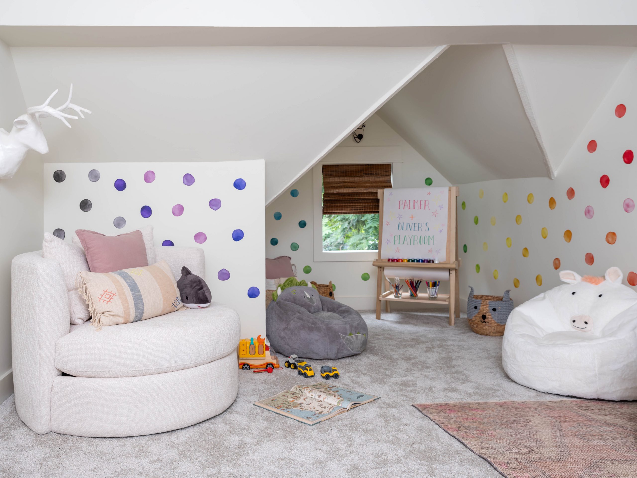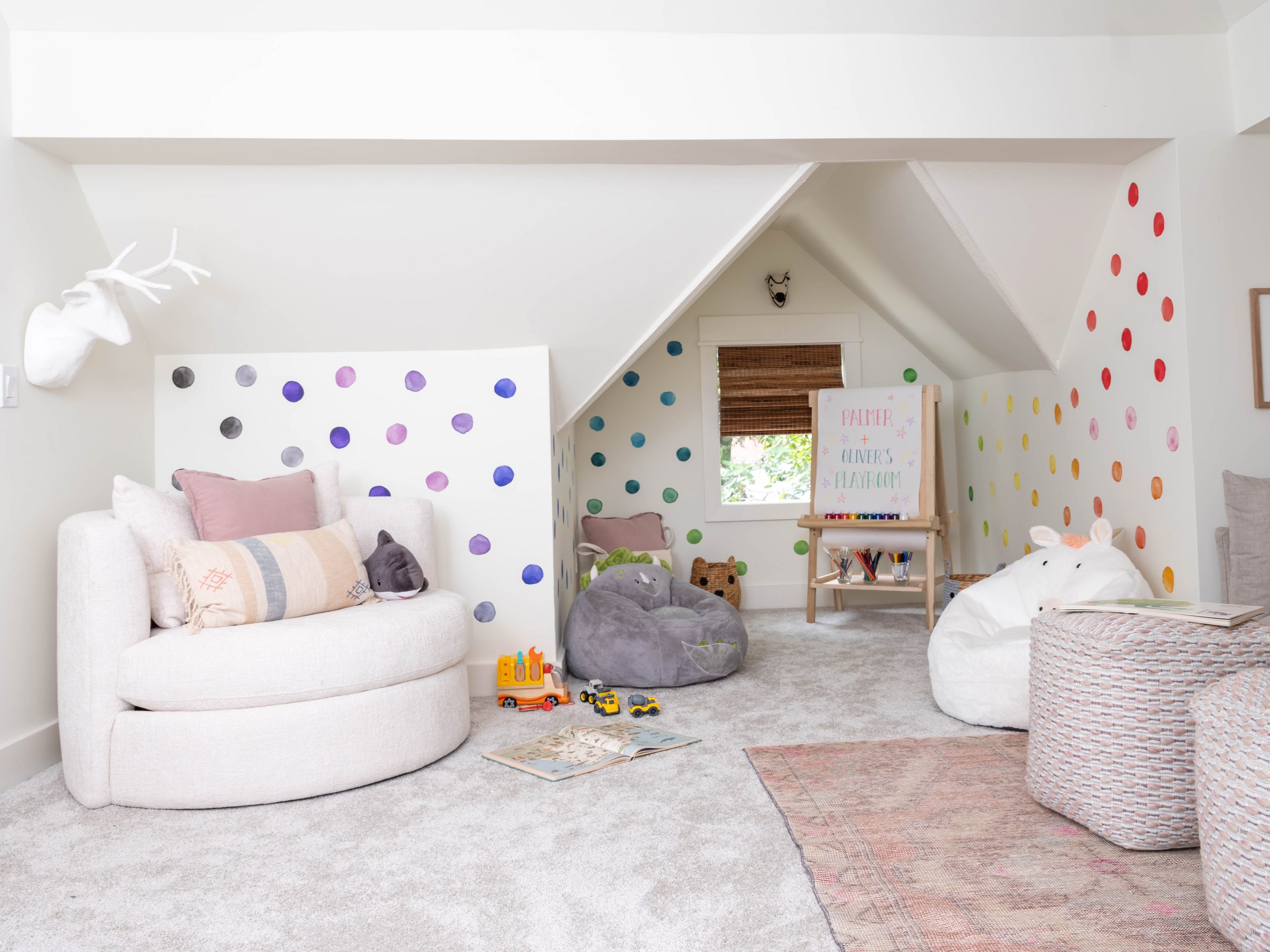 This attic reminded me so much of our attic space when we renovated our own home and gave our kids bedrooms in the attic. The high pitch of the roof allowed enough space to create a whole second floor up there. We put in a new staircase and added dormers for more natural light and additional space. In the end, we created two bedrooms and a loft play area for Derek and Kristin’s four-year-old boy and two-year-old girl. The quirky angles up here add so much character – I love it!