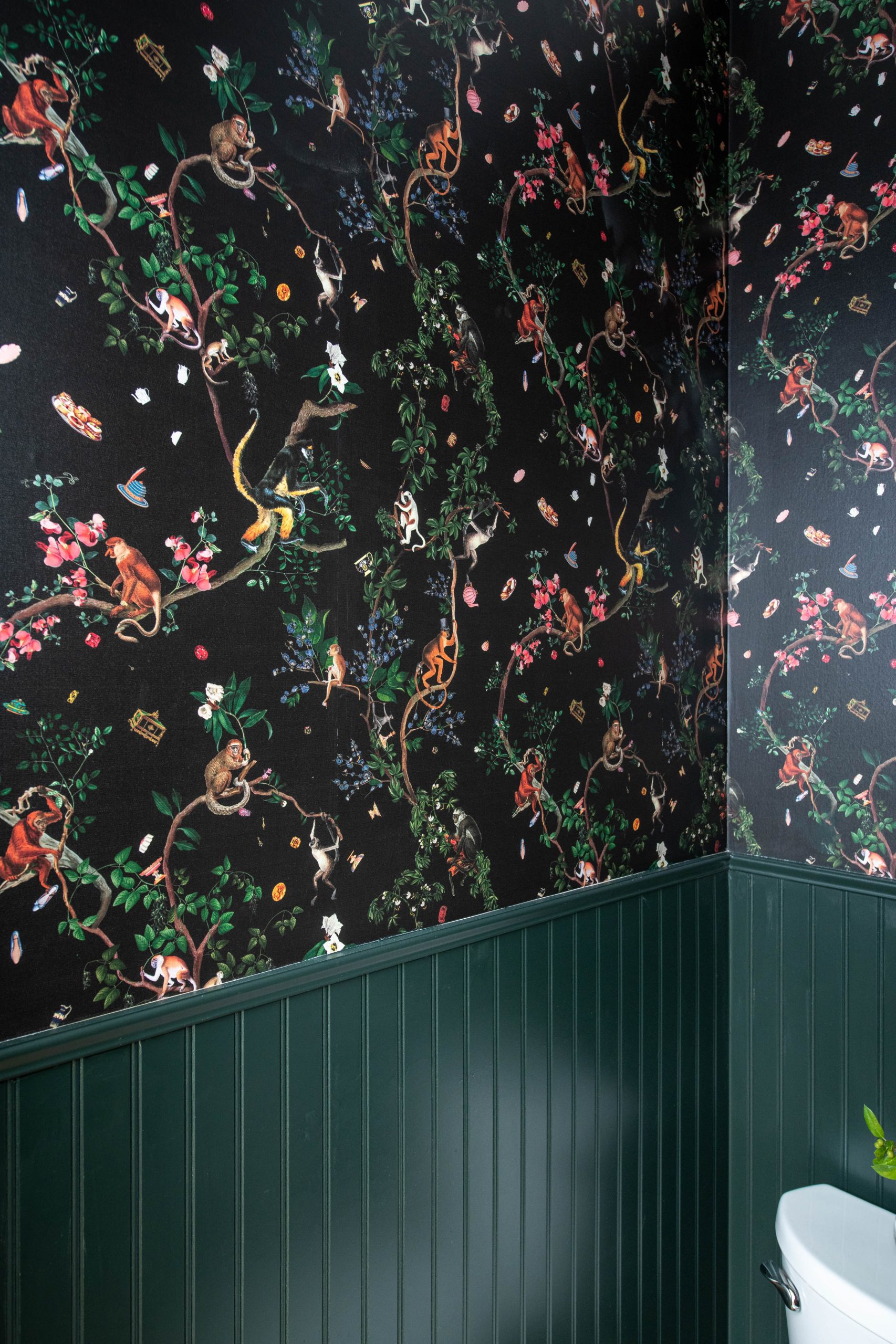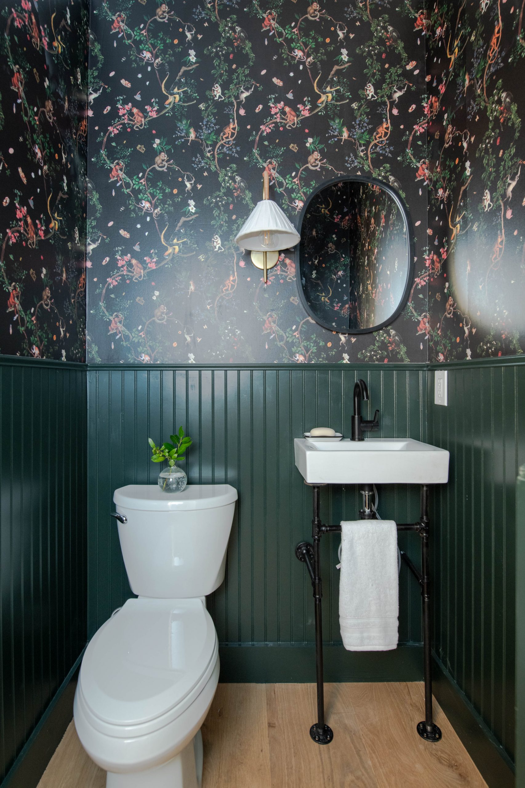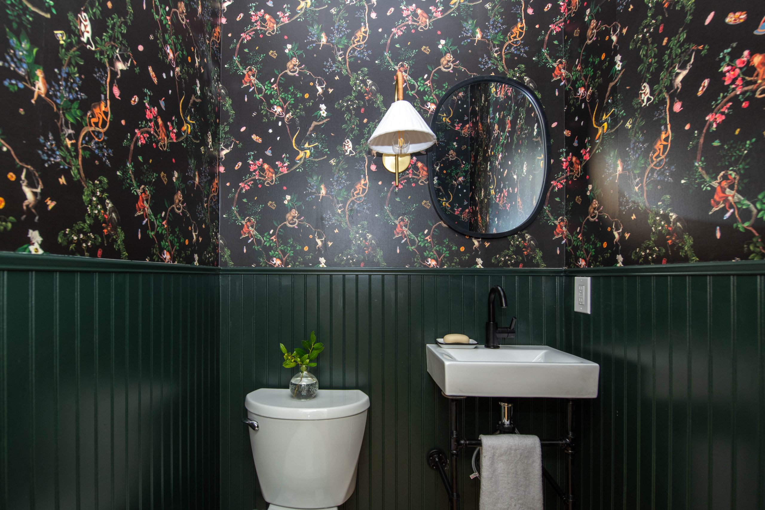 Because we added a staircase to what used to be the attic, we were left with an alcove that was the perfect size for a powder room. The green bead board we added goes nicely with the green tile that’s under the island. Derek is always open to surprising and eclectic designs, so I knew he would love the monkey wallpaper I chose in here. It adds a fun and unexpected modern twist for a historic home and a powder bath is the perfect spot for it.