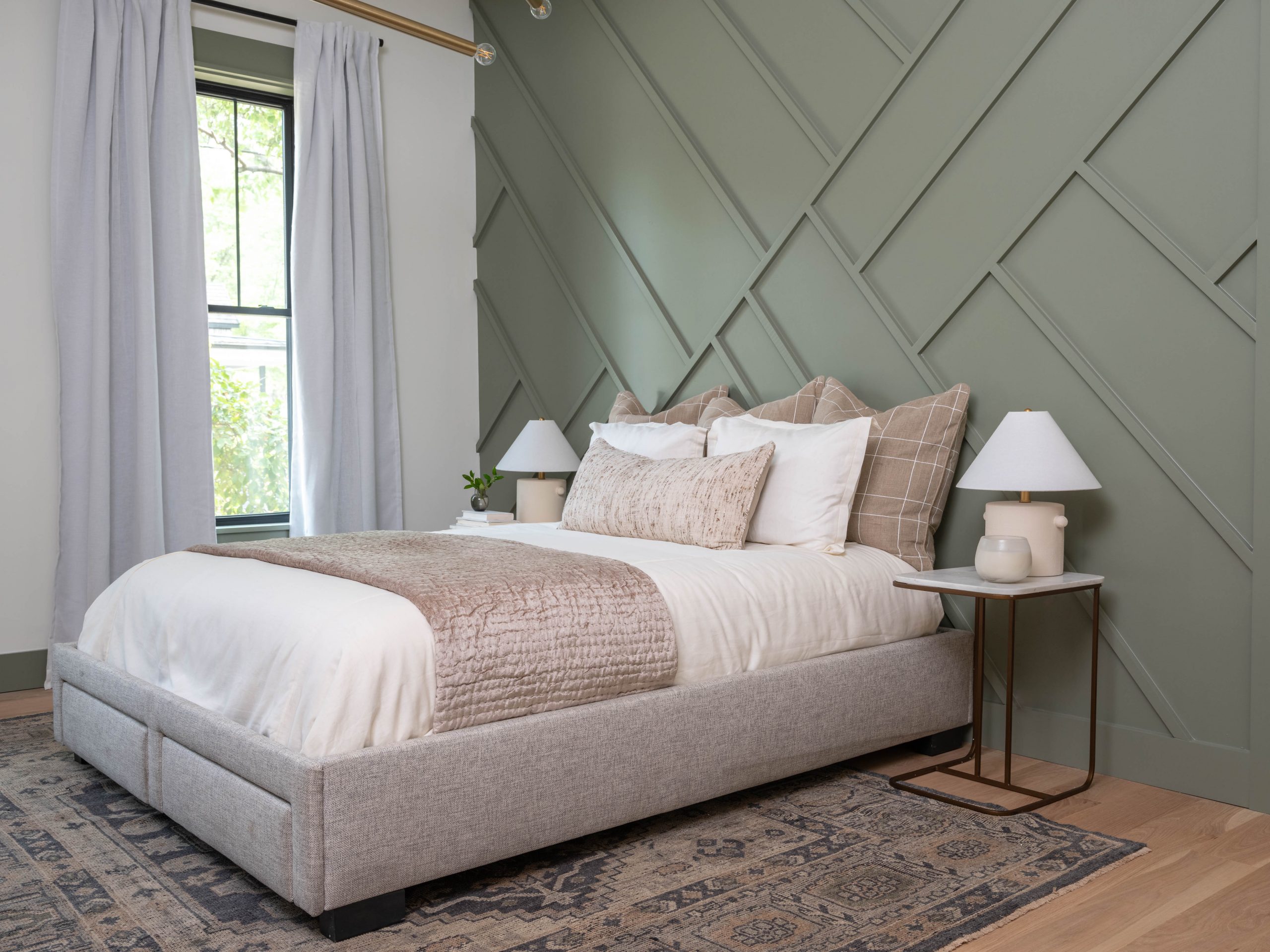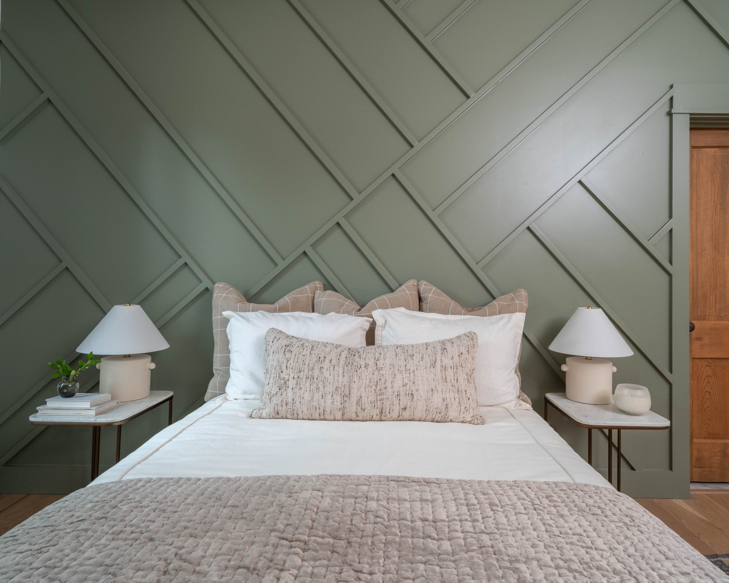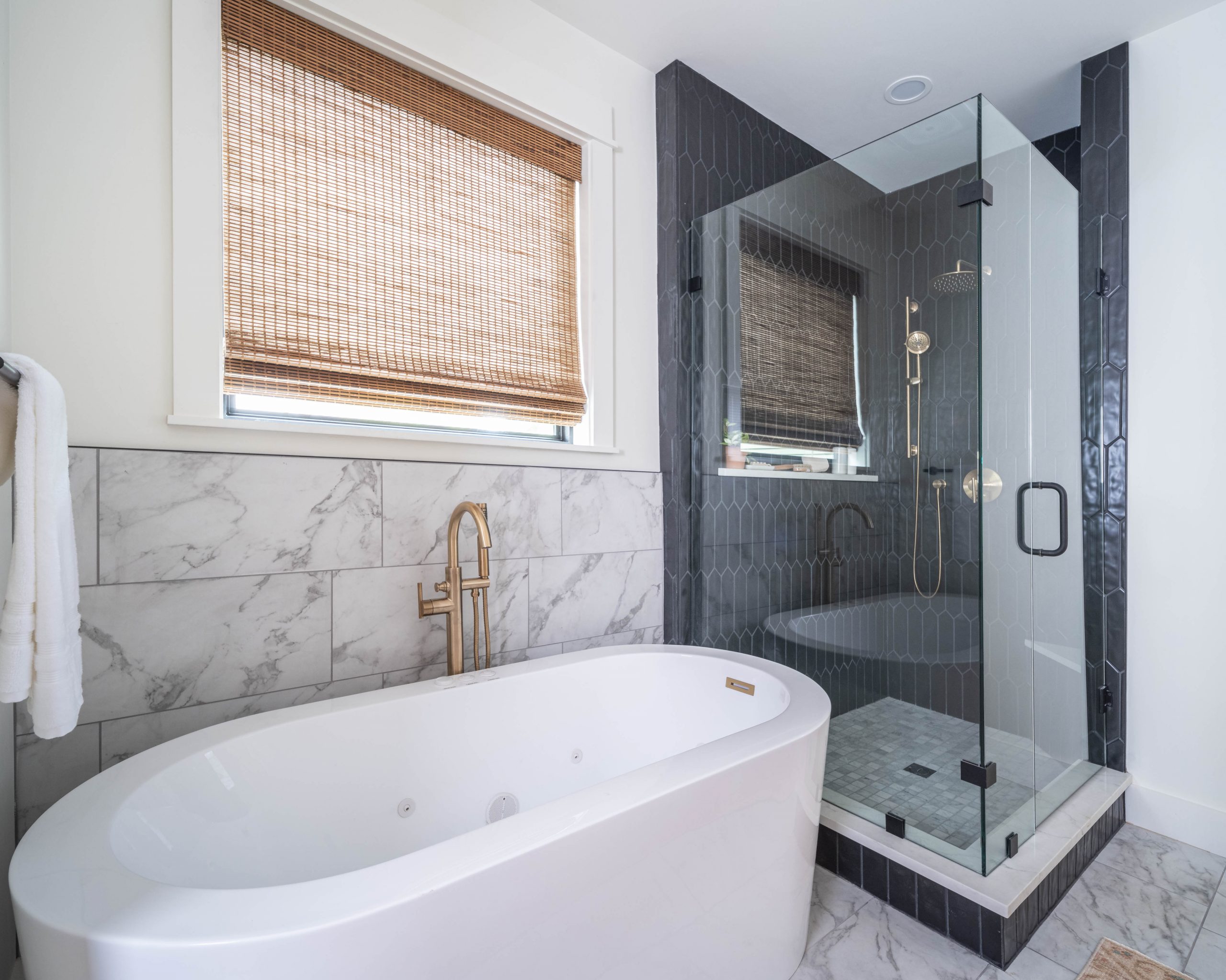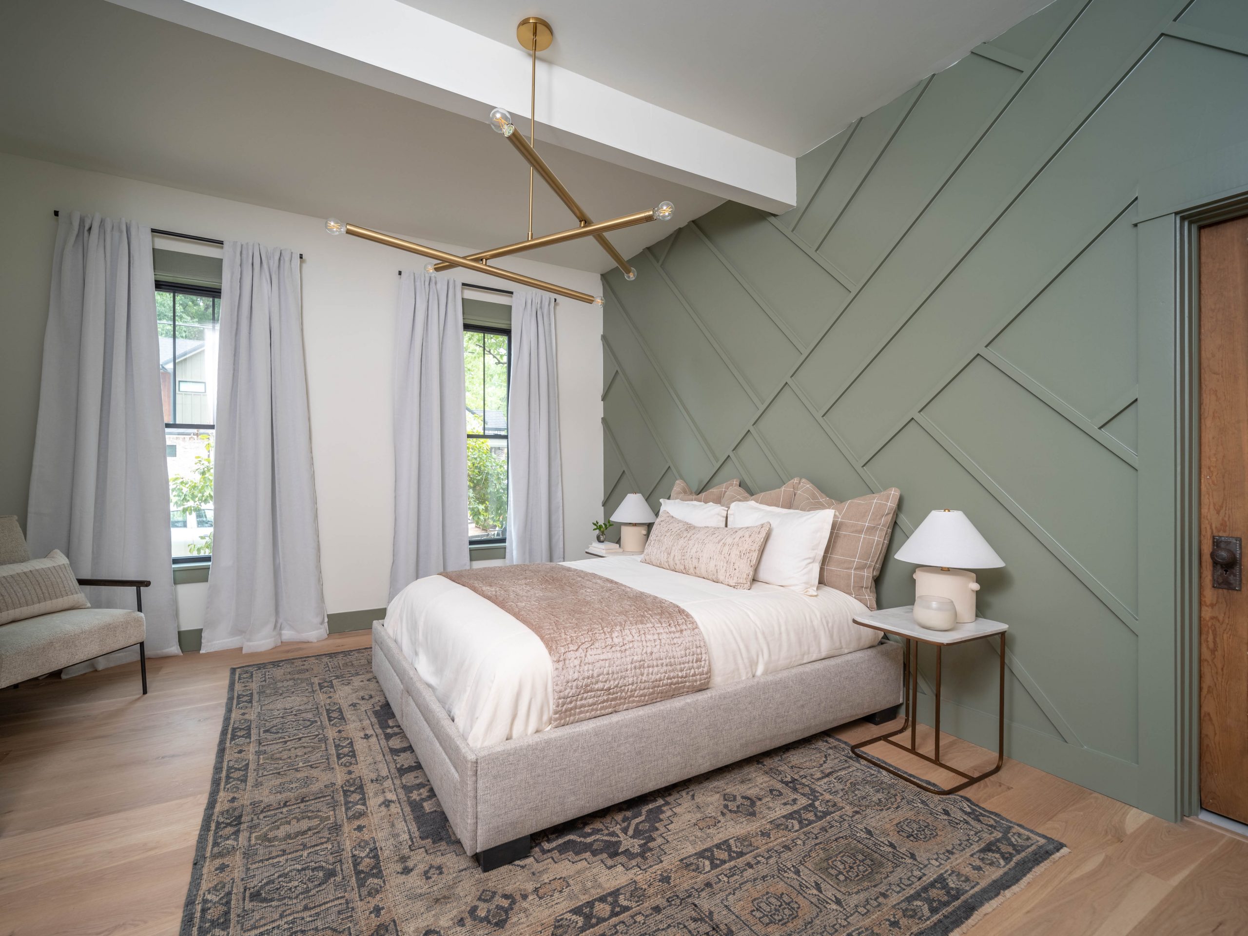 We like to salvage as much as we can and were able to repurpose leftover scraps of wood to create a dramatic feature wall in this room. Painted green, it adds architectural detail and depth to the space. It turned out to be a large bedroom, complete with a nice little sitting space on the opposite wall of the bed. Derek seemed pretty happy about the new bathroom. We had him in mind when we chose the sleek black shower tile and the modern glass shower door. The sleek shower contrasts nicely with the antique feel of the soaker tub.
