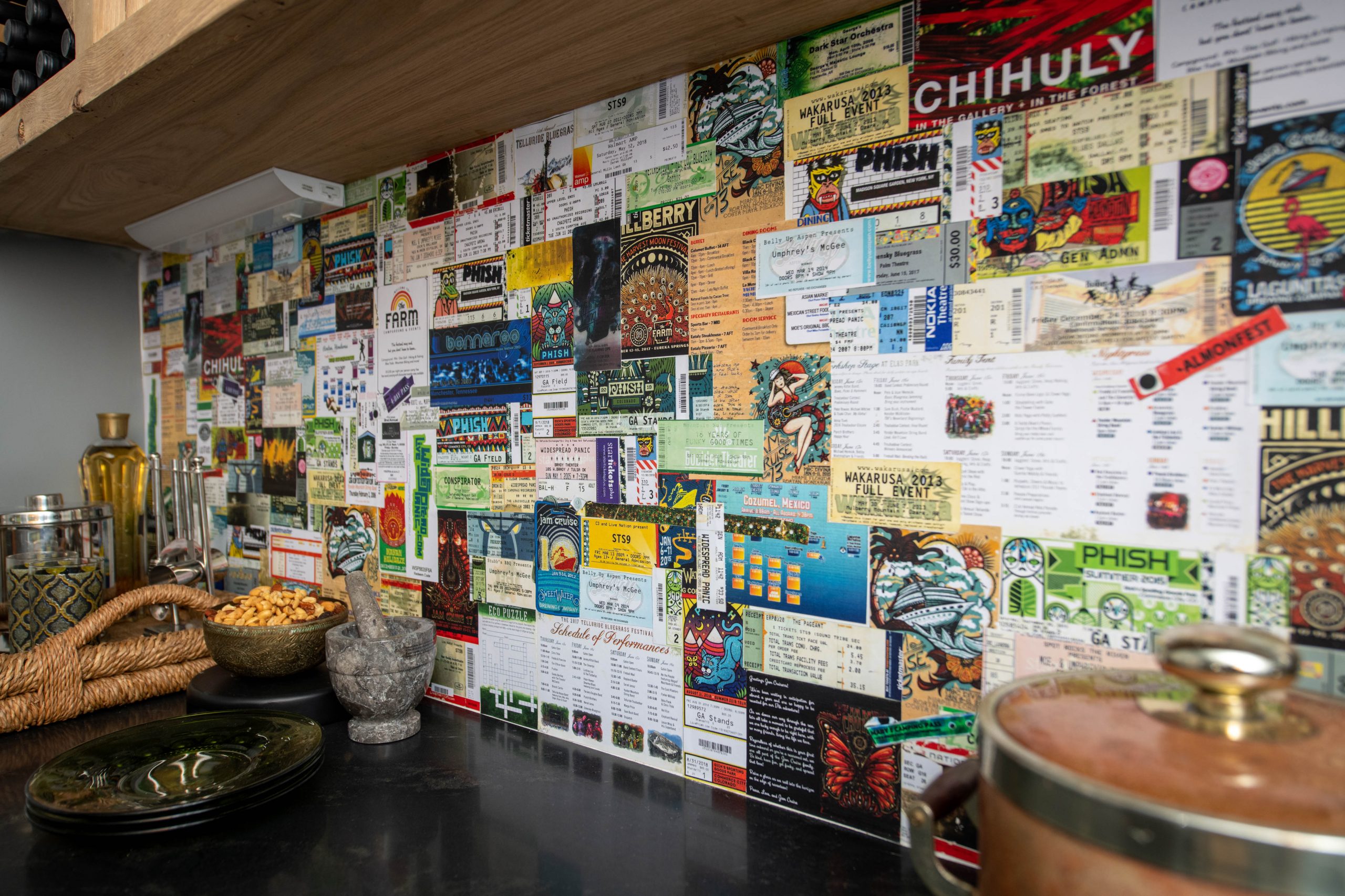 Kristin and Derek chose to make the old sunroom into a little grownup space, and Dave and I had fun fixing up this little room. We managed to get our hands on old ticket stubs from concerts the couple had been to in the past. After making copies of the tickets, we created a very cool and unique wallpaper. Dave handmade cabinets and shelves, and we added a wine fridge to give them a nice bar area. They loved it! They use the space now to play records that they can listen to from the kitchen.