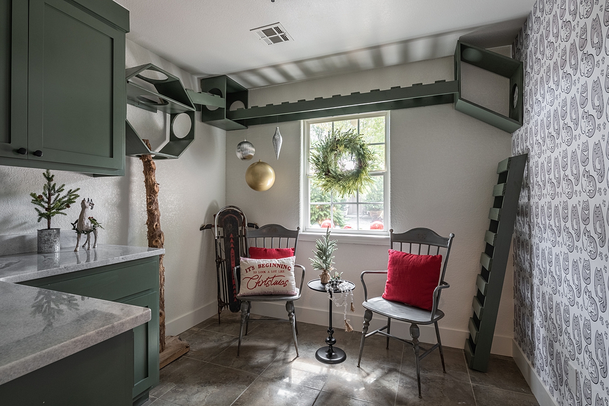 We had a lot of fun taking this cat room to another level. Dave and Joe built some fun and fancy cat-climbing structures to keep the kittens entertained and moving without giving up any of the existing floor space. The new cabinets in a rich green shade and the custom wallpaper (by the same artist who made the mural in the reception area) make this room perfect for the humans too.