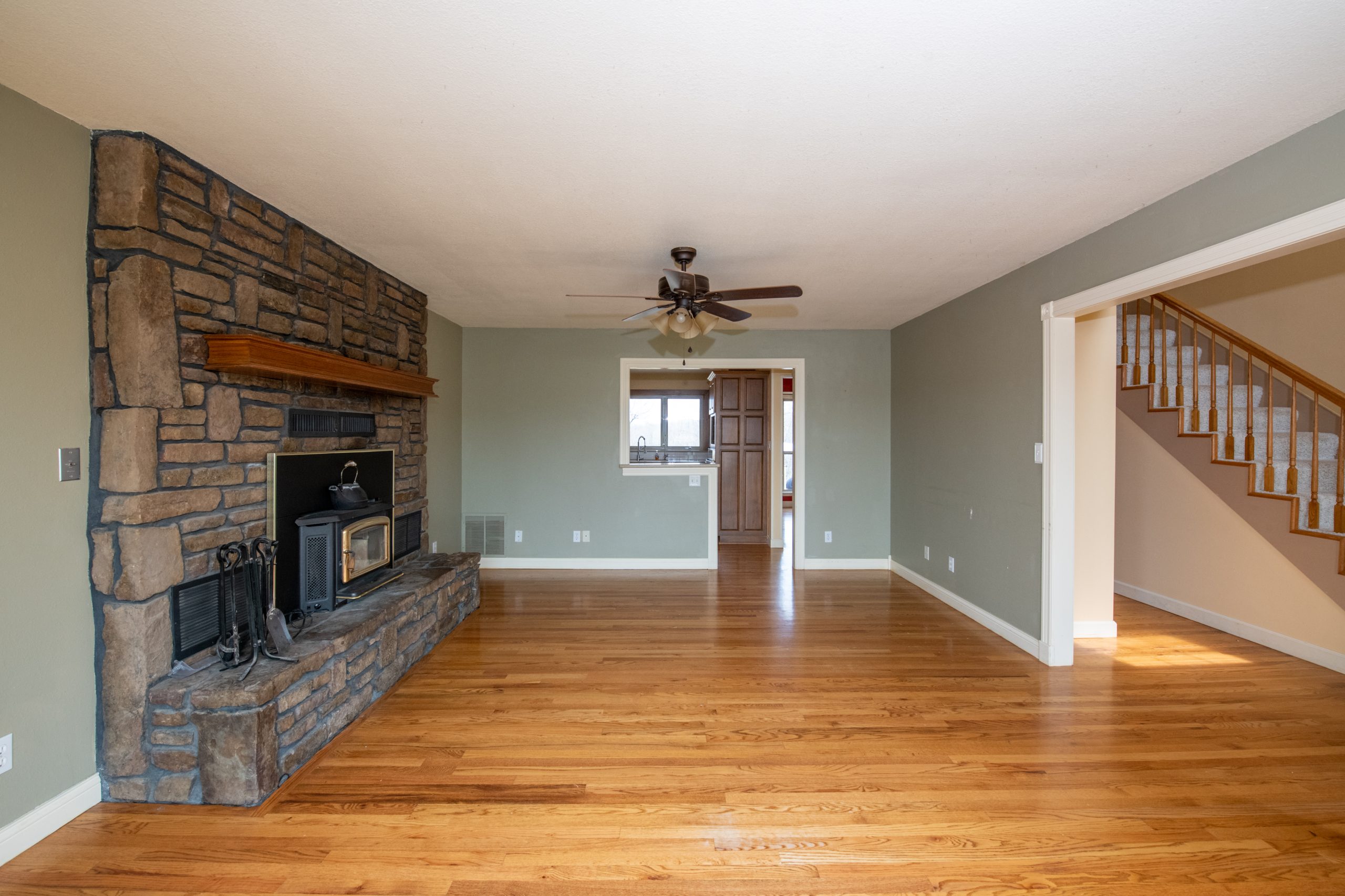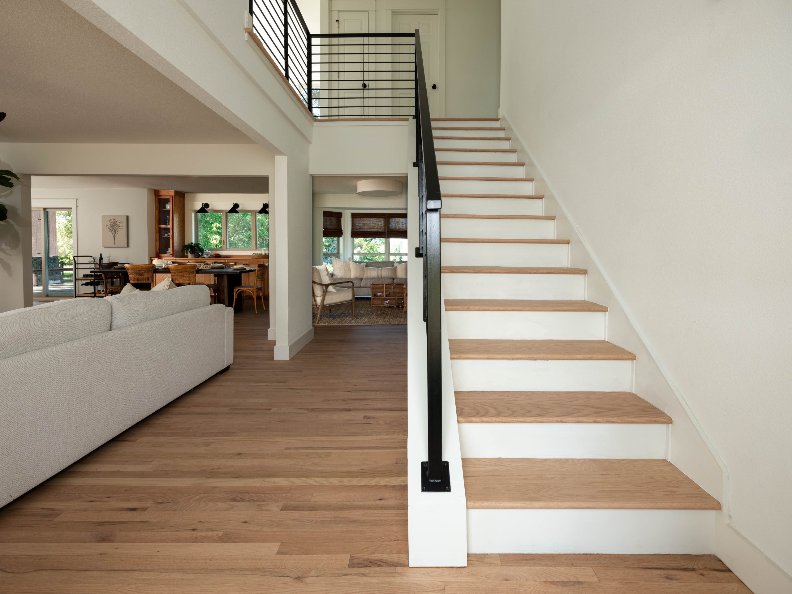 The floor in the living room, and throughout the entire house, is a non-glossy white oak. It’s the same flooring I have at home, and it’s great for kids and animals because it holds up really well against scratches. The staircase leading upstairs is visible from the entryway and living room. We replaced the old handrail with a more modern black metal version.
