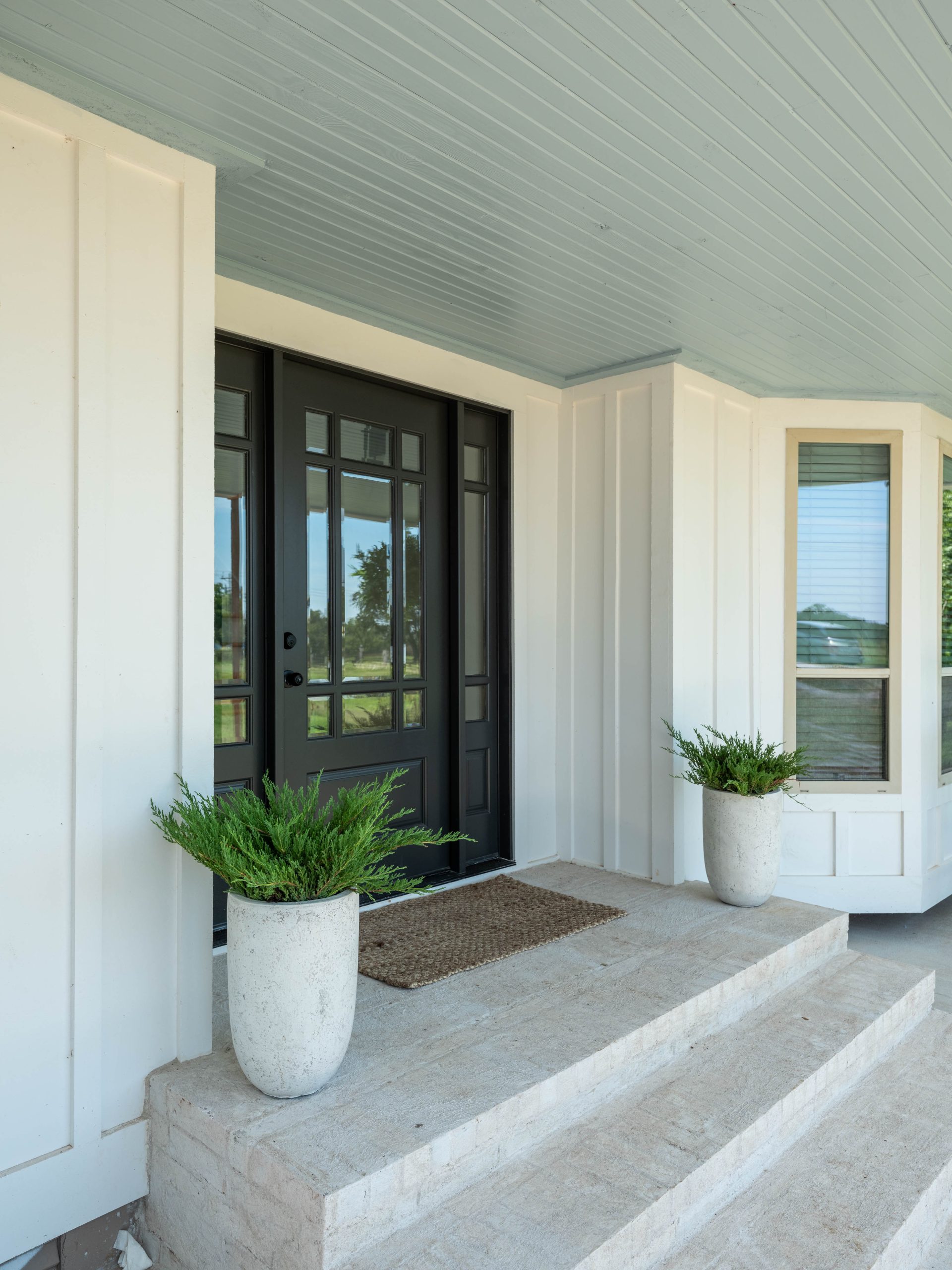 At the center of the house, we added a shed style roof over the front door to create a large front porch. Board and batten along the whole front exterior, painted in white, turned the house into a modern, yet classic ranch-style home while the final details added warmth and interest. For that warm natural feel, we added cedar posts, cedar flower boxes and all new landscaping. And for contrast, we installed a large beautiful black door, black shutters, and black light fixtures.