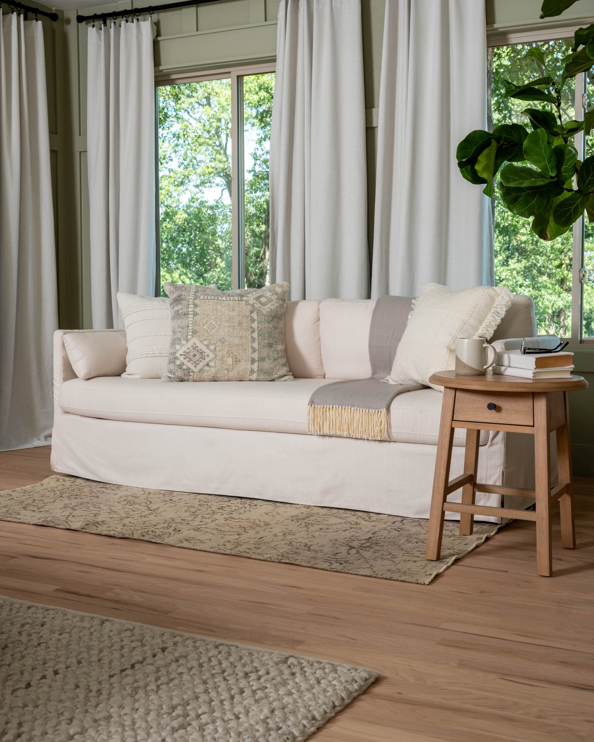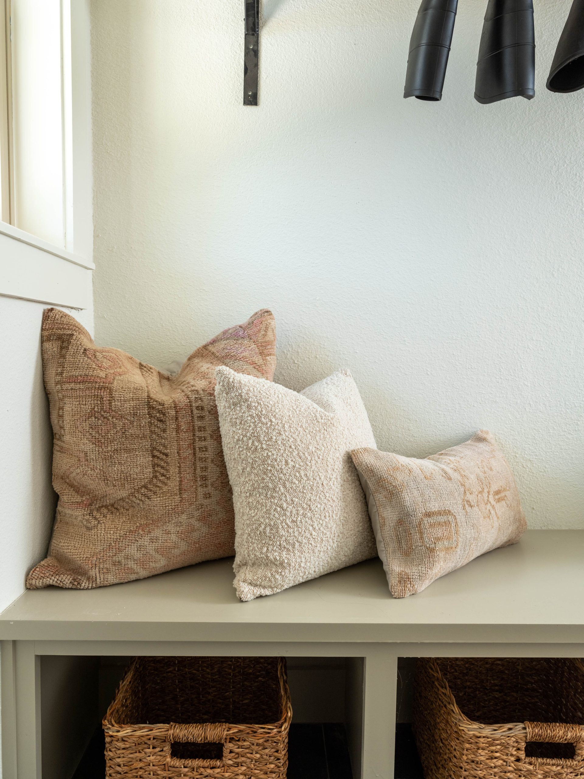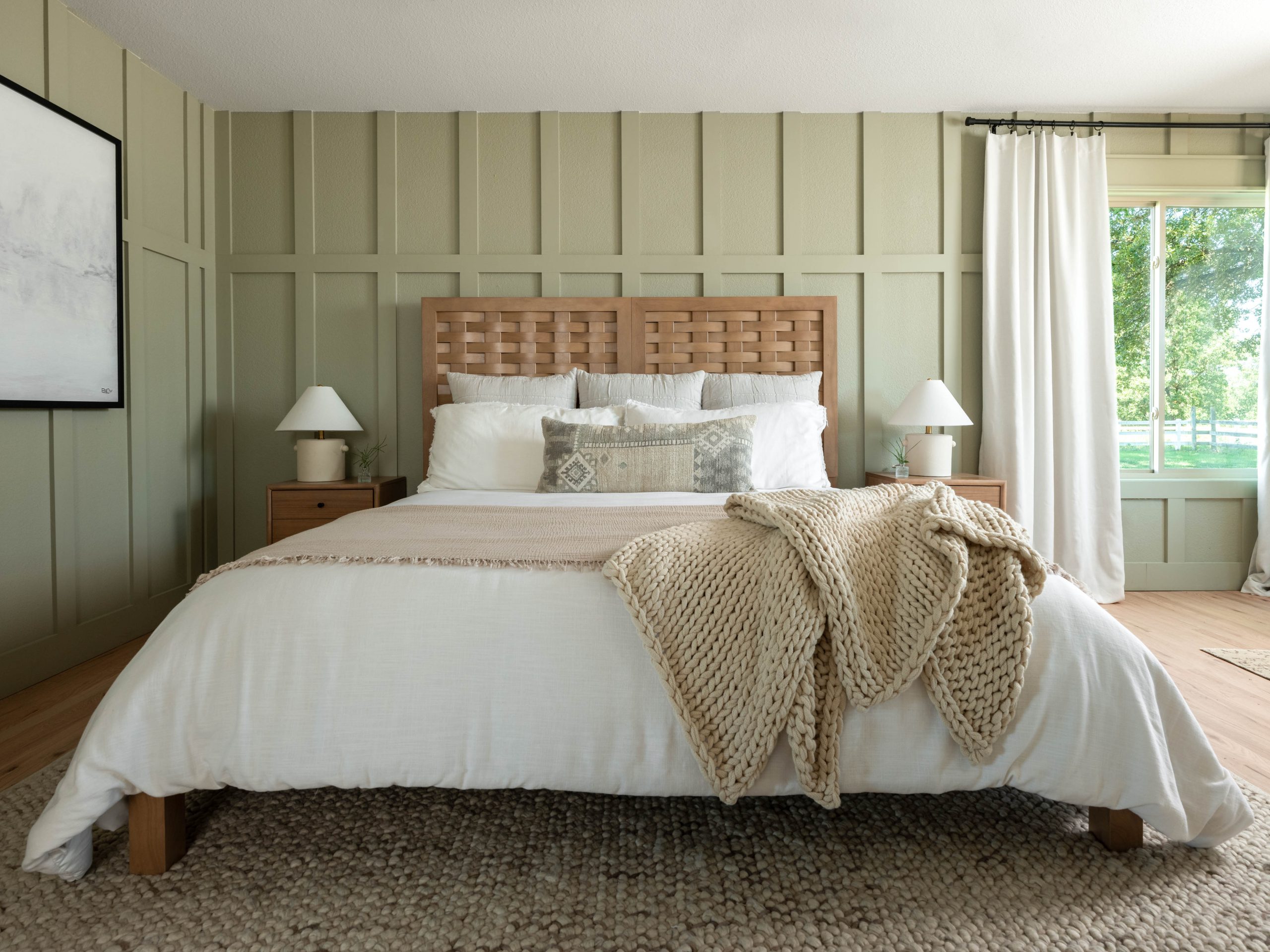 Since this had originally been part of the garage and the old sunroom, this new master bedroom came out so huge! It’s a great challenge to have, but we wanted to cozy it up a bit. We added some board and batten trim to add dimension to the room and painted the walls a soothing green color. Since we had this beautiful large window and view, we wanted to make the most of it. It’s the perfect spot for a sitting area where you can read or just relax. The whole room is decorated with furniture from our new Walmart line: cozy couch, the woven headboard design from The Welcome Inn, nightstands like the ones we have at home and pillows inspired by my love of Turkish textiles.
