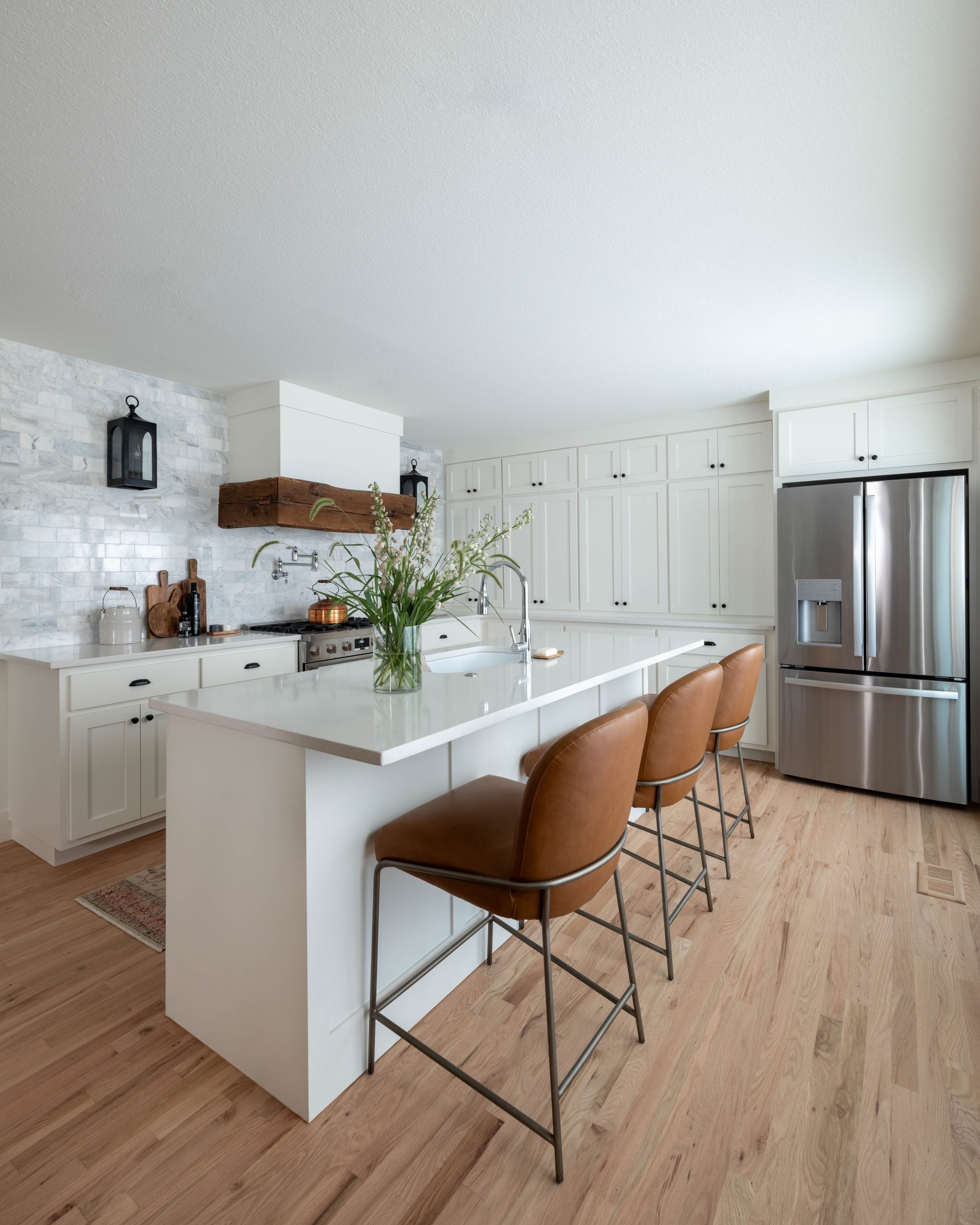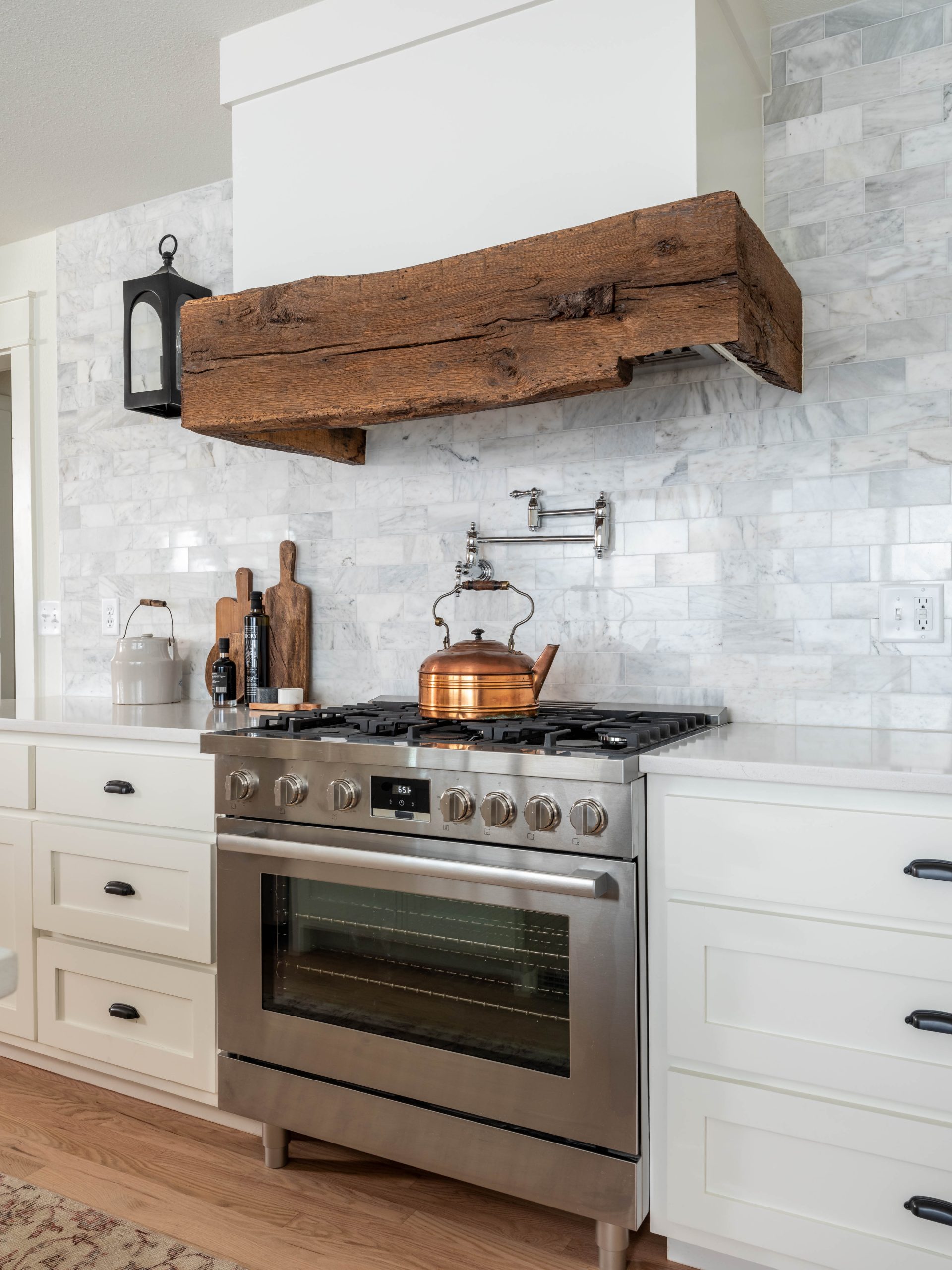This spot had originally been the dining room with a cut through to the old sunroom. We added a wall to close off the sunroom and create an L shape for the new kitchen, and had plenty of room to add a large built-in kitchen island and perimeter cabinetry. Cheree had wanted an all-white kitchen. It came out bright and cheery, especially with the extra touches we made to warm it up and blend in with the farmhouse style of the rest of the house. One of my favorite choices we made for this house is the wooden surrounding the hood. We found this large chunk of wood at the neighbor’s house across the street (who are friends of ours), and it was perfect. I just love the imperfections of the hand-hewn beams.
