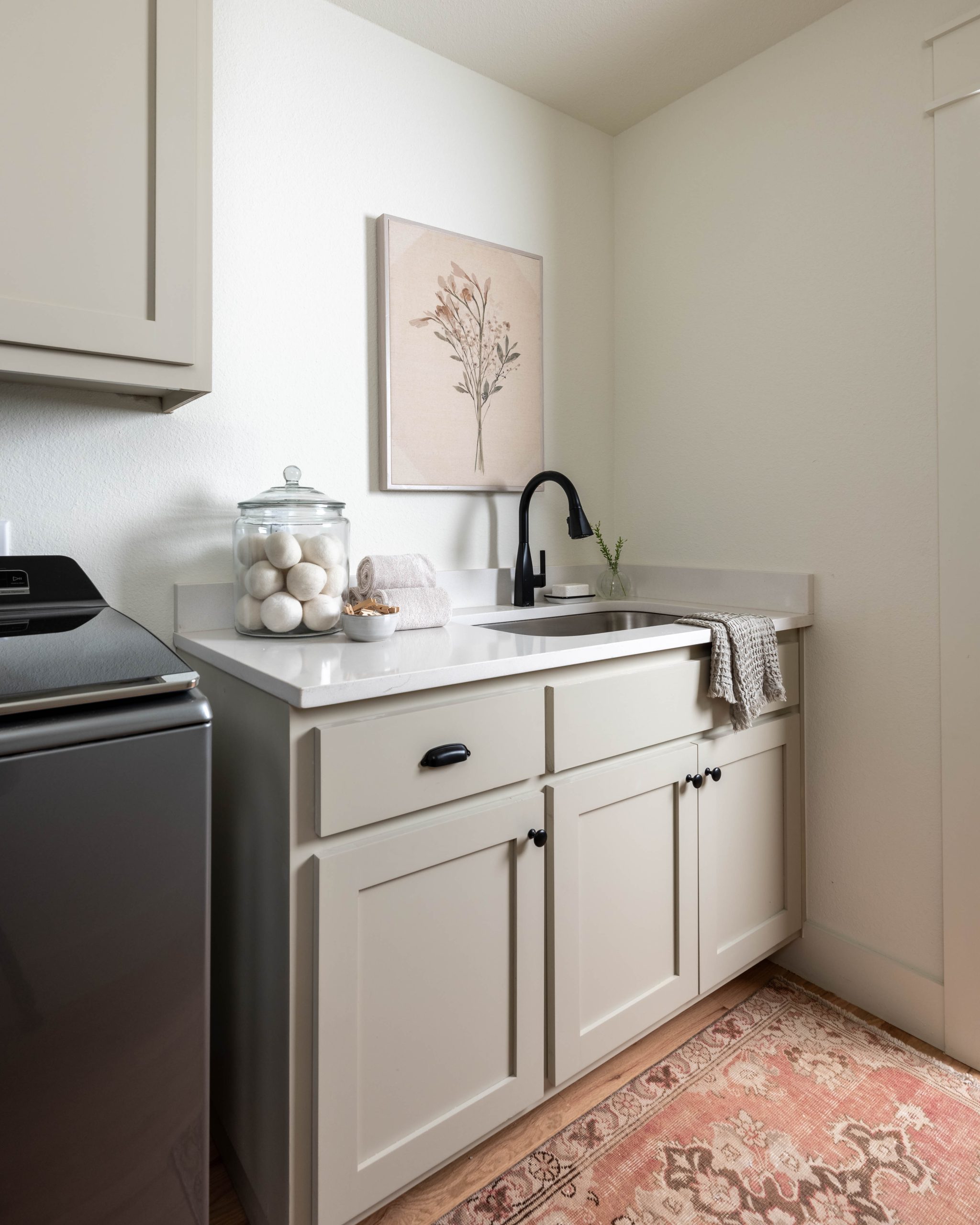Right next to the mudroom is the new laundry room with more room than before. We relocated their washer and dryer here, and added a new utility sink and new cabinets. It’s so much more usable and convenient now. With the updated layout, the laundry room became a new hallway to the new master bedroom.