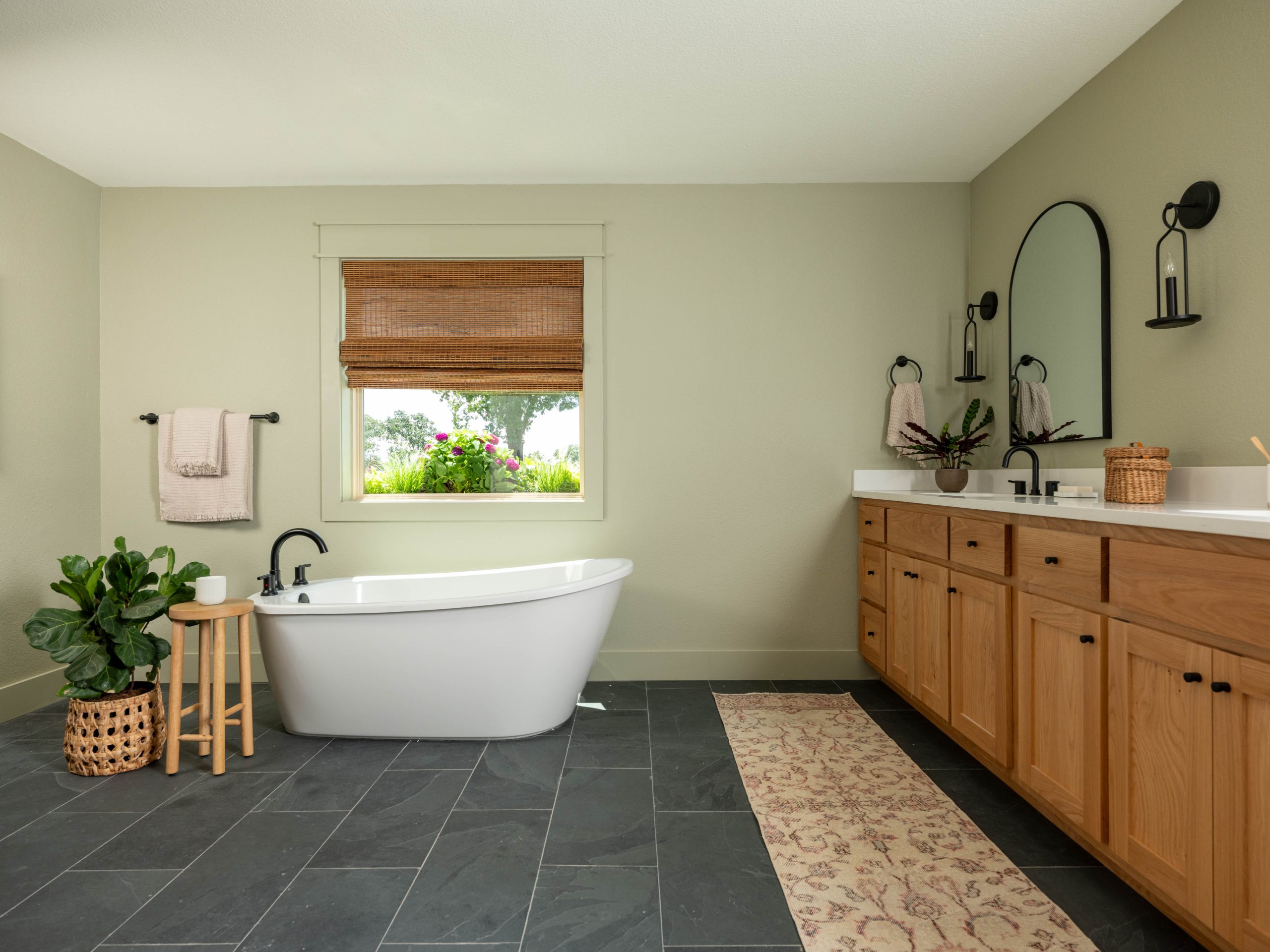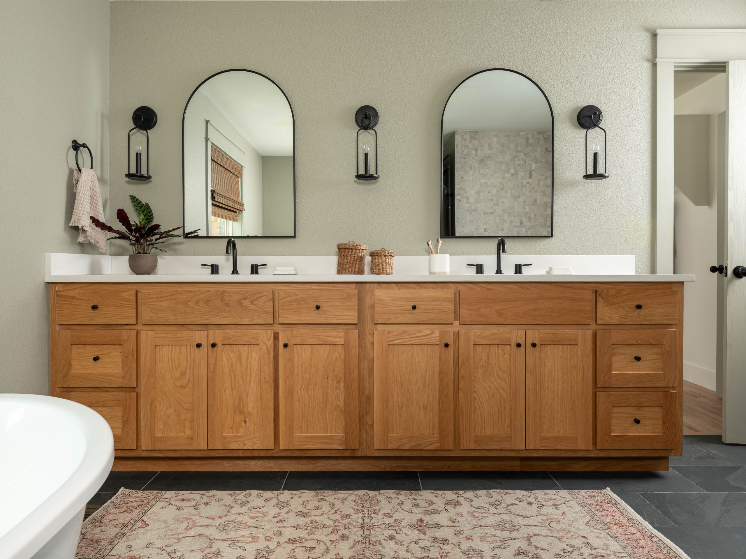 The bathroom, which also came from the space we took from the garage, is equally large. There’s plenty of space for an old-fashioned (yet modern) soaking tub, a stand-up shower (the custom glass didn’t arrive in time for the reveal, we installed it after! But, yes, there is glass!), water closet and a double vanity. The black slate matches the flooring we used for the laundry room and mudroom, and it ties in the modern black hardware, mirrors and light fixtures. To counter the black, we added warm organic touches with the stone flooring in the shower and the natural wood finish on the vanity.