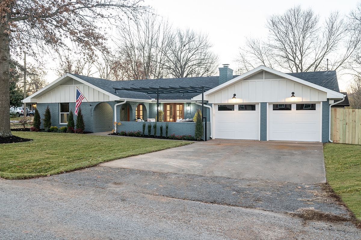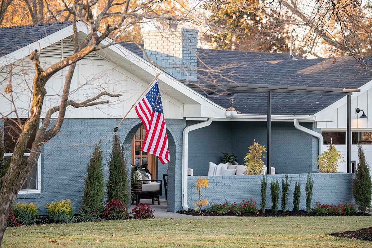 We replaced the roof and installed new, energy-efficient windows throughout the house. To update the home’s appearance from its dreary brown and go along with Cailin’s color preference, we installed new siding, trim detail and painted the brick a warm shade of blue. Newly-installed French doors create a path into the house from the spruced-up courtyard and coordinate with the new front door. I love how the wooden doors add warmth to this exterior. And, we created a new home plaque right at the entryway, establishing their new home as a newly married couple.