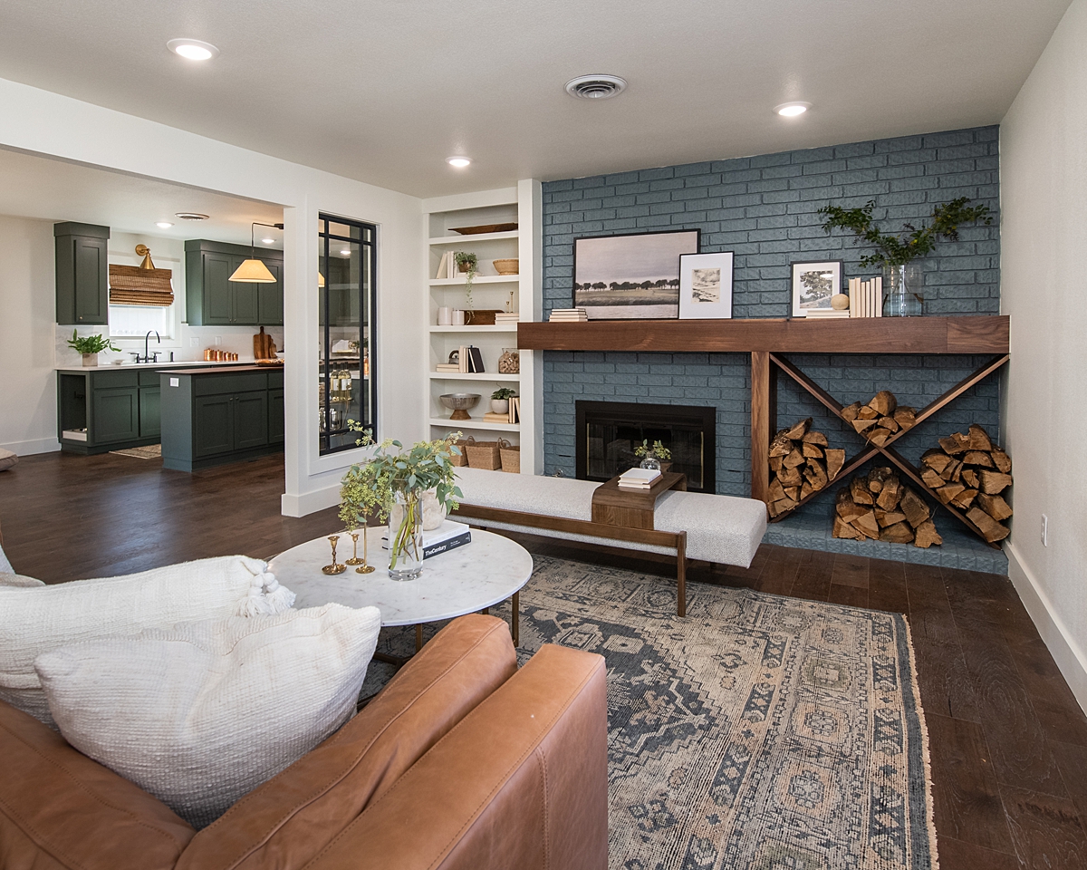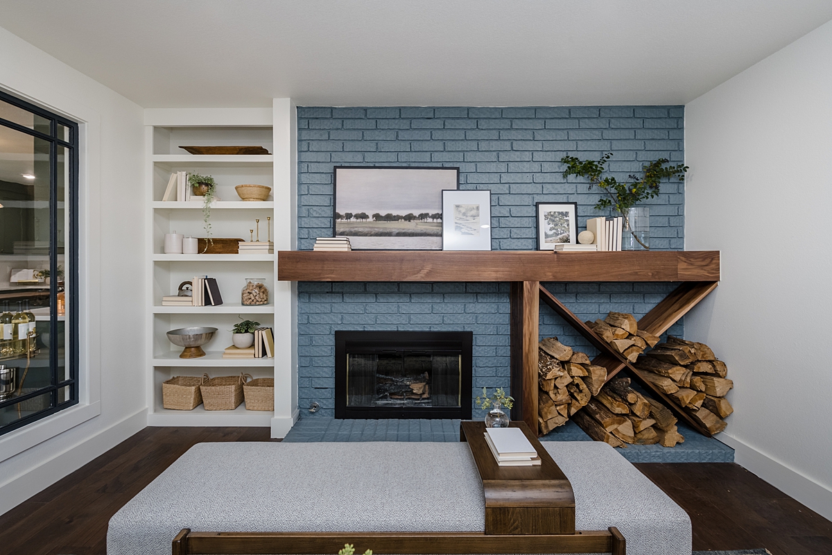 This living area is fairly large and has an interesting fireplace as a focal point. Cailin first requested a higher quality flooring to protect against scratches from their dog and we chose a durable, engineered hardwood to install throughout the home that adds dark richness and consistency to all the rooms.