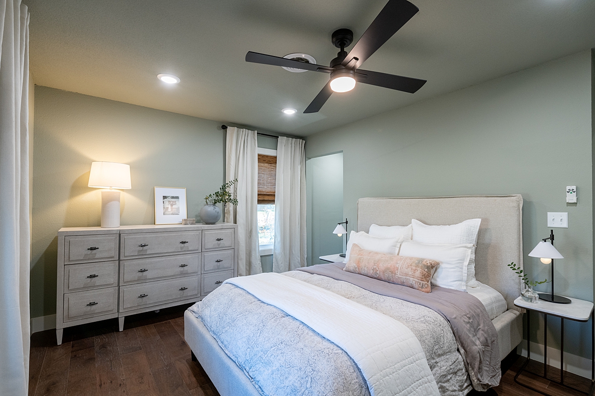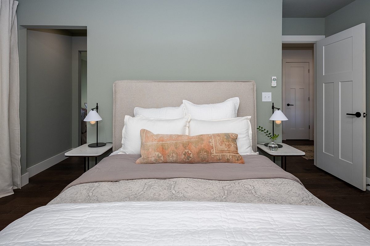 We also had quite the space to work with as we made changes to the main bedroom and bathroom. The rich flooring carried over from the rest of the house added warmth and worked well with the light, relaxing green shade I chose for the walls.