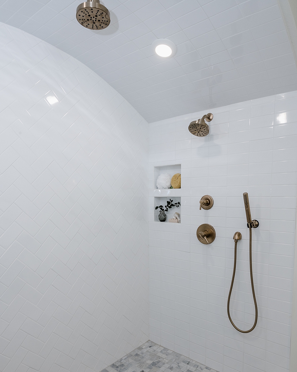 Alex and Cailin asked for an updated bathroom and a double vanity. We took advantage of the spacious bathroom and gave the Goodyears a giant walk-in shower with a barrel ceiling to play off the arches in the front of the home. We added a feature wall in a herringbone pattern and installed marble squares on the shower floor for contrast.
