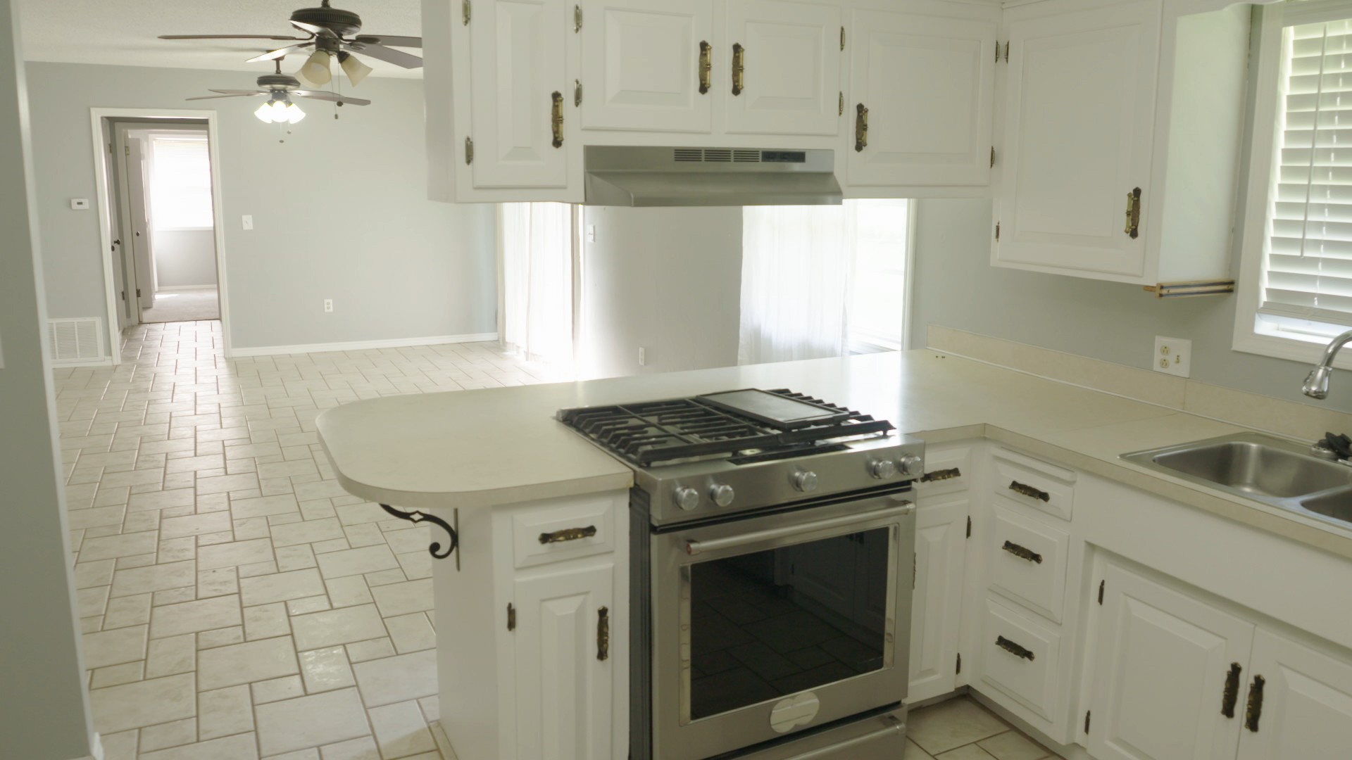 I love it when we can create much-needed space during our renovations! By moving another wall between the kitchen and a small room, we were able to scoot the kitchen down to the dining space, which allowed for a whole new layout and a long island with a beautiful dark walnut top. The dining area still had plenty of room for a table with space to spare.