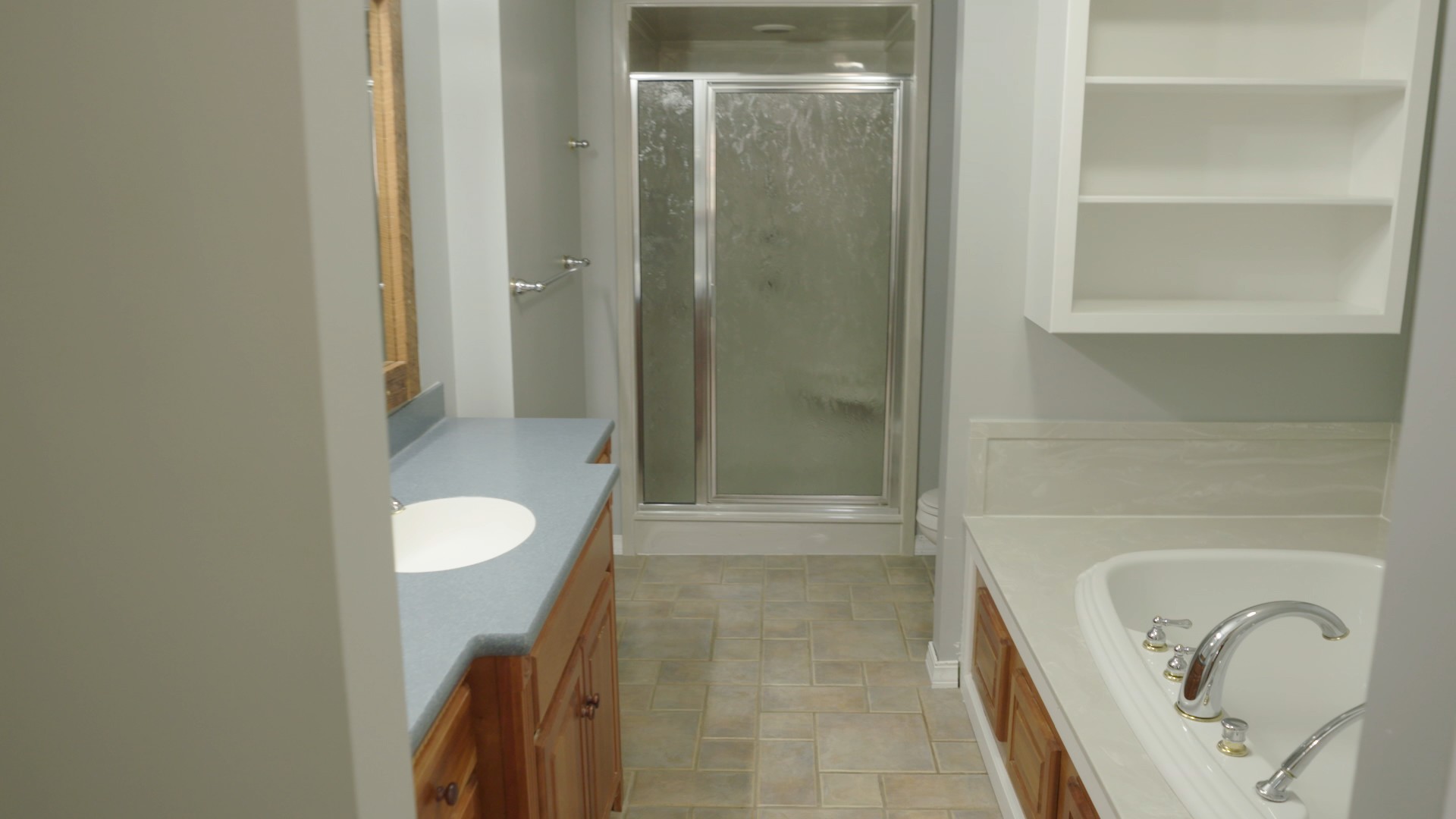 We did more reconfiguring in the main bathroom, modernizing and adding elements to take as much advantage as possible of the space in this part of the house. A new layout here accommodated a large double shower, the double vanity, a quartz countertop, and a new linen closet. The arch design over the shower and brass fixtures became the special character elements for this big bathroom retreat!