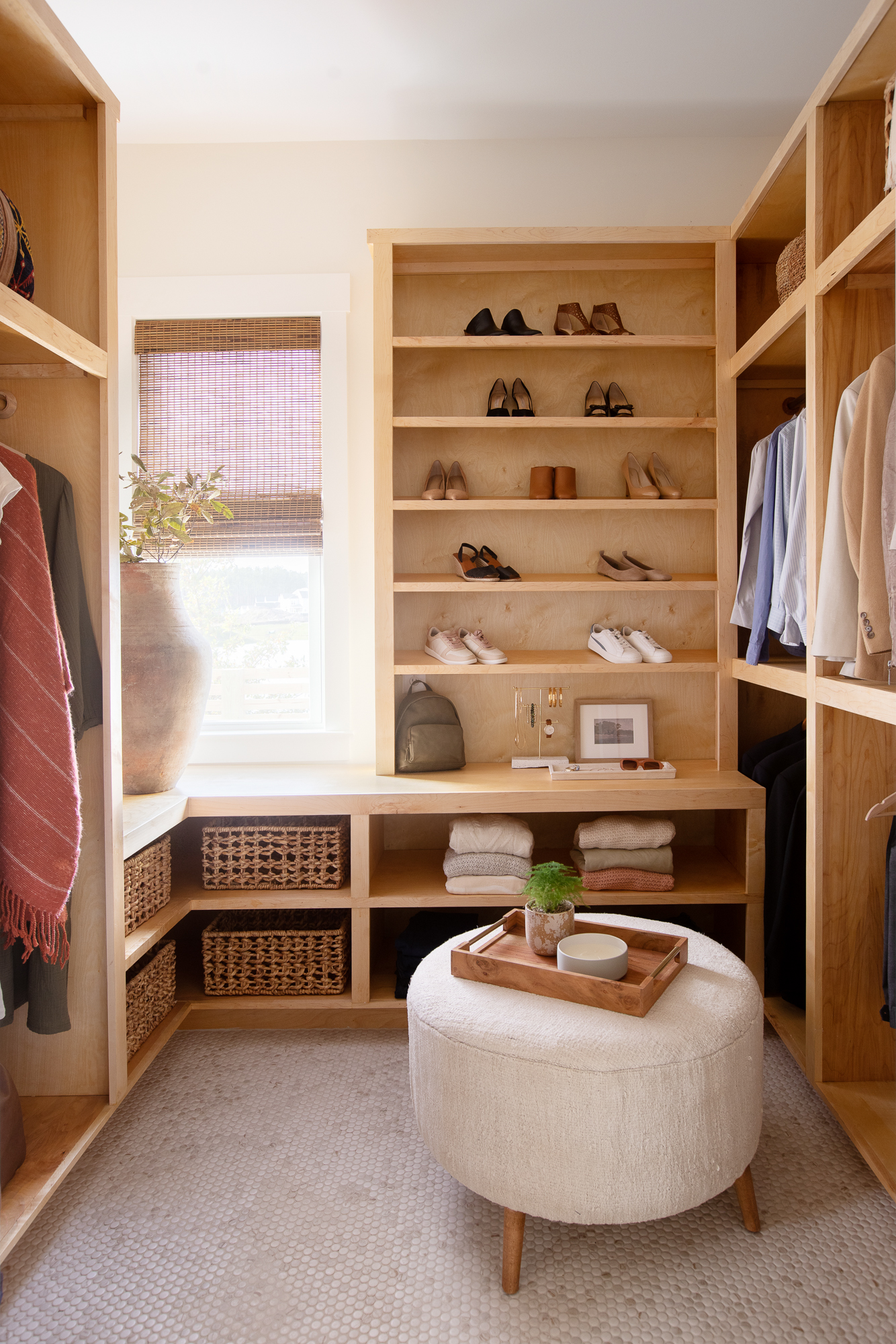 Of course, the closet was a point of contention but we love how sophisticated the space is thanks to the custom build by Dave. I think the gorgeous, custom cabinetry and natural light in this space feel both luxurious and practical. We live in an old home with limited closet space so we took a risk here and went with what works for us: less stuff but ample storage. (And, don’t worry, there is a door to the closet/bath hall).