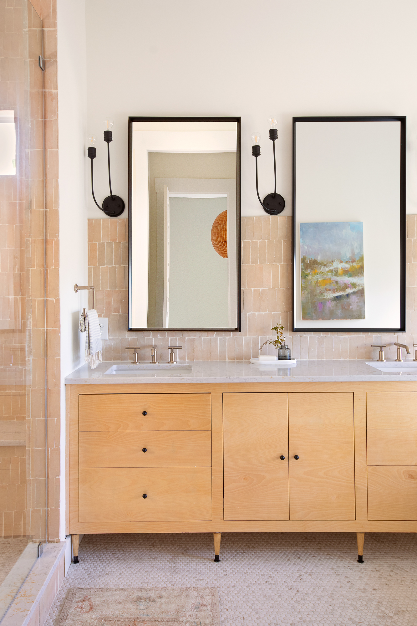 The main bath has more personal touches with the custom built vanity and hand thrown tile. I love how it feels like stepping into a high end spa. I’ve personally always wanted a dry sauna because of the health and relaxation benefits so this little luxury felt like the perfect addition to the main bath. When we were presented with the “Ty Challenge” and had the option for sea glass, we knew exactly how we would use it. Dave built the entire dry sauna, including the gorgeous door, and we made a custom sea glass window that shines the most gorgeous light into the space. It is truly unique and one-of-a-kind.