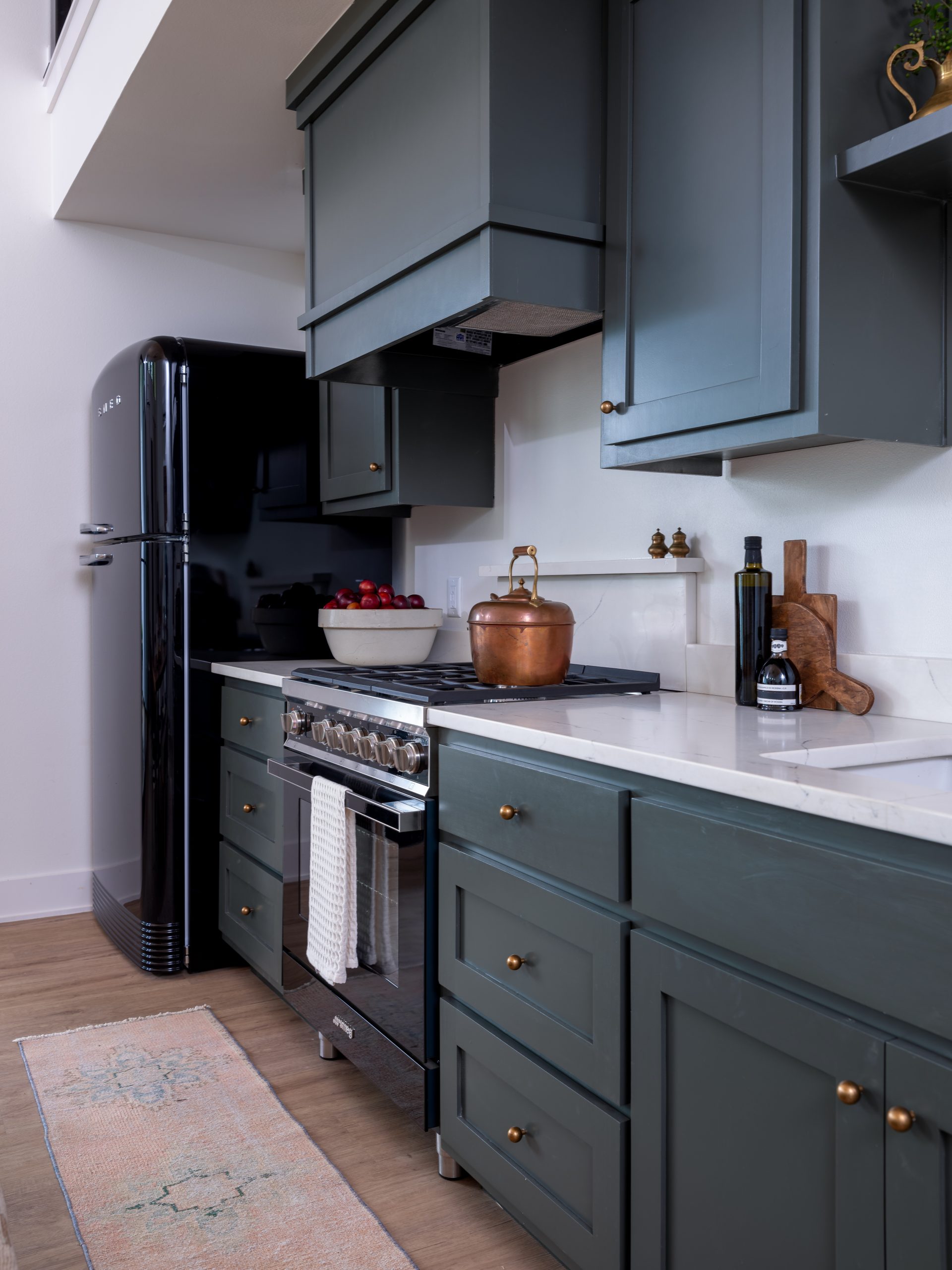Gray and Gabby really wanted an open, full kitchen. With the small amount of space we had, it was a bit of a challenge to find a way to include all the appliances and cabinets needed, plus a full-sized dining table that could host their large, close family. We had to be smart about maximizing the space. For the cabinet color, we went with a dark green color which looks sleek and modern against the black appliances. We didn’t have room for an island, so Dave built a large, custom dining table instead and inscribed one of her song lyrics into the wood.