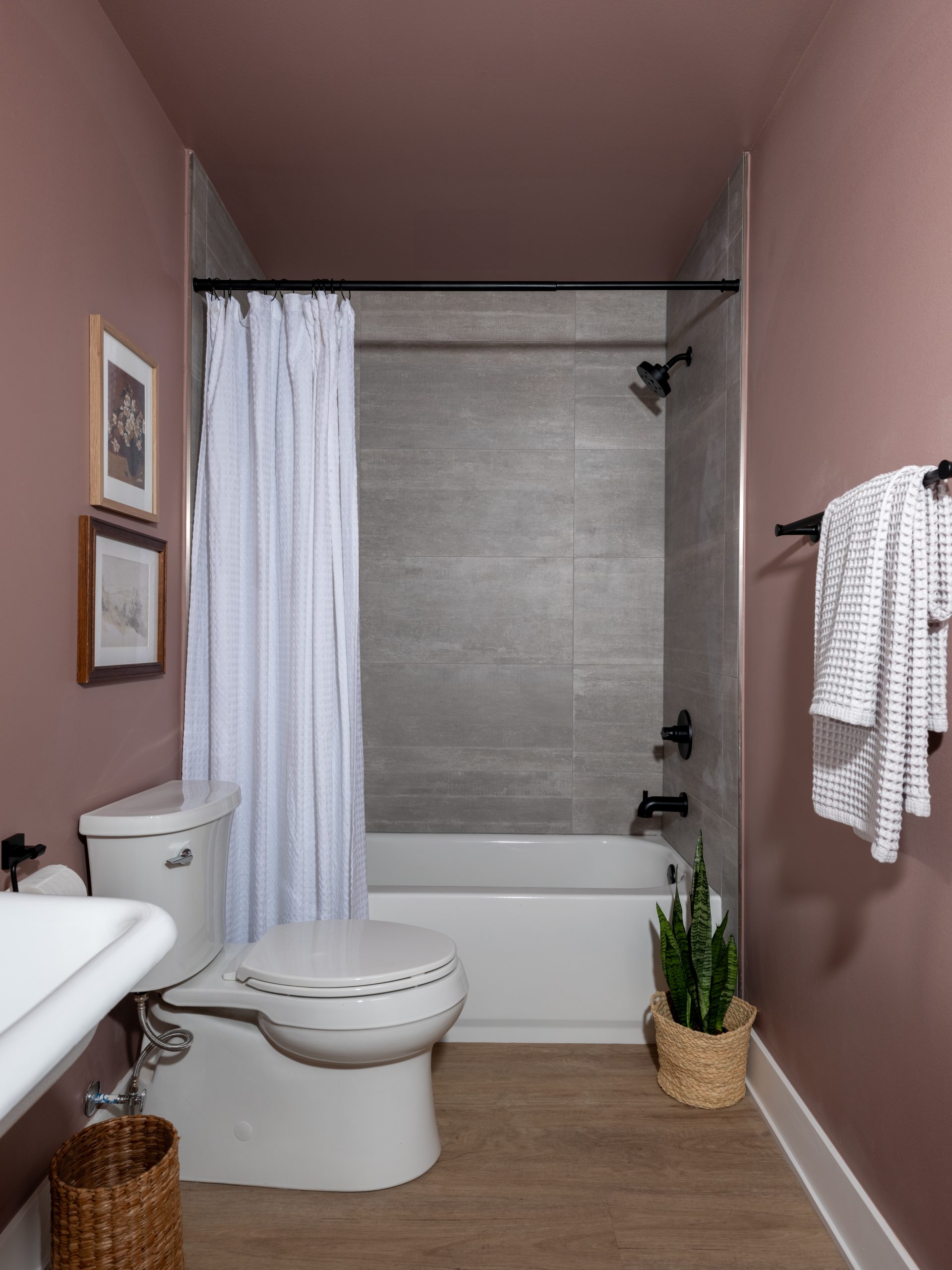 Since the barn was previously a large open space, we needed to build a dividing wall to separate the living room and kitchen from the bathroom and gym. The new bathroom is on the other side of the kitchen wall. Before we got started on the project, I had gone through the barn and found this old trough-style sink. It was pretty gross, but we were able to get it resurfaced and it adds so much character and is original to the barn. We built a full bathroom, complete with a shower. The fun pink color is a joyful touch that radiates Gabby and Graylan’s happy personalities.