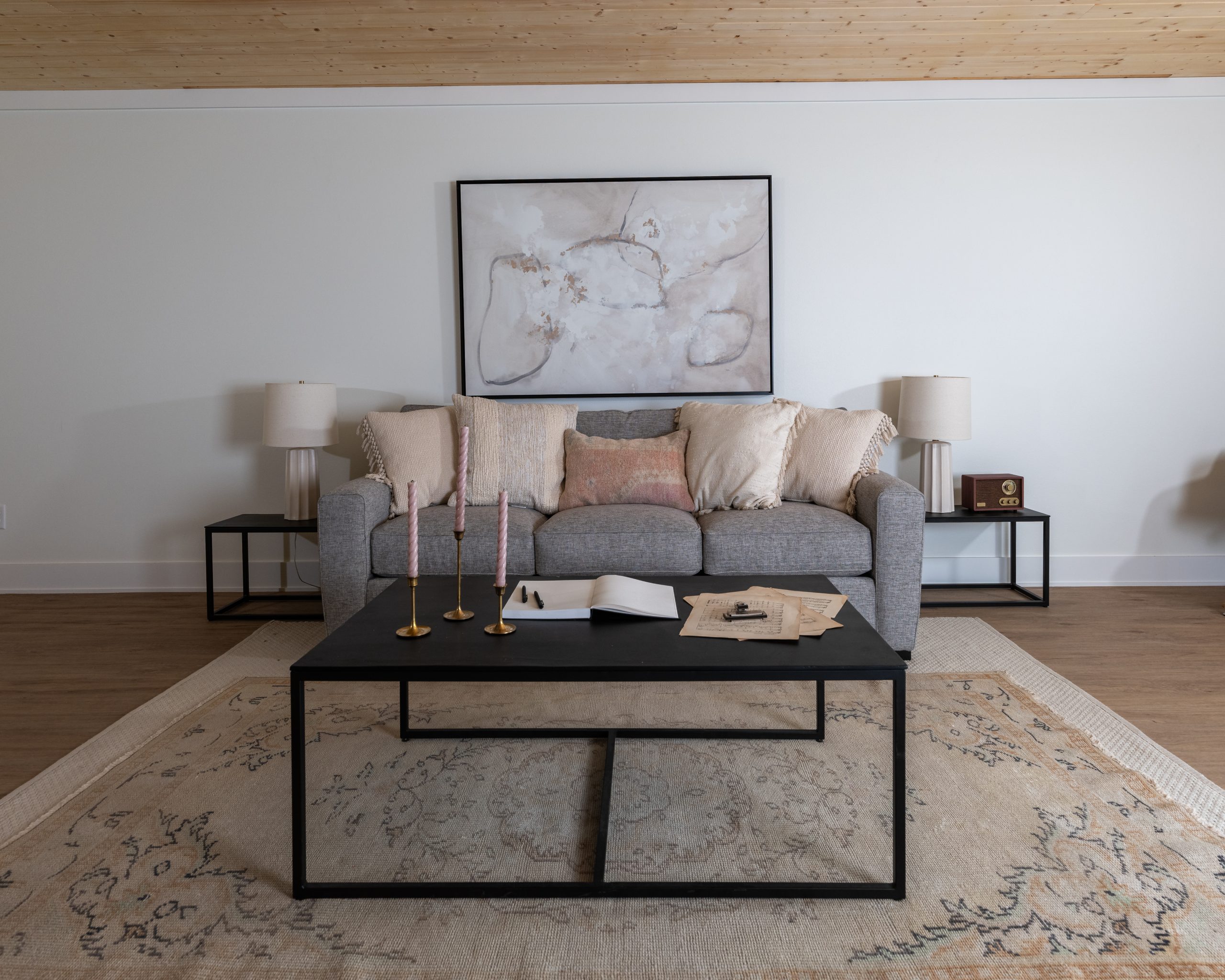 Before the remodel, the inside of the barn was used as storage space. Now, when you walk in the front door, you enter a modern, yet cozy living room with plenty of seating for guests. The barn’s high ceilings needed some detail, so we added wood paneling to honor the barn. The wood detail, fabric window treatments and the different textures of the rug and cushions all soften the space and make it cozy. For a special touch, Dave built a guitar stand to meet the mood and intentions of the space. Gabby can now hang her guitars and showcase them in a way that adds her signature to the room.