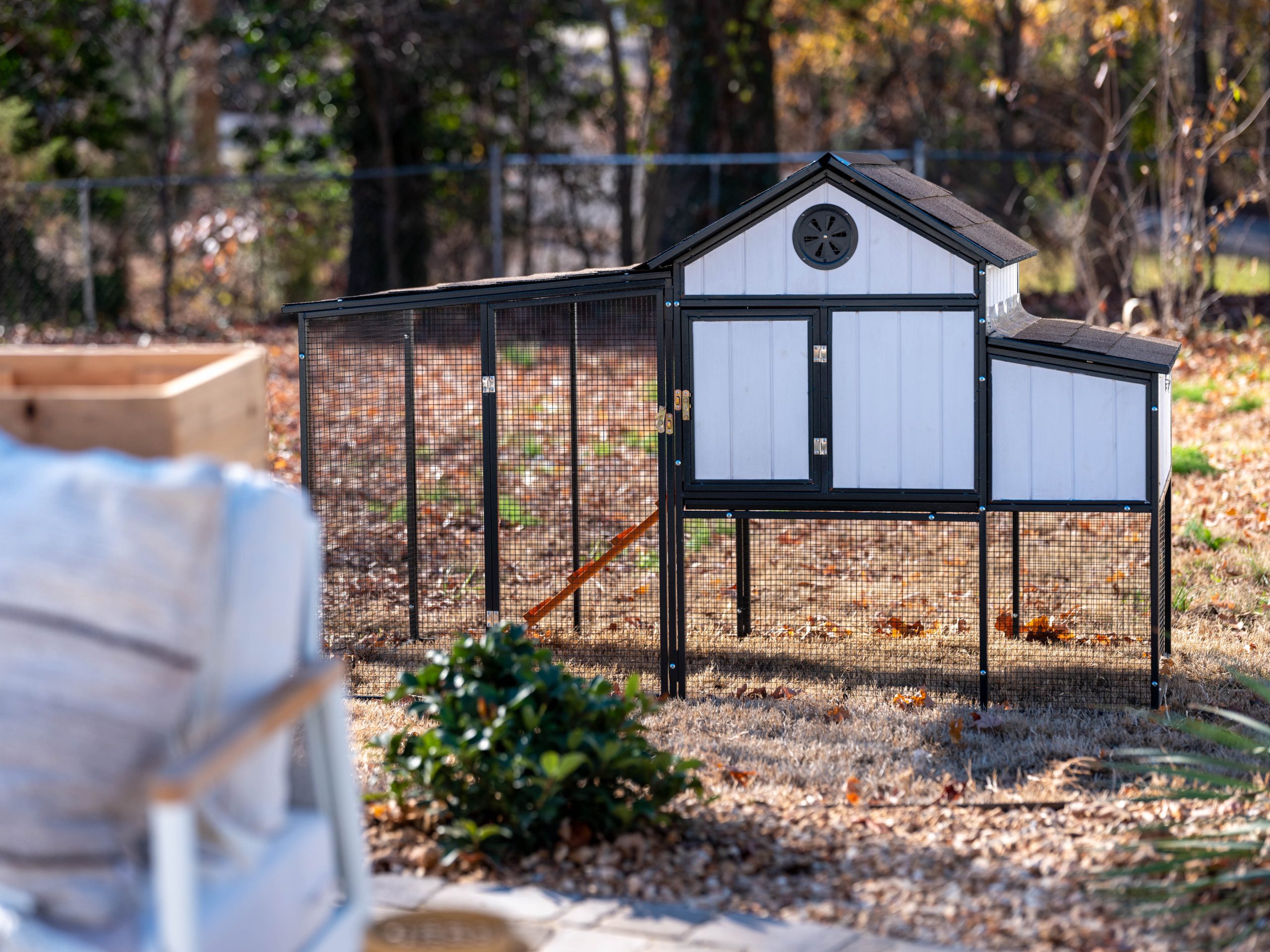 Did you notice Dave light up when he heard Denise wanted a chicken coop? He picked up a standard chicken coop at the store and then spruced it to make it match the house. I’m still holding out hope for a chicken that will actually ride around on a mini bicycle!