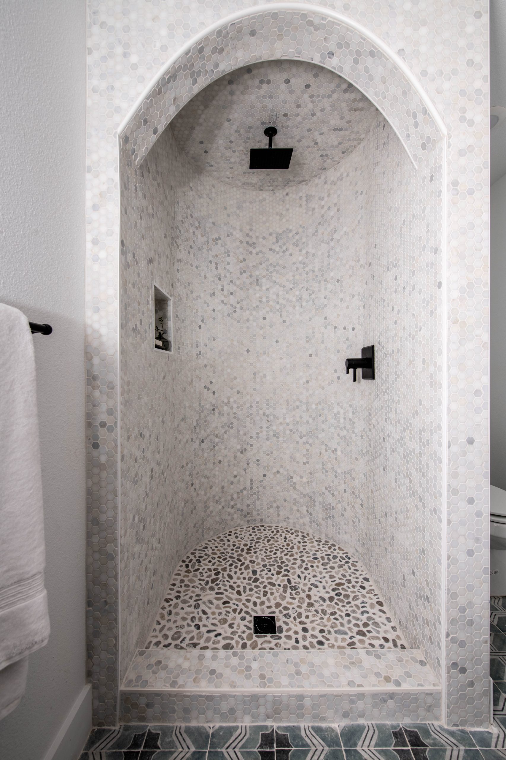 Since there was a second bathroom available near the main bedroom, we were able to attach it to the main bedroom and turn it into a master suite. Pepe and Denise wanted to get rid of the bathtub, so that gave us some extra space to reconfigure the layout for a large walk-in shower, double vanity and better closet space. We wanted to have a little fun with the bathroom and bring in a Peruvian feel with the tile choice. The blue accent colors go beautifully with the arched shower wall, reminiscent of dome shapes you see in Peruvian homes. The pebble floor tile in the shower feels very natural, while the marble hexagon tile on the shower wall looks amazing.