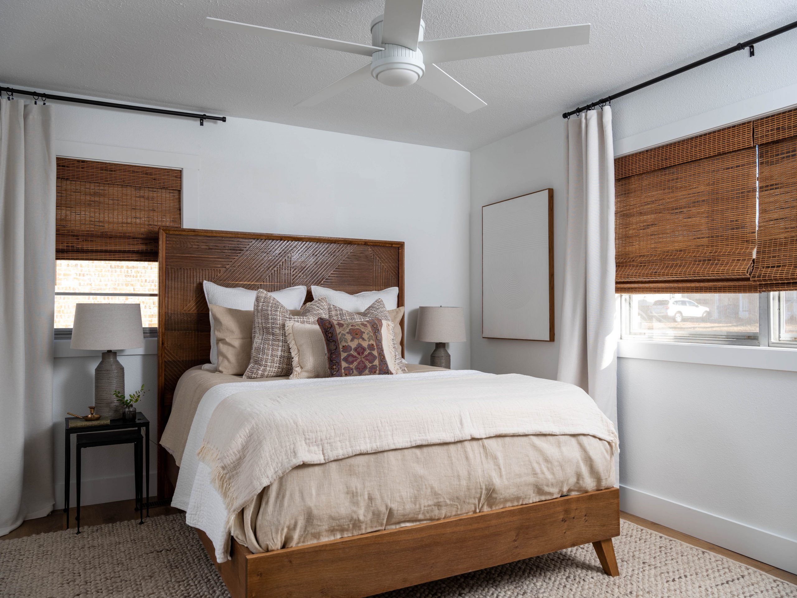 For the bedroom area, we kept it serene and peaceful with a calm paint color and we brought in some texture with woven shades and the bedding. We also added new flooring and new lighting.