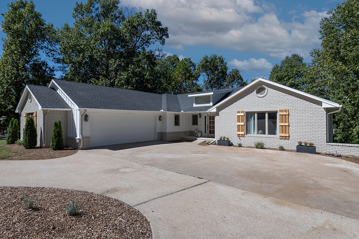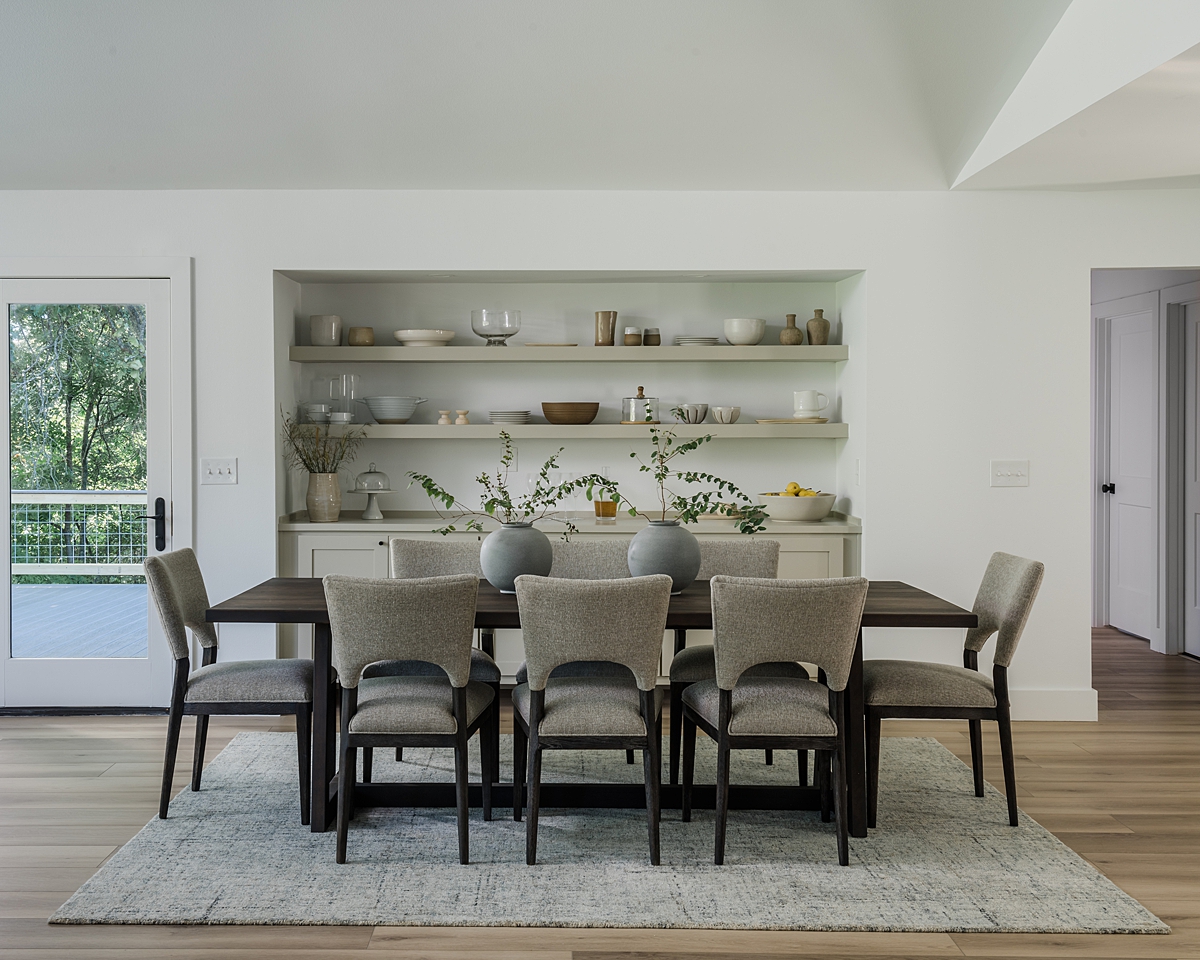 This room already had three big windows on one wall, showing off the natural light we love to bring in to homes as well as the beautiful view that made Todd and Trisha fall in the love with the property. For balance, and to make sense with the new design, we installed a fourth window. We also removed the existing fireplace to make way for a large built-in on in the new dining area.