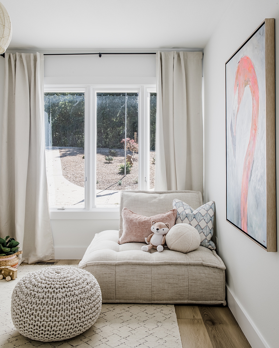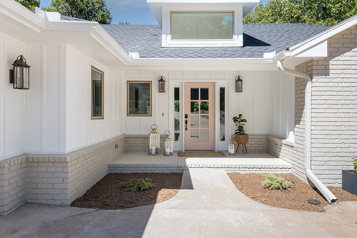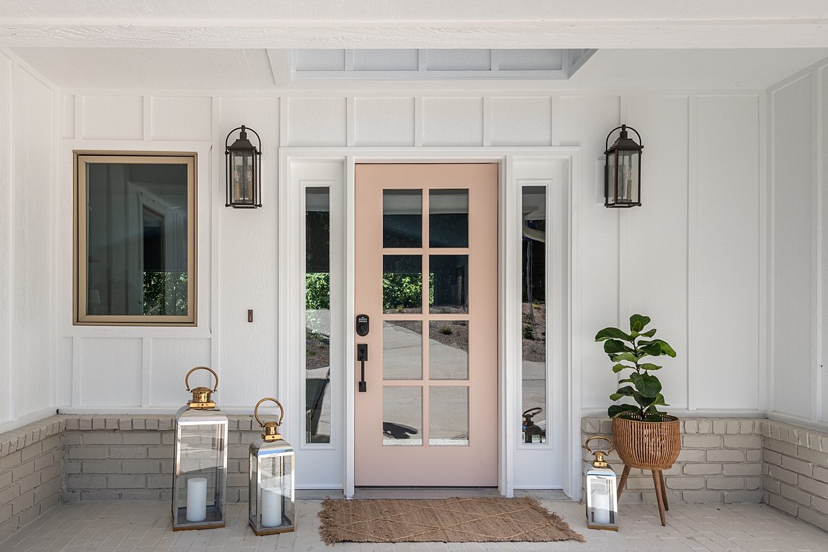 The outside of this house really needed to be spruced up. To change its boring and monochromatic appearance, we painted the existing brick a pewter color. Handmade cedar shutters around the windows contrast with the painted brick. Those, along with a pale pink front door give a pop of subtle color against a neutral background. (More to come about the Lemery’s love for pink!)