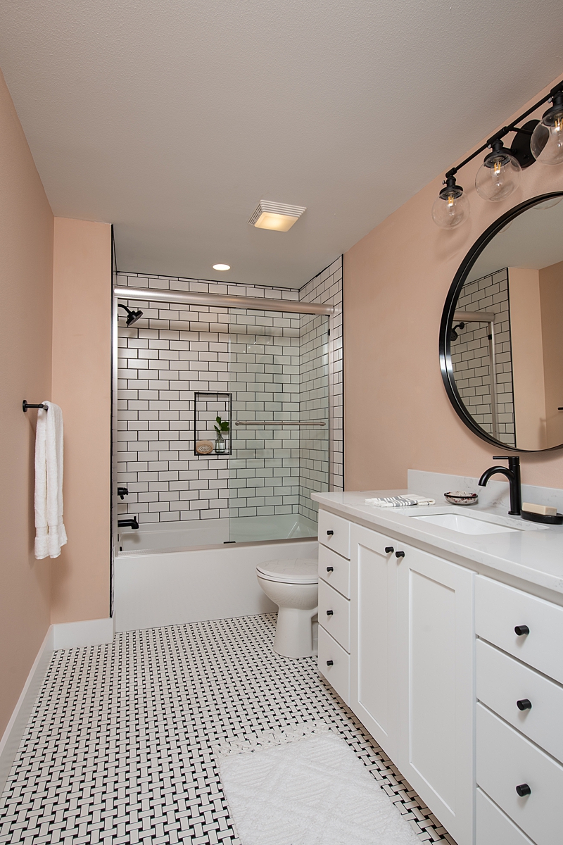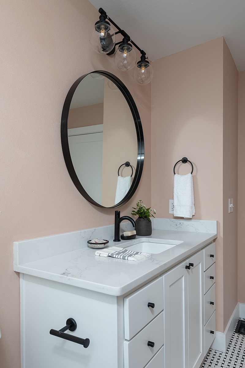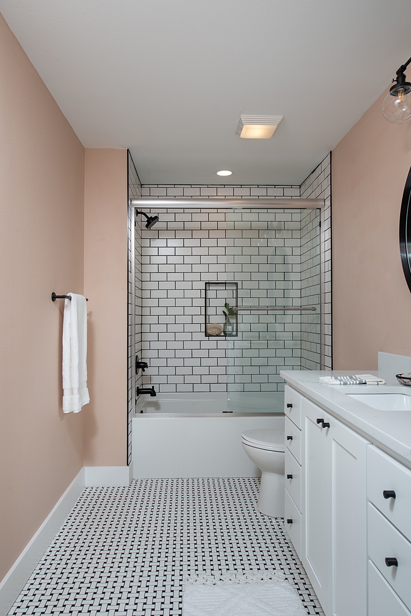 This bedroom needed a wide doorway to accommodate the Lemery’s granddaughter and her wheelchair and walker. Opening up the space wide created an easily accessible entry from the hallway. We also gave the bathroom a refresher with new tile, accents of pink, and a new tub/shower combo.