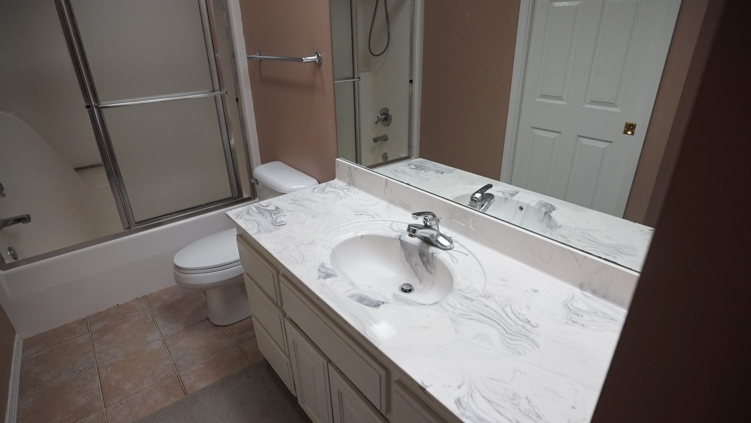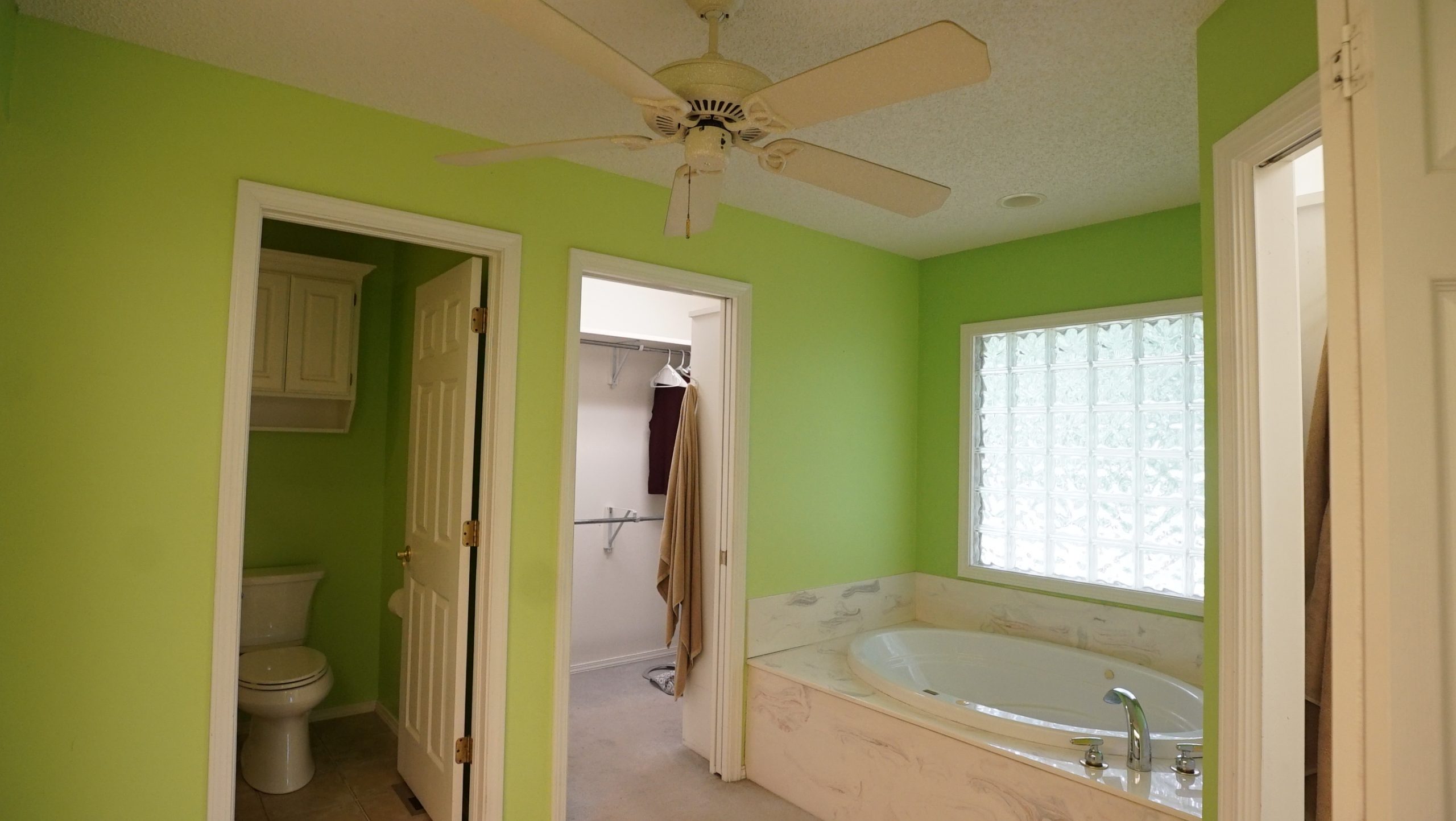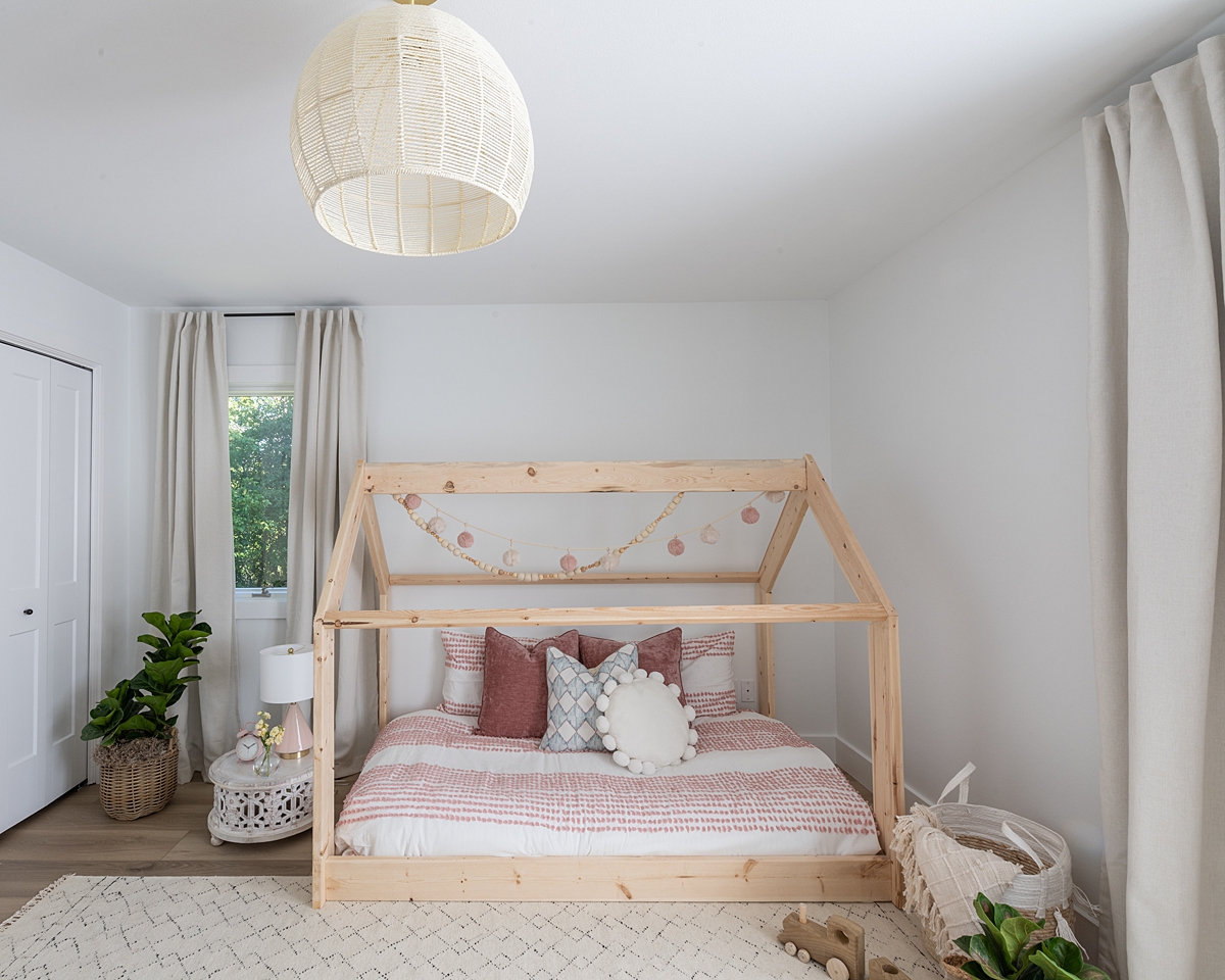 This bedroom needed a wide doorway to accommodate the Lemery’s granddaughter and her wheelchair and walker. Opening up the space wide created an easily accessible entry from the hallway. We also gave the bathroom a refresher with new tile, accents of pink, and a new tub/shower combo.