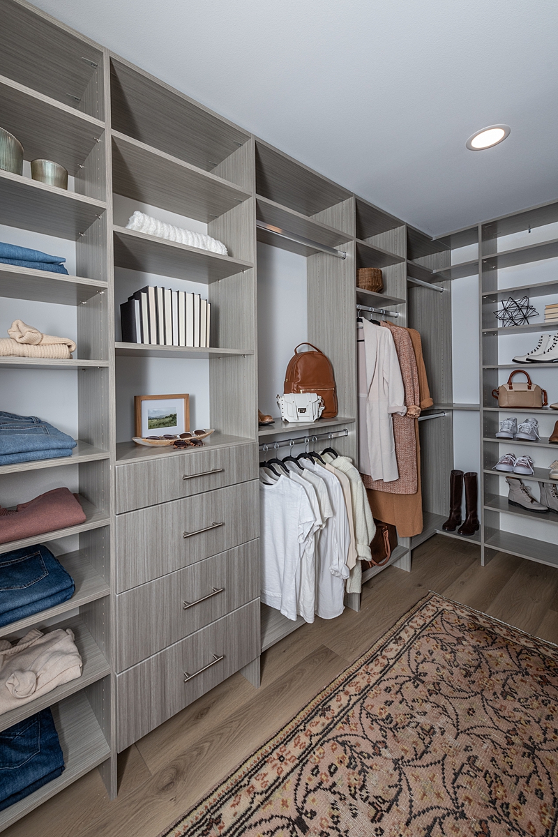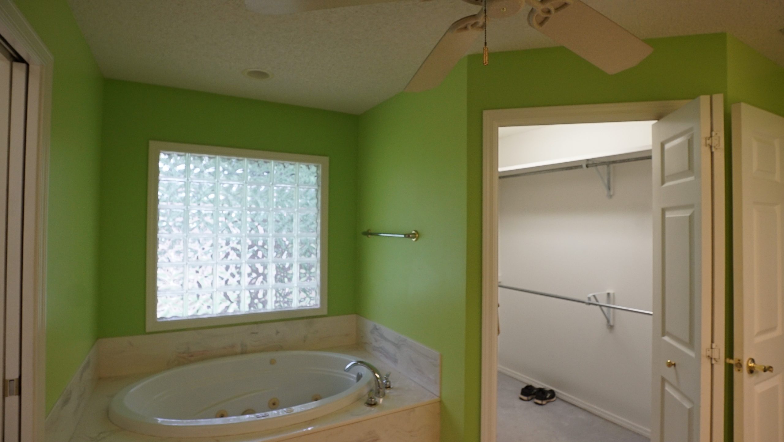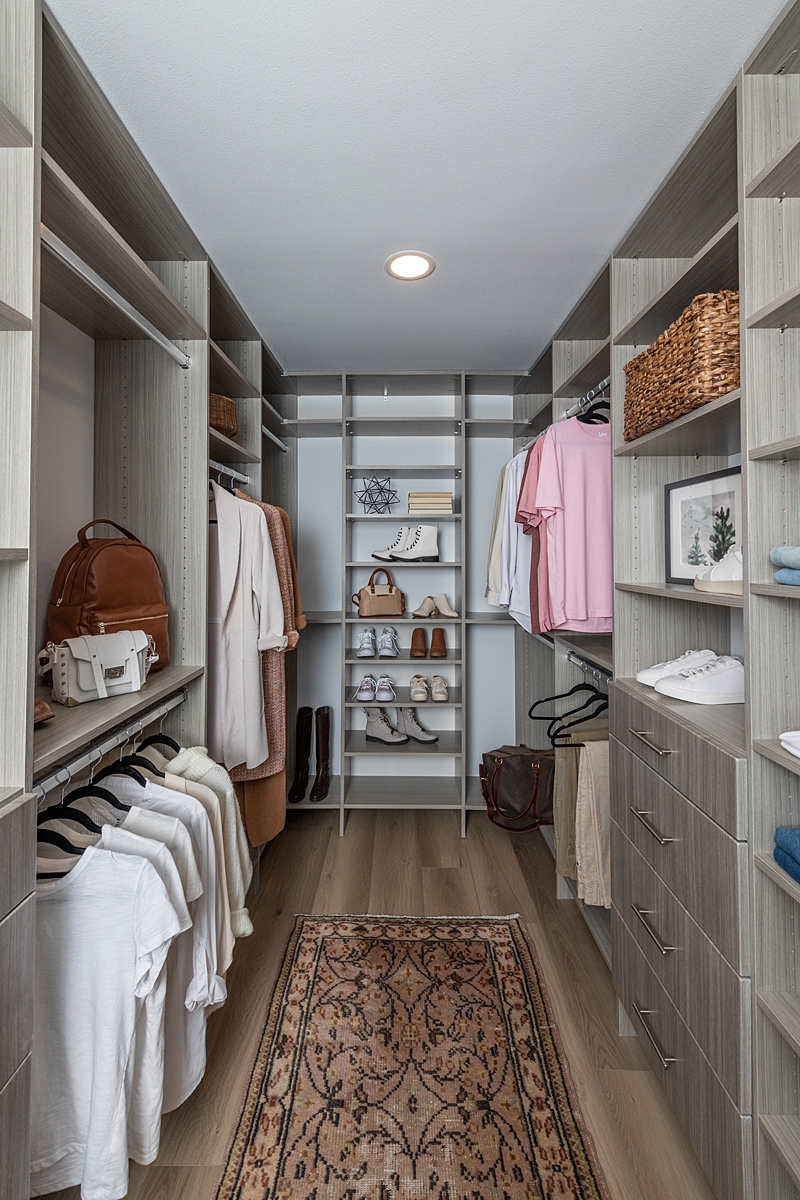 We did a full closet installation with custom shelves and created a new double vanity sink. The deep bathtub will give the Lemerys a place to relax and unwind, and a clear shower door ensures that the pink tile remains the focal point in this totally remodeled bathroom.