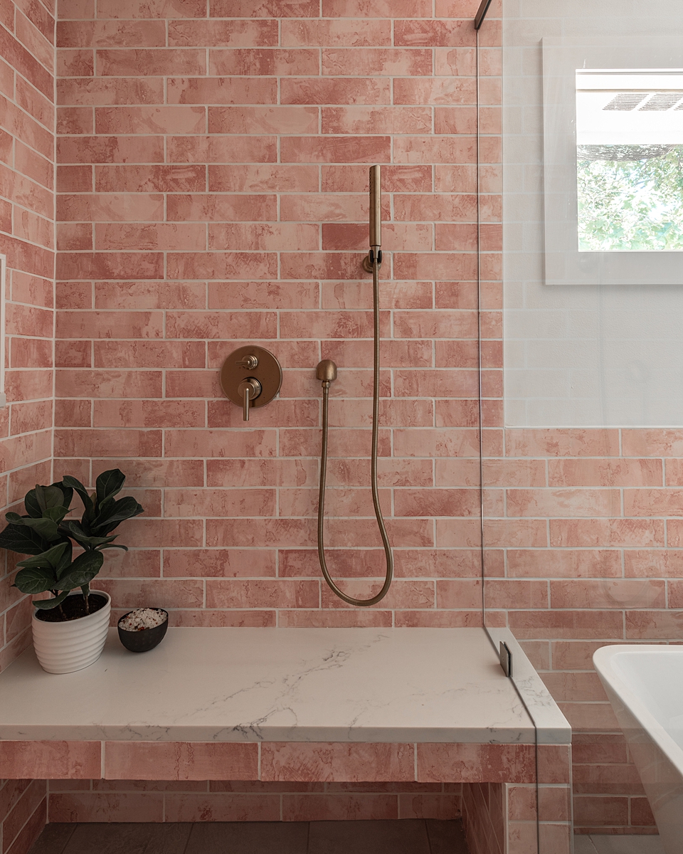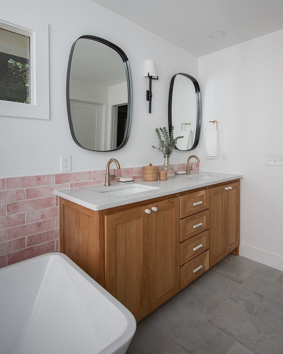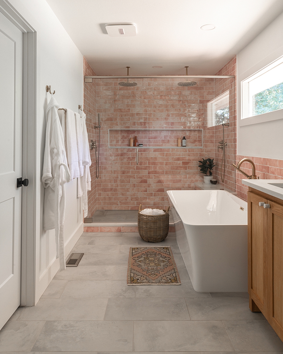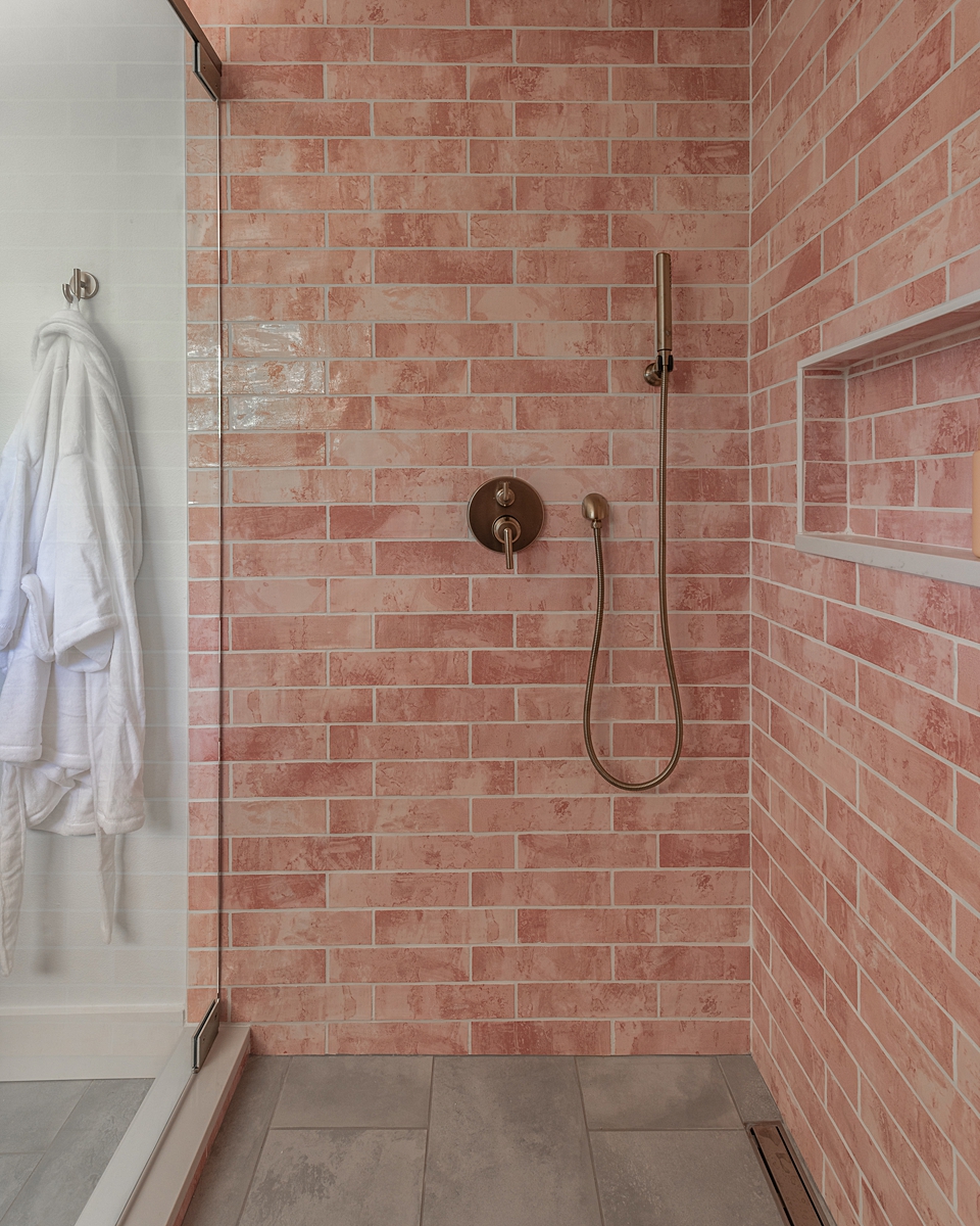 Trisha loves pink, and Todd went right along with her request for that to be the accent color in their bathroom. Just the right shades gave a unique, contrasting style to the concrete floor and other rustic details, and I found pale pink tile both fun and fitting for this home’s sophisticated aesthetic look.